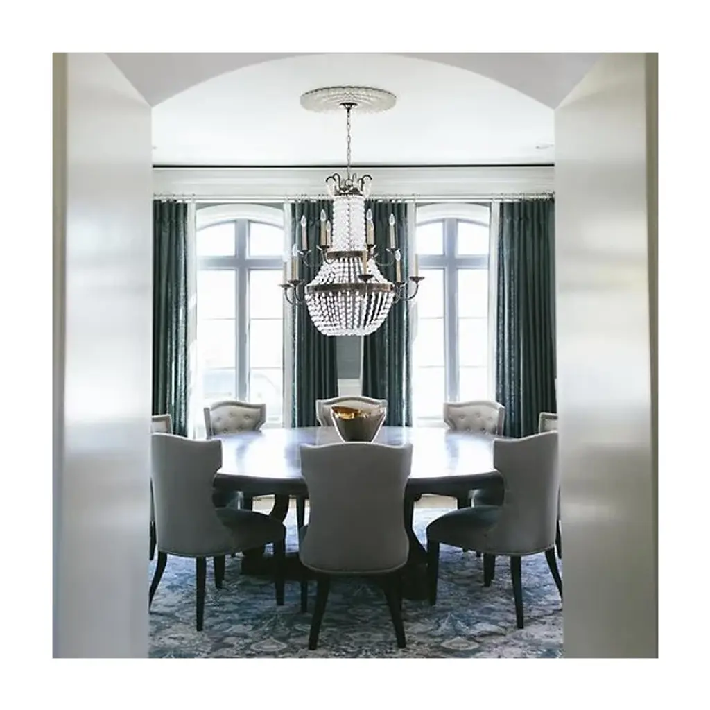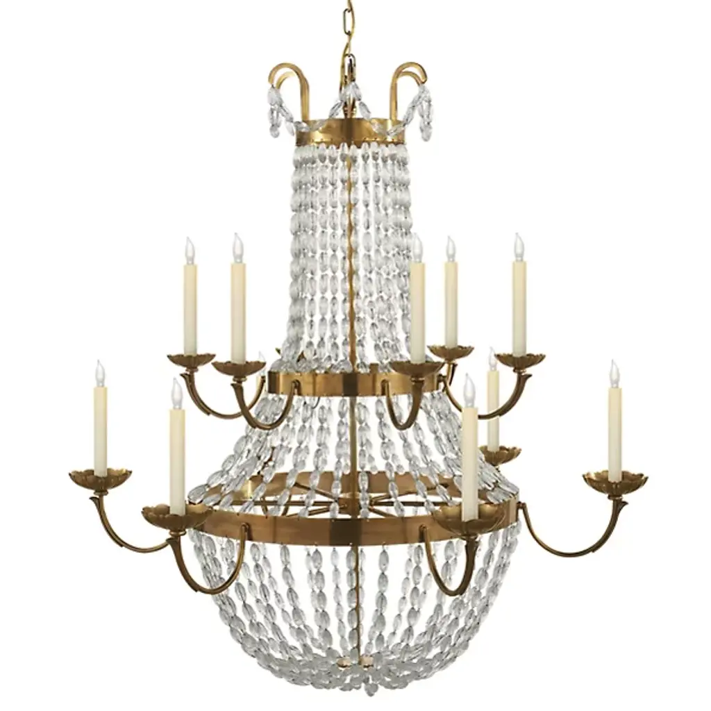 Pay homage to Art Deco style with a Paris Flea Market 2-Tier Chandelier by Visual Comfort Signature, formerly known as Visual Comfort, Strung with seeded glass beads, it evokes 1920s France and brings sparkle to traditional living spaces and dining rooms. This grand ceiling fixture has simple candelabra arms with scalloped bobeches in a vintage-inspired metal finish for a lighting option that adds panache to your home.
