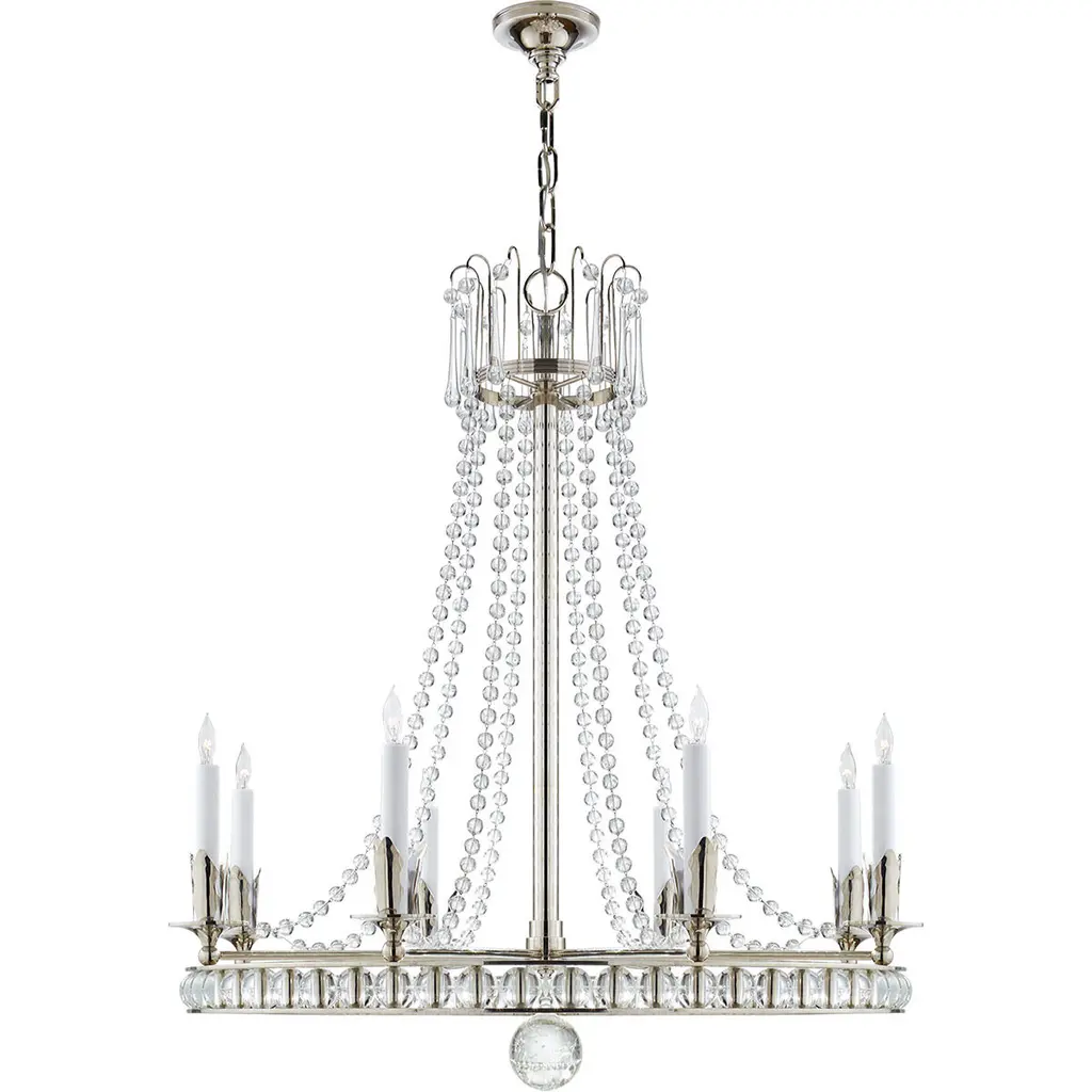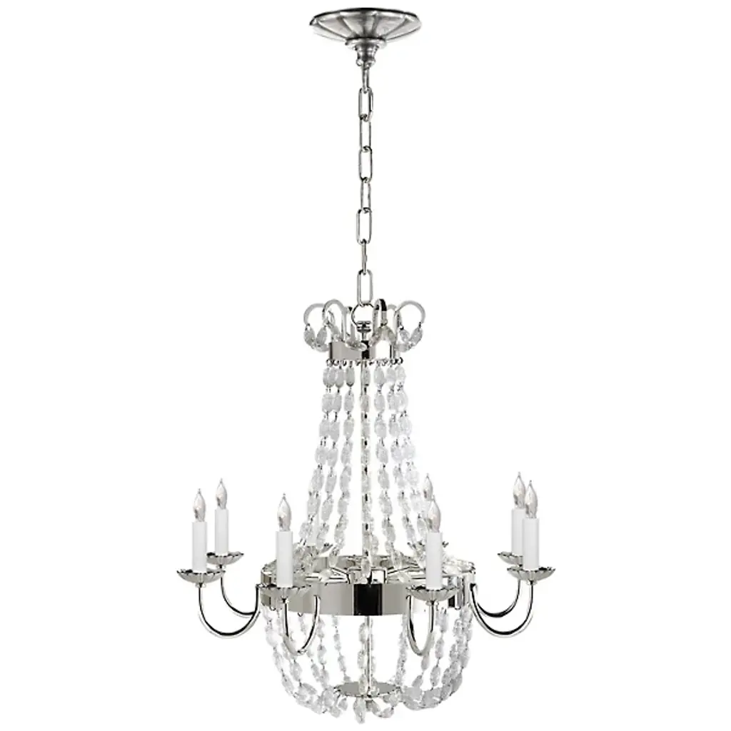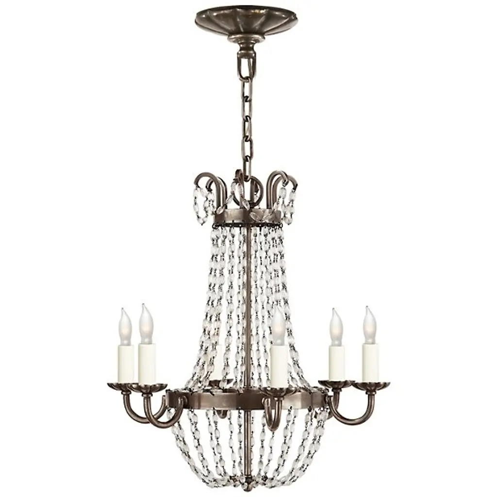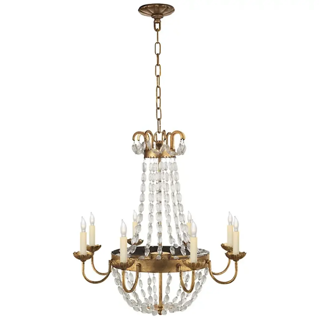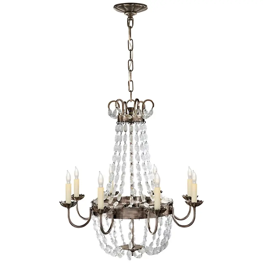 Add French panache to the home with a Paris Flea Market Chandelier by Visual Comfort Signature, formerly known as Visual Comfort, The beads of seeded glass and scalloped bobeches harken Art Deco design. Fabulous whether hanging in a dramatic dining room furnished with antiques or an eclectically curated traditional living space, this 33-inch high light fixture has a round canopy, candelabra bulb sockets and a suspension chain.