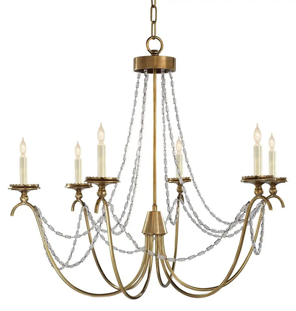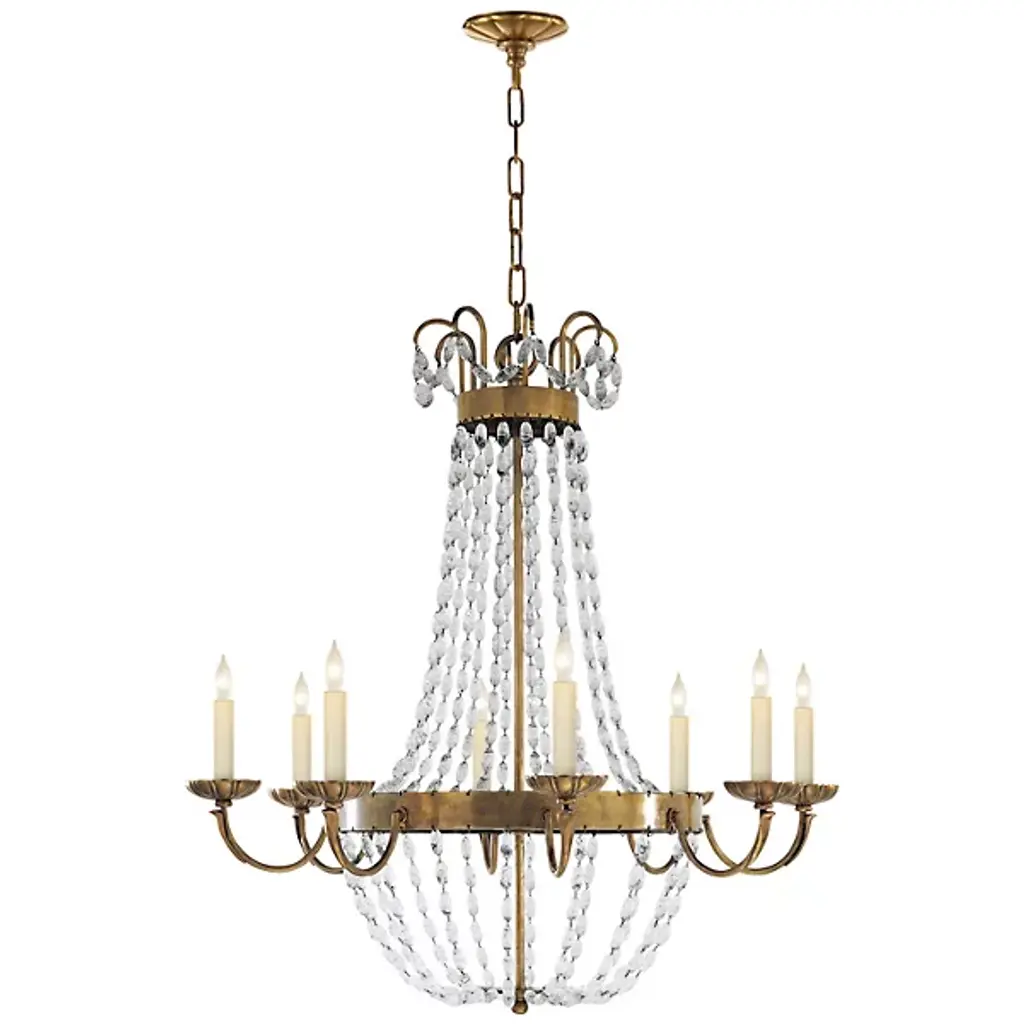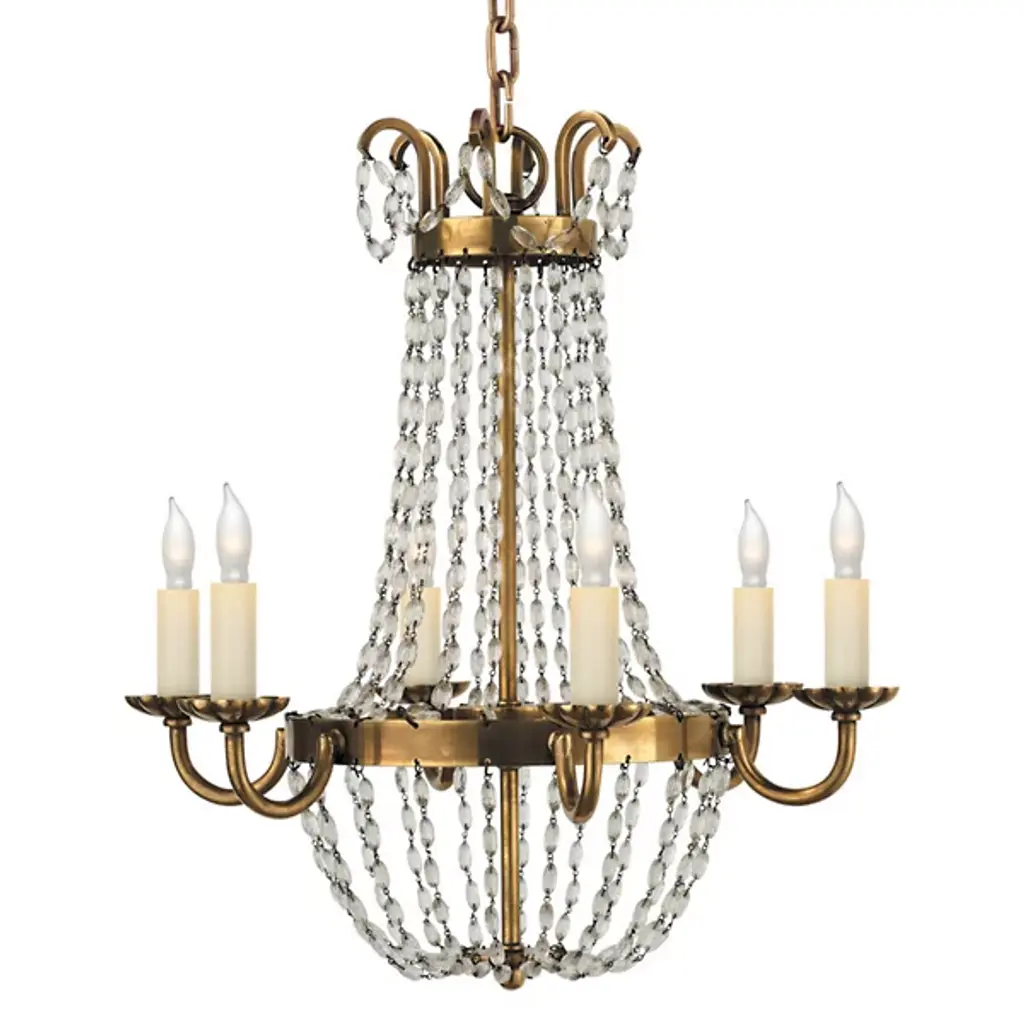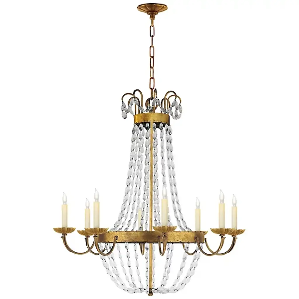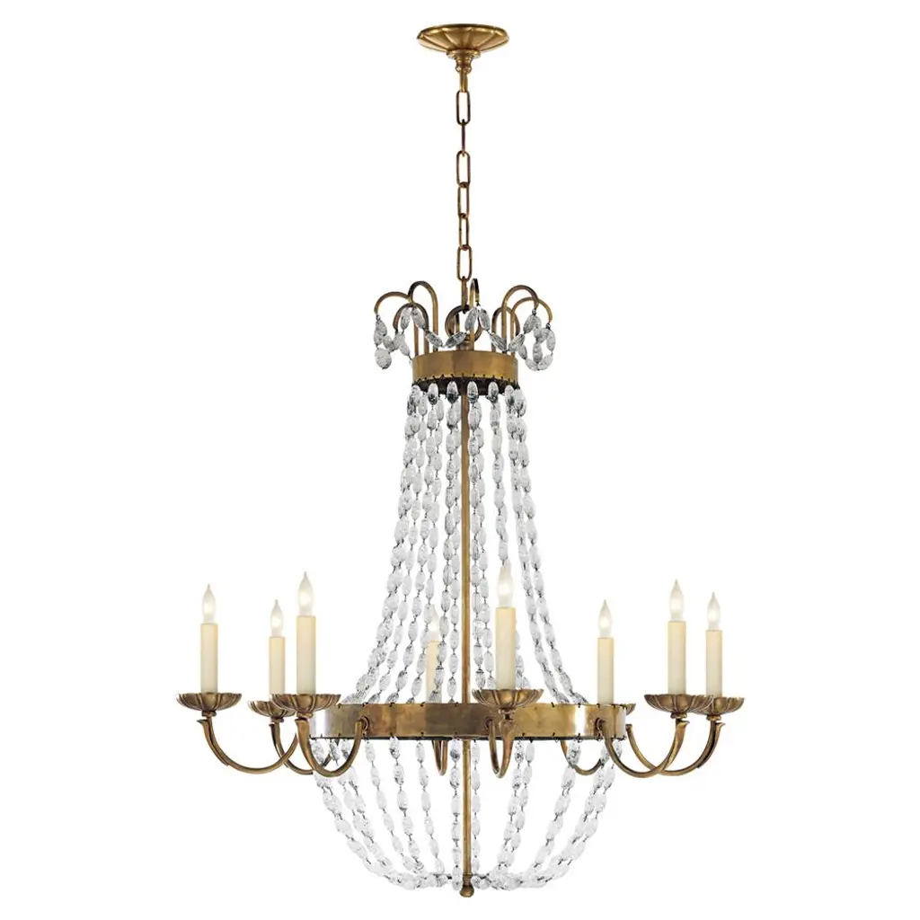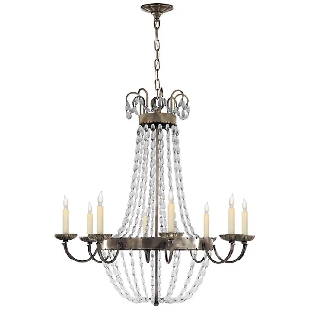 Add French panache to the home with a Paris Flea Market Chandelier by Visual Comfort Signature, formerly known as Visual Comfort, The beads of seeded glass and scalloped bobeches harken Art Deco design. Fabulous whether hanging in a dramatic dining room furnished with antiques or an eclectically curated traditional living space, this 33-inch high light fixture has a round canopy, candelabra bulb sockets and a suspension chain.