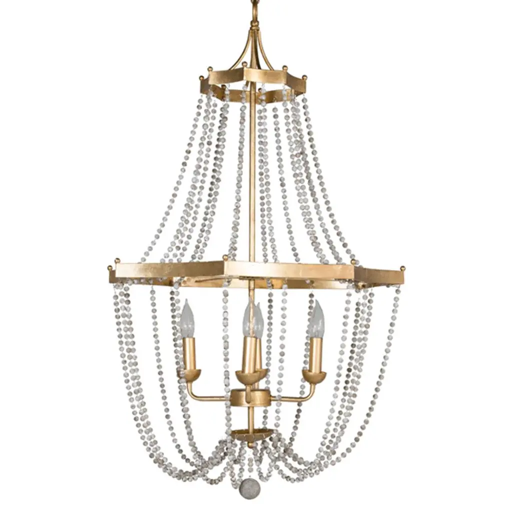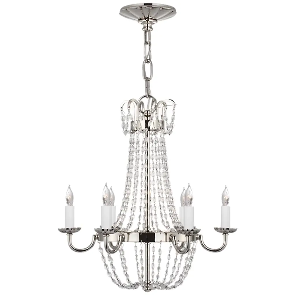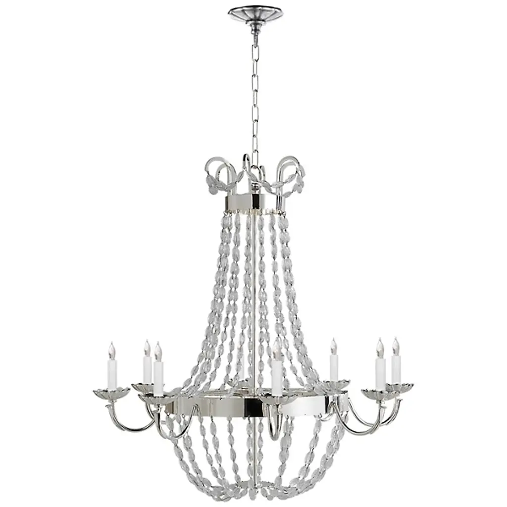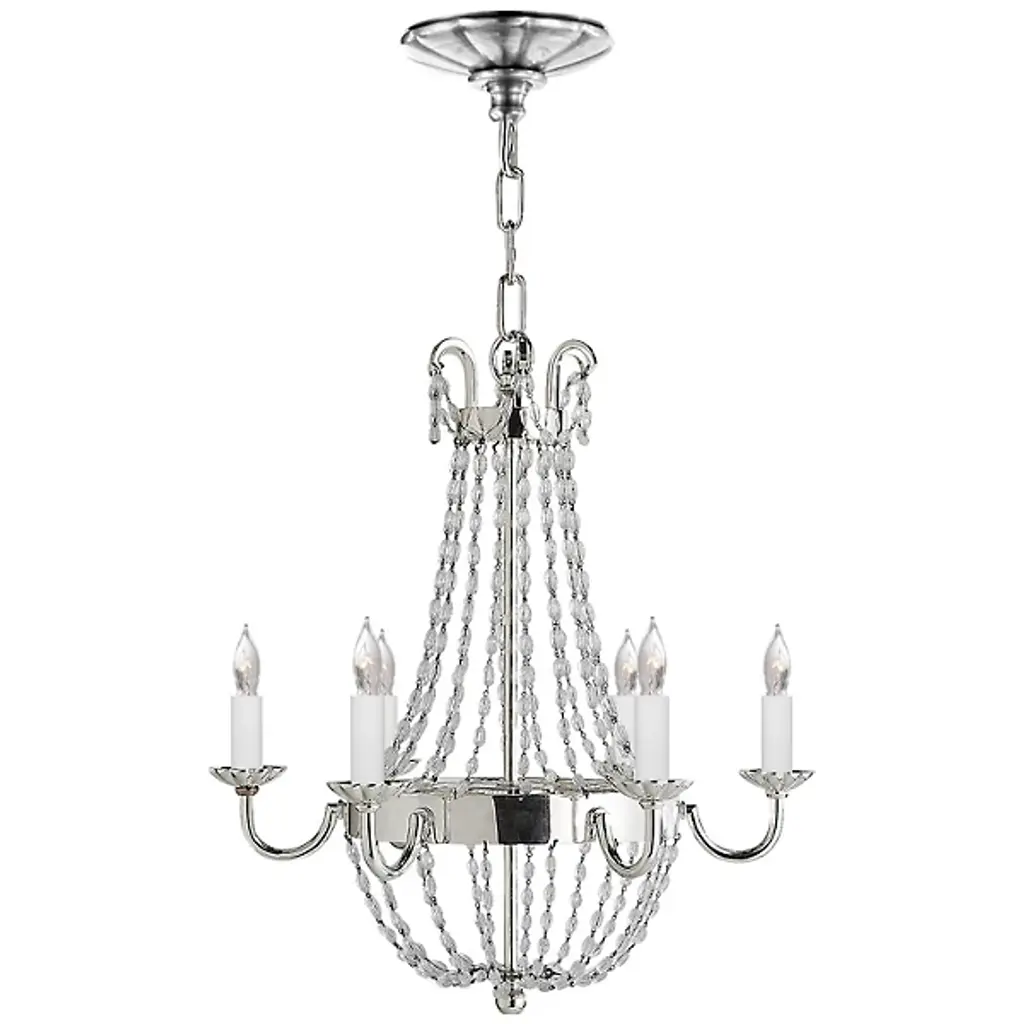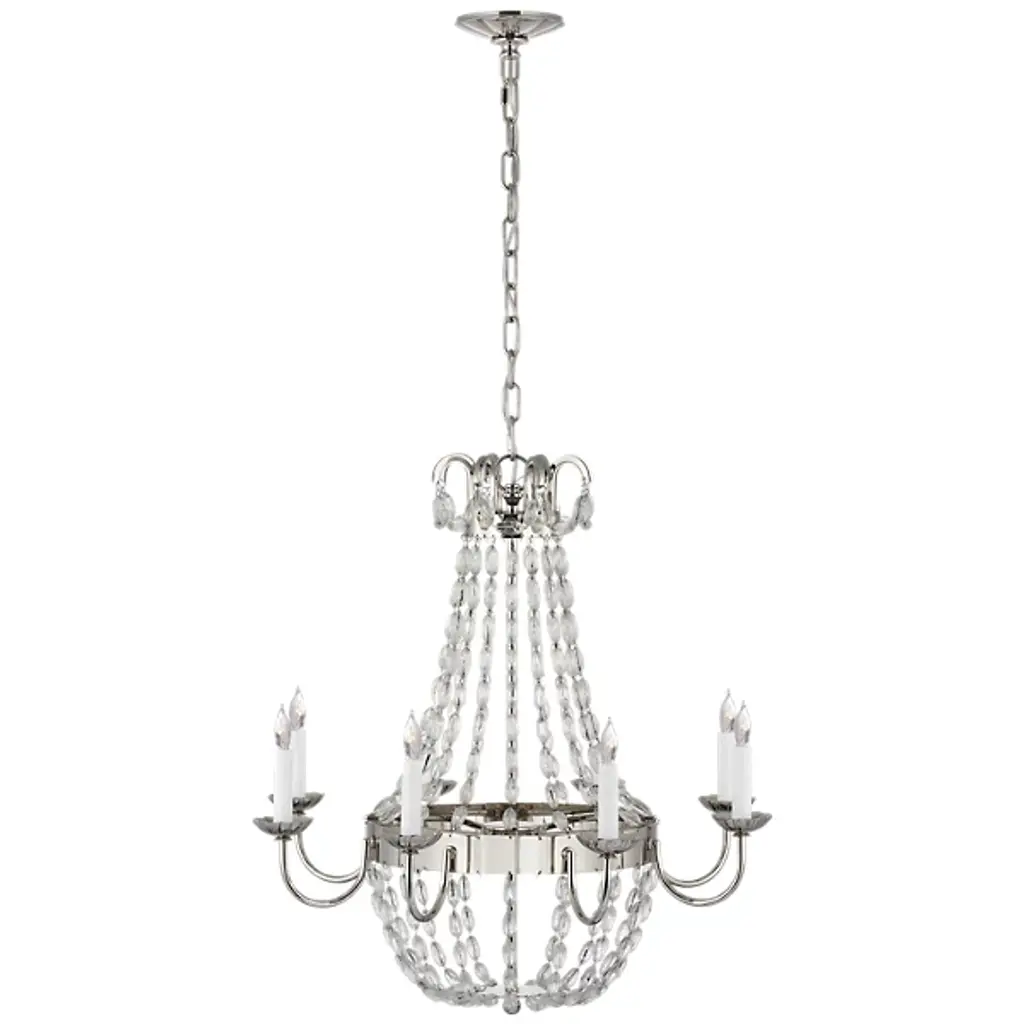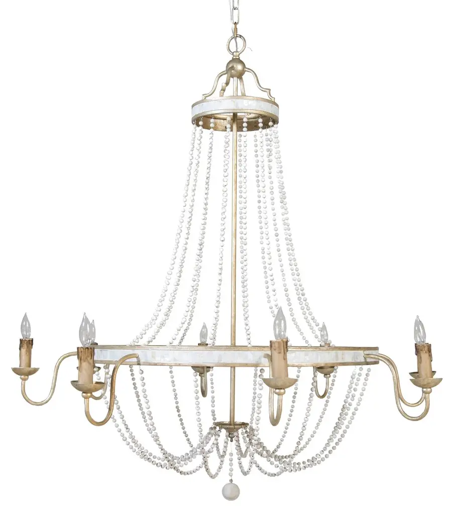 Add French panache to the home with a Paris Flea Market Chandelier by Visual Comfort Signature, formerly known as Visual Comfort, The beads of seeded glass and scalloped bobeches harken Art Deco design. Fabulous whether hanging in a dramatic dining room furnished with antiques or an eclectically curated traditional living space, this 33-inch high light fixture has a round canopy, candelabra bulb sockets and a suspension chain.