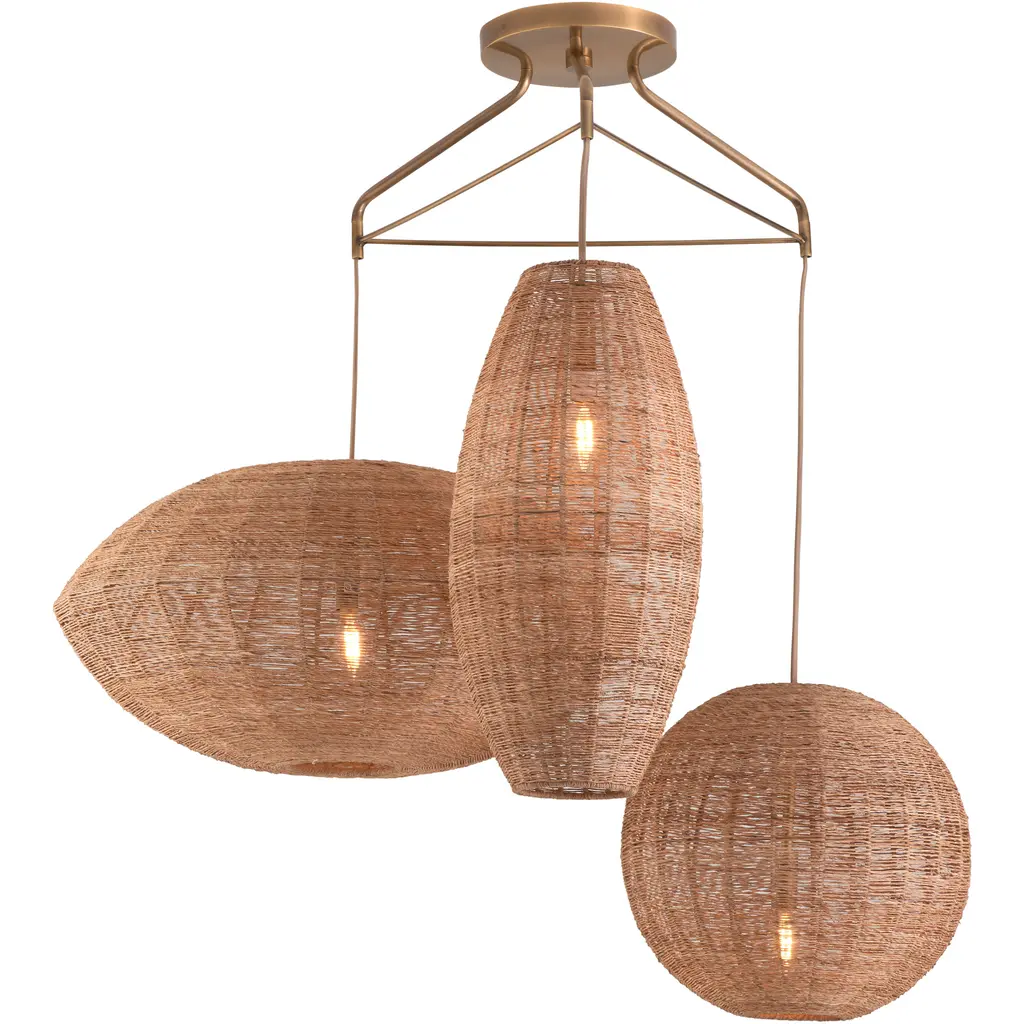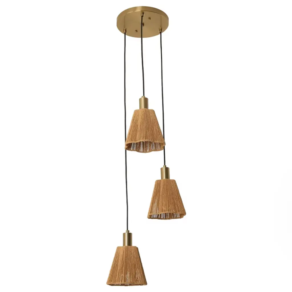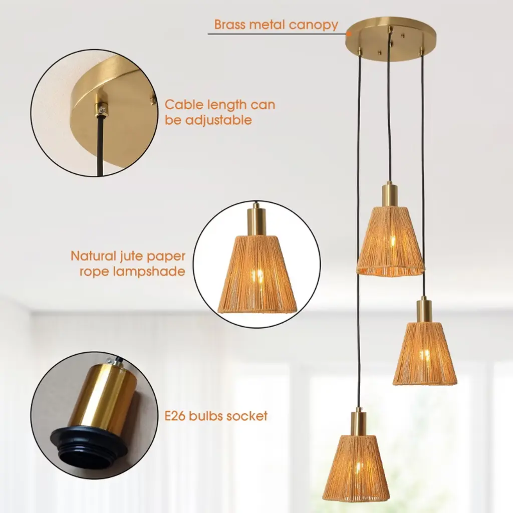 This exquisite 15-inch Rustic Brass Chandelier Ceiling Light skillfully combines natural materials with modern design, injecting a warm and cozy atmosphere into your space. The lampshade is crafted with natural jute fiber and metal, which not only retains the rustic texture of jute, but also gives it a solid sense of support through the metal frame, and the overall shape is like three blossoming flowers, with soft and layered lines, adding a touch of art to the ceiling.