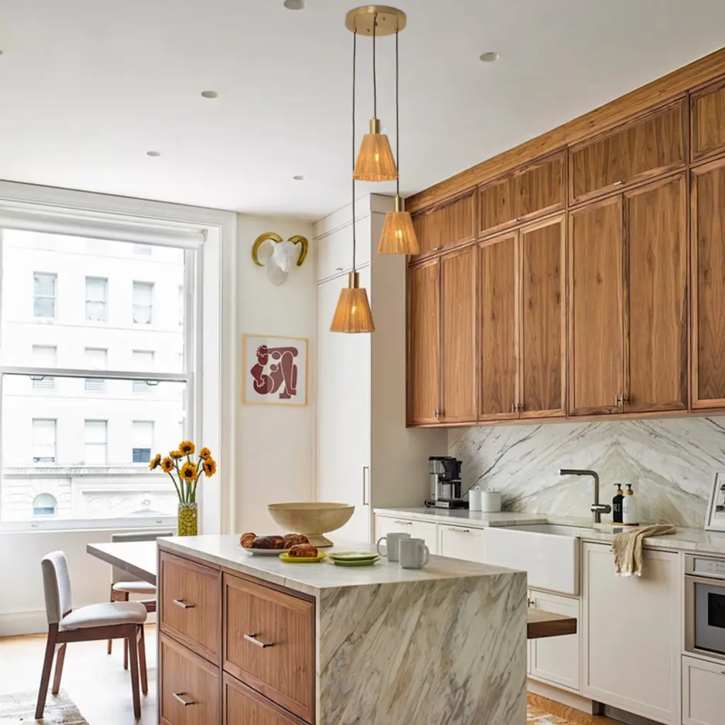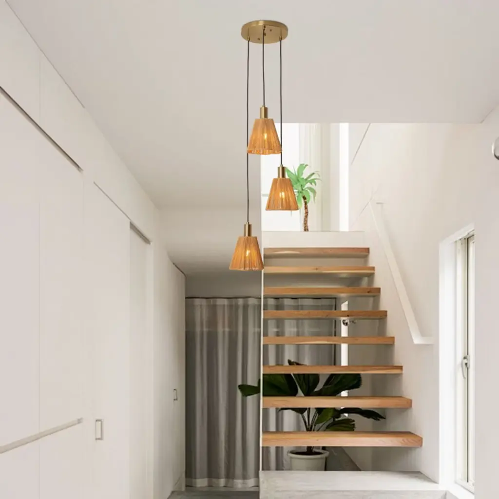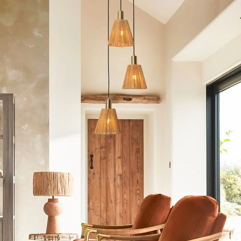 This exquisite 15-inch Rustic Brass Chandelier Ceiling Light skillfully combines natural materials with modern design, injecting a warm and cozy atmosphere into your space. The lampshade is crafted with natural jute fiber and metal, which not only retains the rustic texture of jute, but also gives it a solid sense of support through the metal frame, and the overall shape is like three blossoming flowers, with soft and layered lines, adding a touch of art to the ceiling.