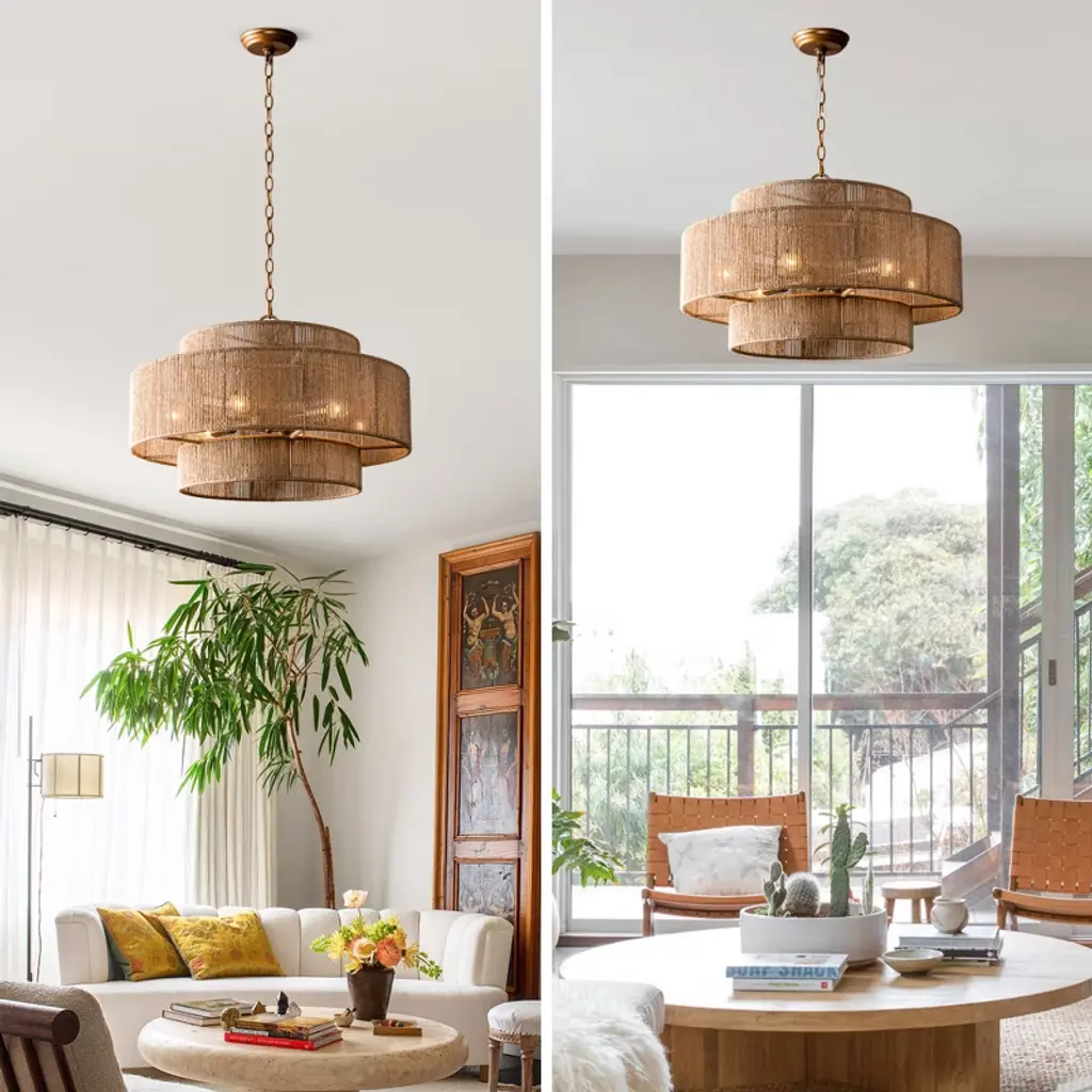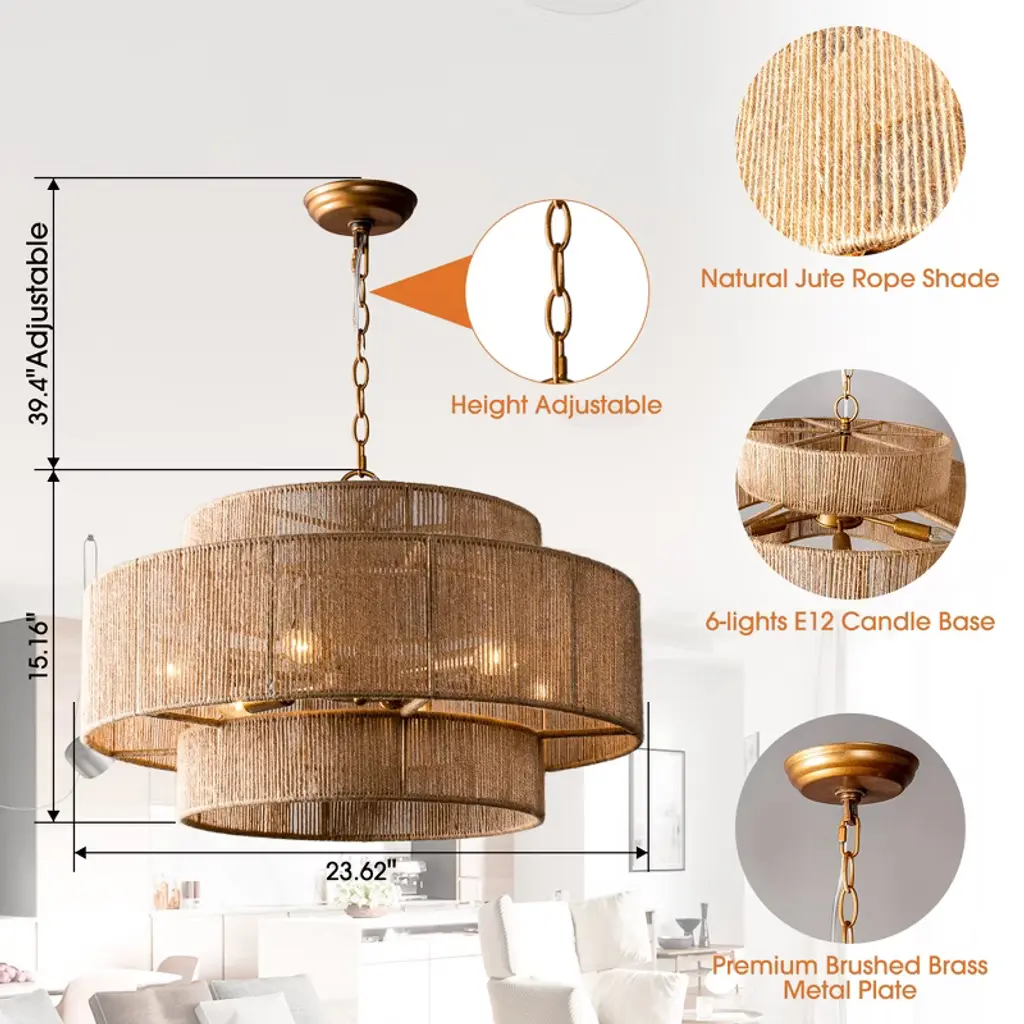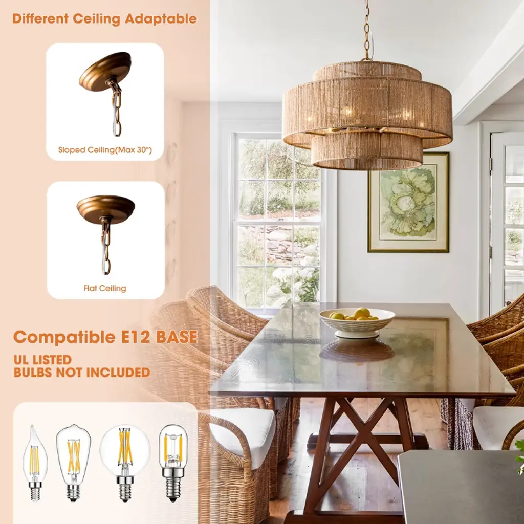 Designed with minimalist lines, this gold chandelier will add beauty to your room with a double rope light shade. The color combination of the gold finish and rope light shade is simple and harmonious. Comes with a 39.3-inch hanging chain that allows you to adjust the hanging height to fit the space in your room. The various type B bulbs are suitable for the E12 bulb base. The rustic-style lamp takes you into nature and relaxes you.