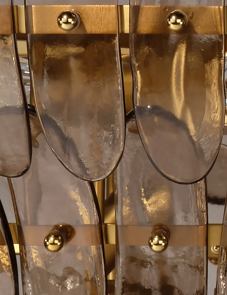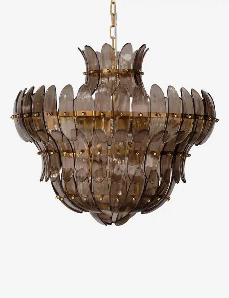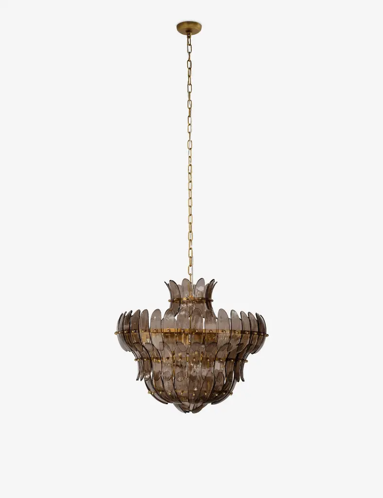 This sculptural chandelier features curved glass petals that fan out in a layered arrangement, banded by antique brass for an elegant finish. The translucent taupe glass softens the look while adding tonal depth. Hang this grand ceiling light over a dining table or in a vaulted stairwell to bring sculptural polish to your space.