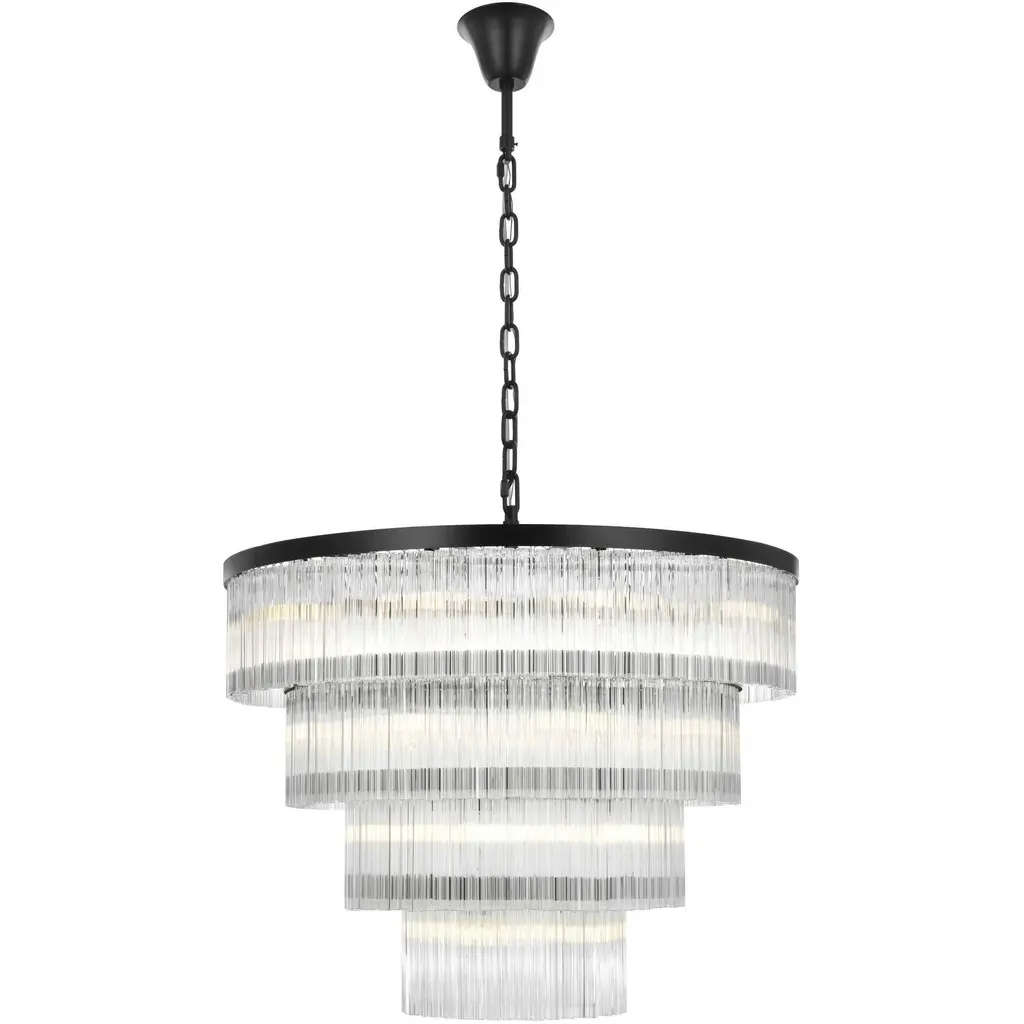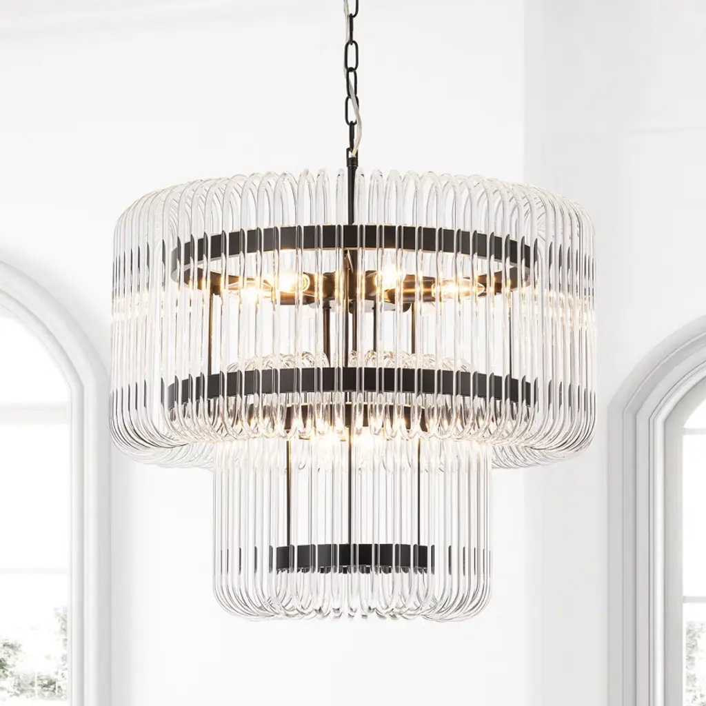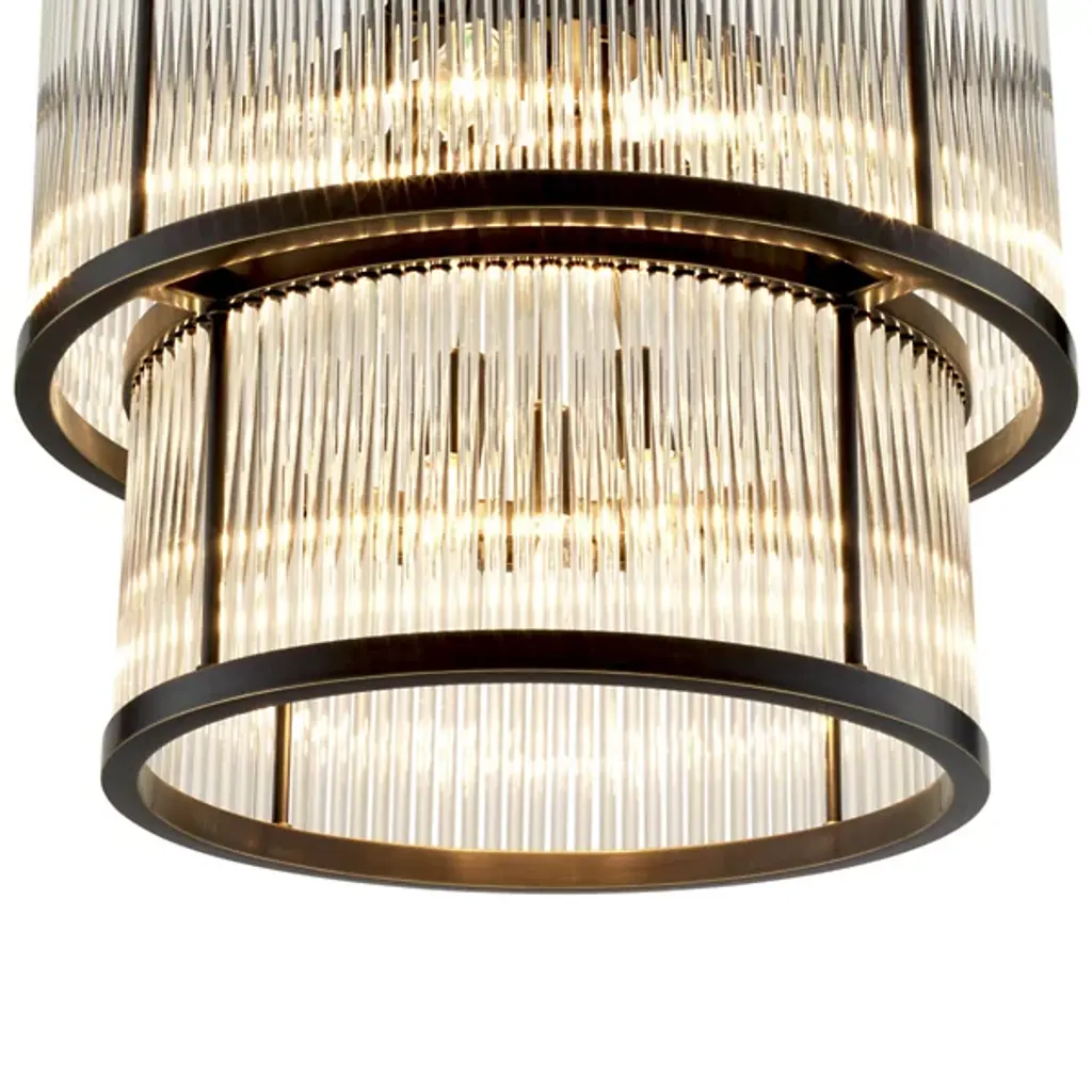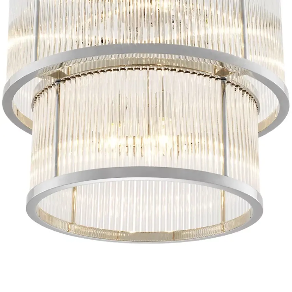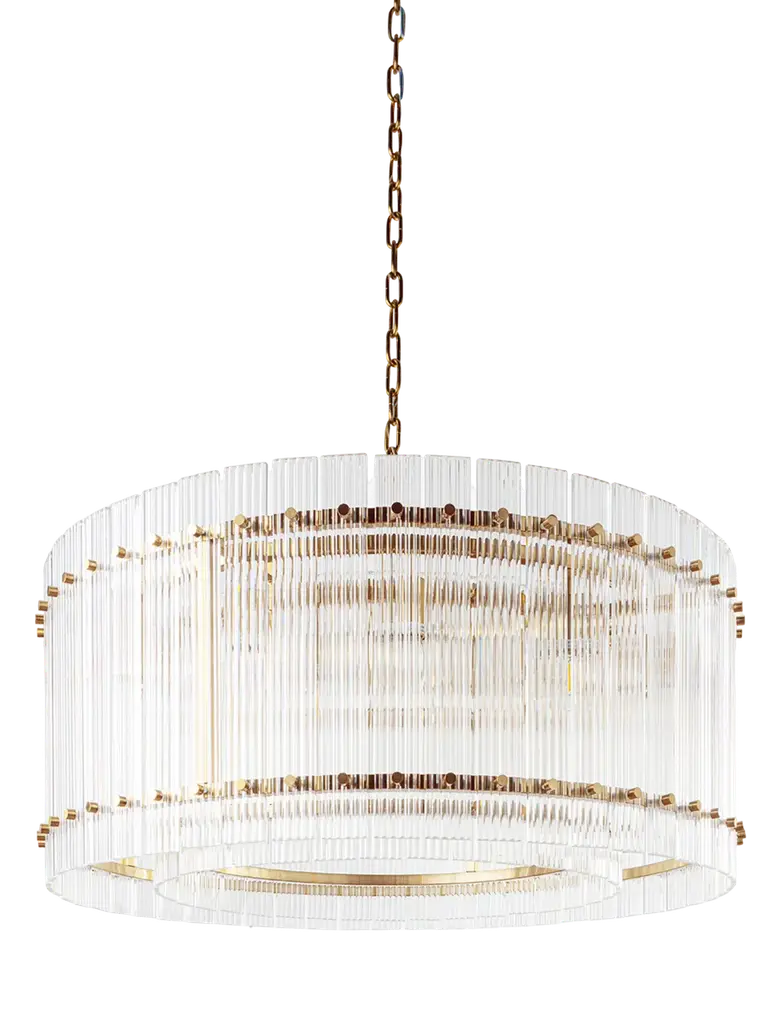 The Pasadena Chandelier from Eichholtz is a depth-filled beauty, pulling one closer with layers of shimmering, repeating glass. This chandelier combines Art Deco with refined contemporary design. These design elements show in the chandelier’s graphic drum structure. Clear glass rods follow the silhouette of the structure, giving the piece a striated display of mesmerizing reflections. The glass breaks up the image of the bulbs for a glare-reduced lighting experience. The bulb setup touches up the glass with artful highlights. The bulb’s light exits as a spacious ambient glow. The chandelier’s grand scale makes it ideal in the foyer, living space, or dining room.