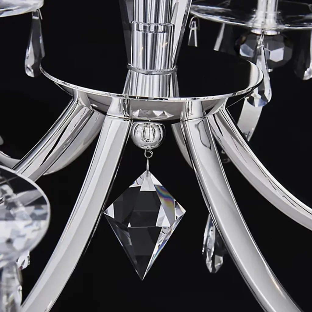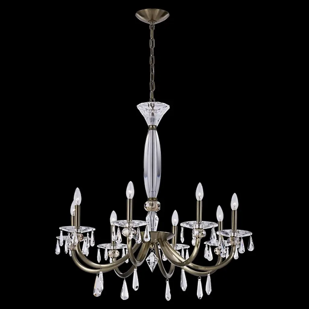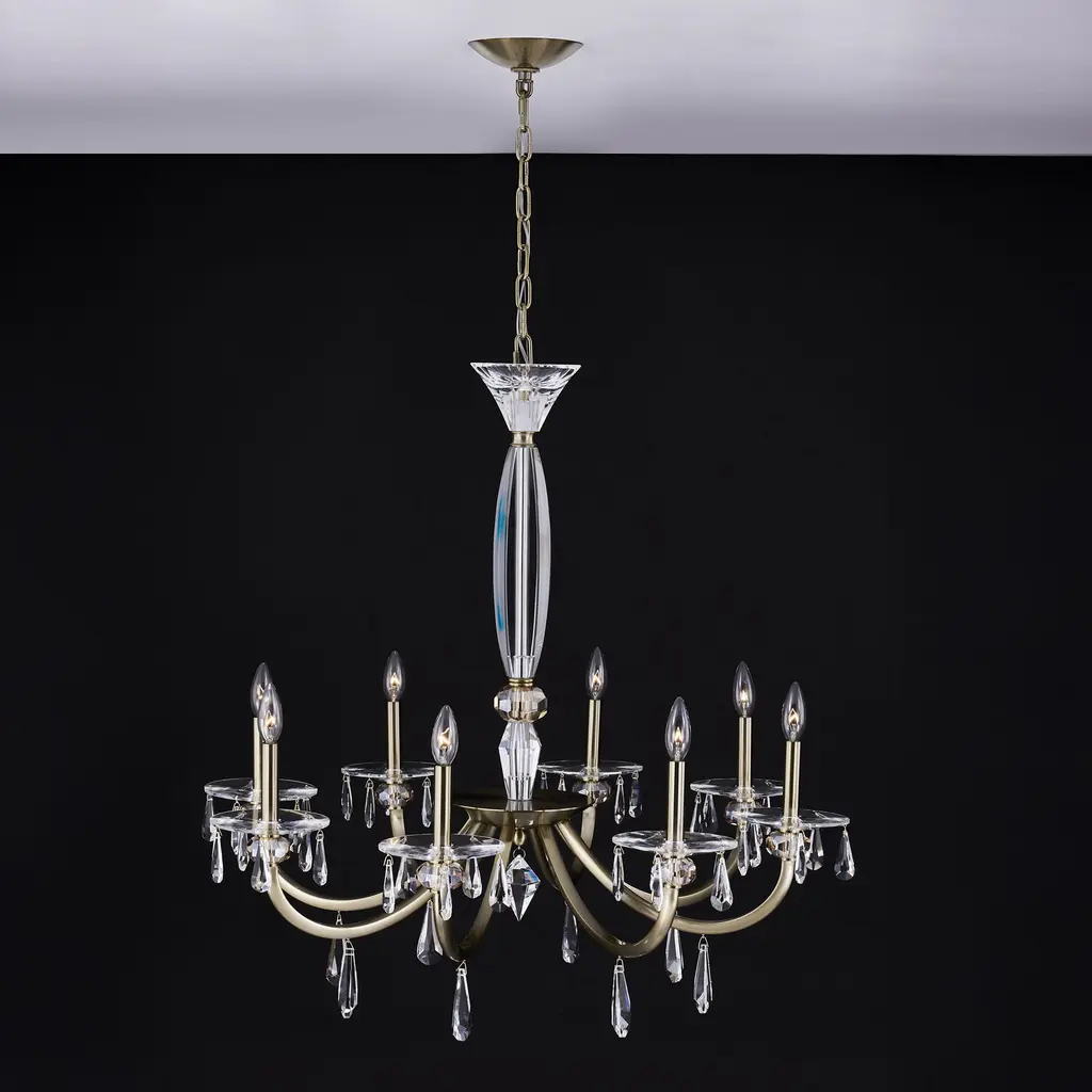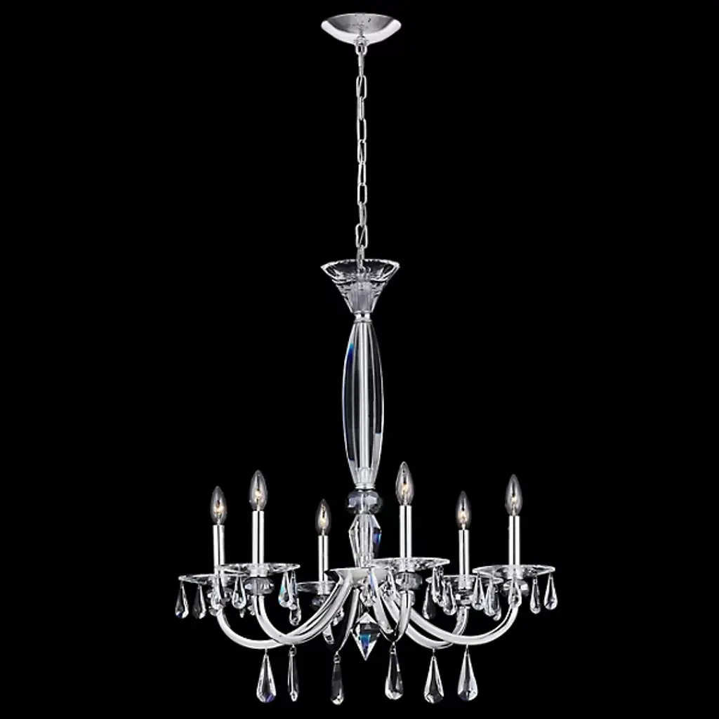 The Passo Chandelier from Allegri by Kalco Lighting curves through space in traditional swooping arms that flow outward from a central stem. Each of the six arms terminates with faceted accents that create sparkle points throughout the structure, complemented by teardrop pendants that hang gracefully to add movement and light refraction. The suspension’s clear elements maintain focus on the classic proportions and refined metal craftsmanship that updates traditional chandelier design through contemporary detailing.