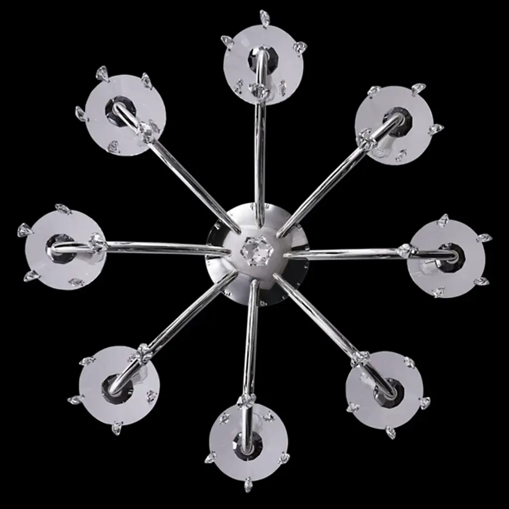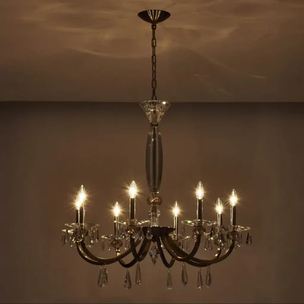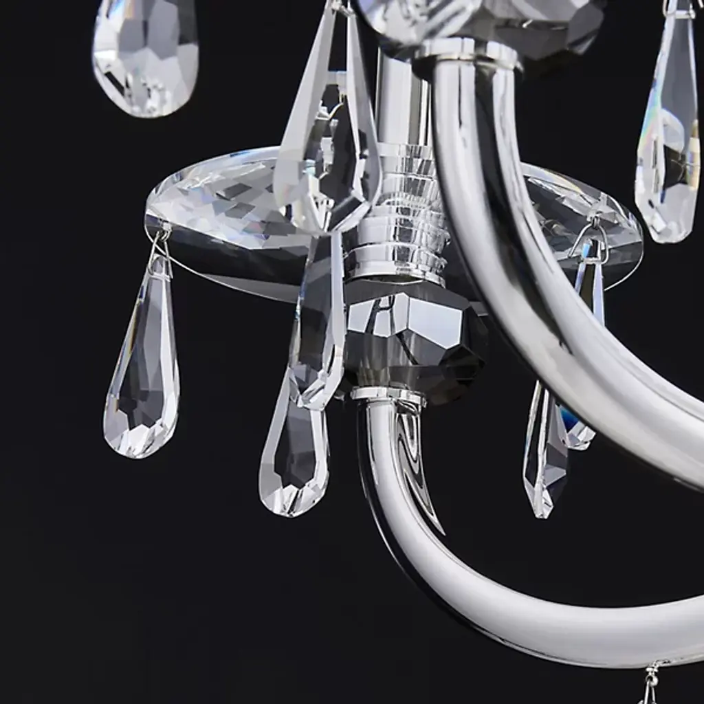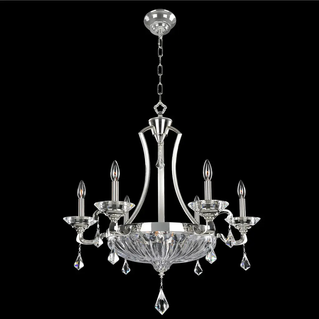 The Passo Chandelier from Allegri by Kalco Lighting curves through space in traditional swooping arms that flow outward from a central stem. Each of the six arms terminates with faceted accents that create sparkle points throughout the structure, complemented by teardrop pendants that hang gracefully to add movement and light refraction. The suspension’s clear elements maintain focus on the classic proportions and refined metal craftsmanship that updates traditional chandelier design through contemporary detailing.