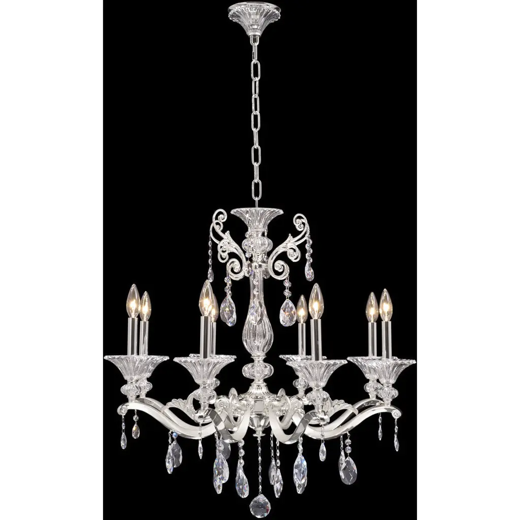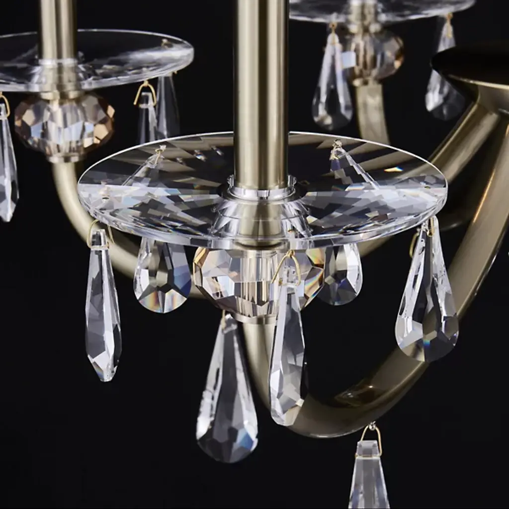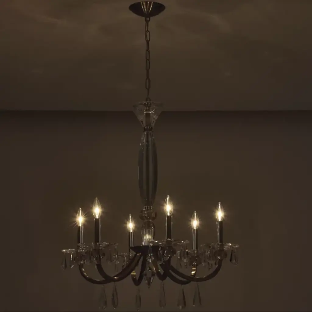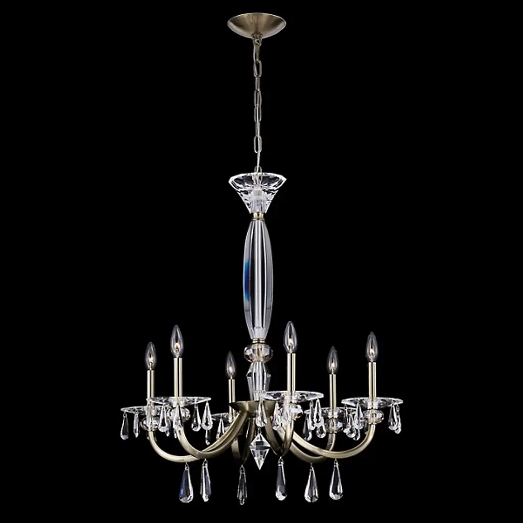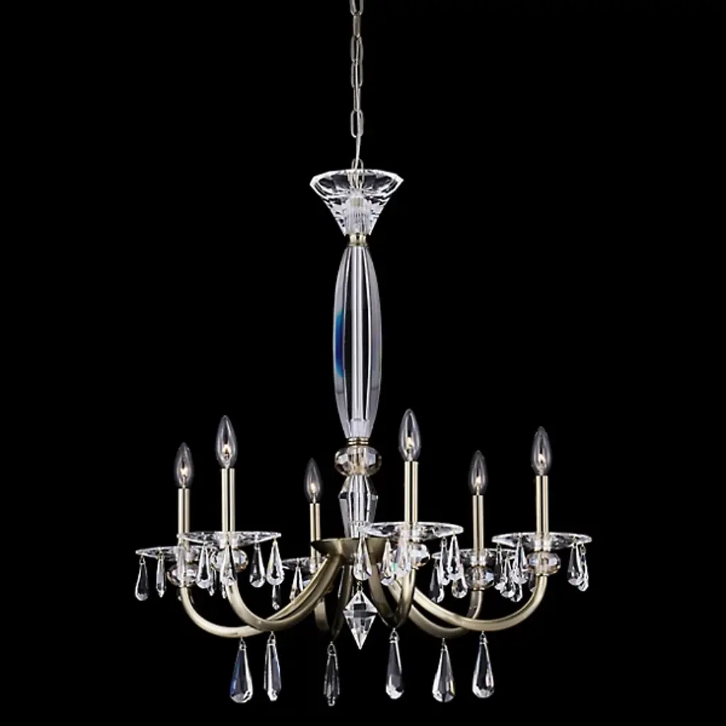 The Passo Chandelier from Allegri by Kalco Lighting curves through space in traditional swooping arms that flow outward from a central stem. Each of the six arms terminates with faceted accents that create sparkle points throughout the structure, complemented by teardrop pendants that hang gracefully to add movement and light refraction. The suspension’s clear elements maintain focus on the classic proportions and refined metal craftsmanship that updates traditional chandelier design through contemporary detailing.