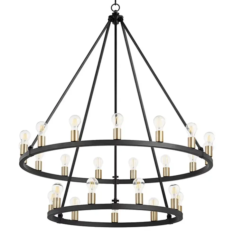 Add a grand and charming presence to your modern home with the Paxton 2-Tier Chandelier from Quorum International. Smooth wood and metal material complement beautifully, creating an appealing farmhouse style that comforts the senses. A brief chainlink hangs from the ceiling, leading to a central point that extends out a group of thin metal rods, each angled as they lead to one of two wide, wood ring frames. Upon each frame is a collection of bulbs that express a bright and even layer of light.