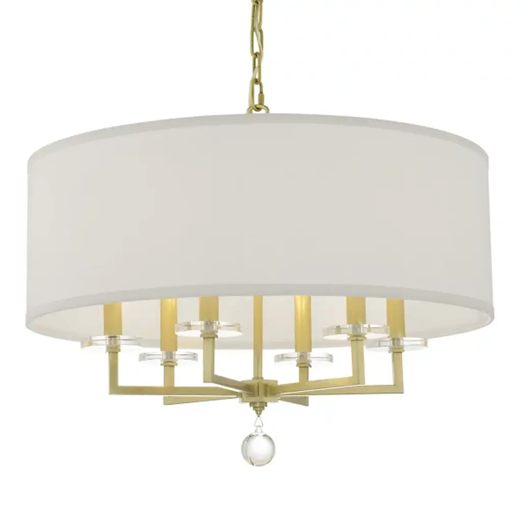 A stunning fusion of motifs. At its heart, the Paxton Drum Chandelier by Crystorama is a classic design featuring individual 'candles' arranged around a central, chain-suspended hub. Crystalline details at the base of each light turn up the elegance, while an open cylindrical shade brings diversity to the look, making this chandelier a versatile fit for both vintage and modern décor stories.