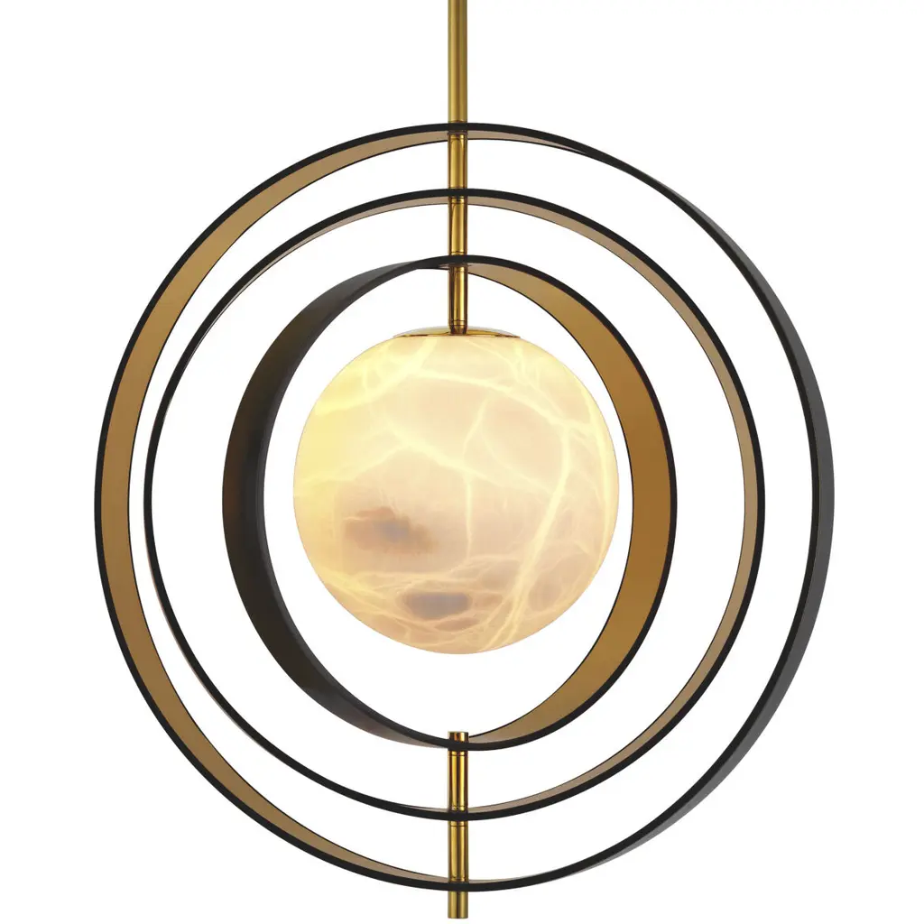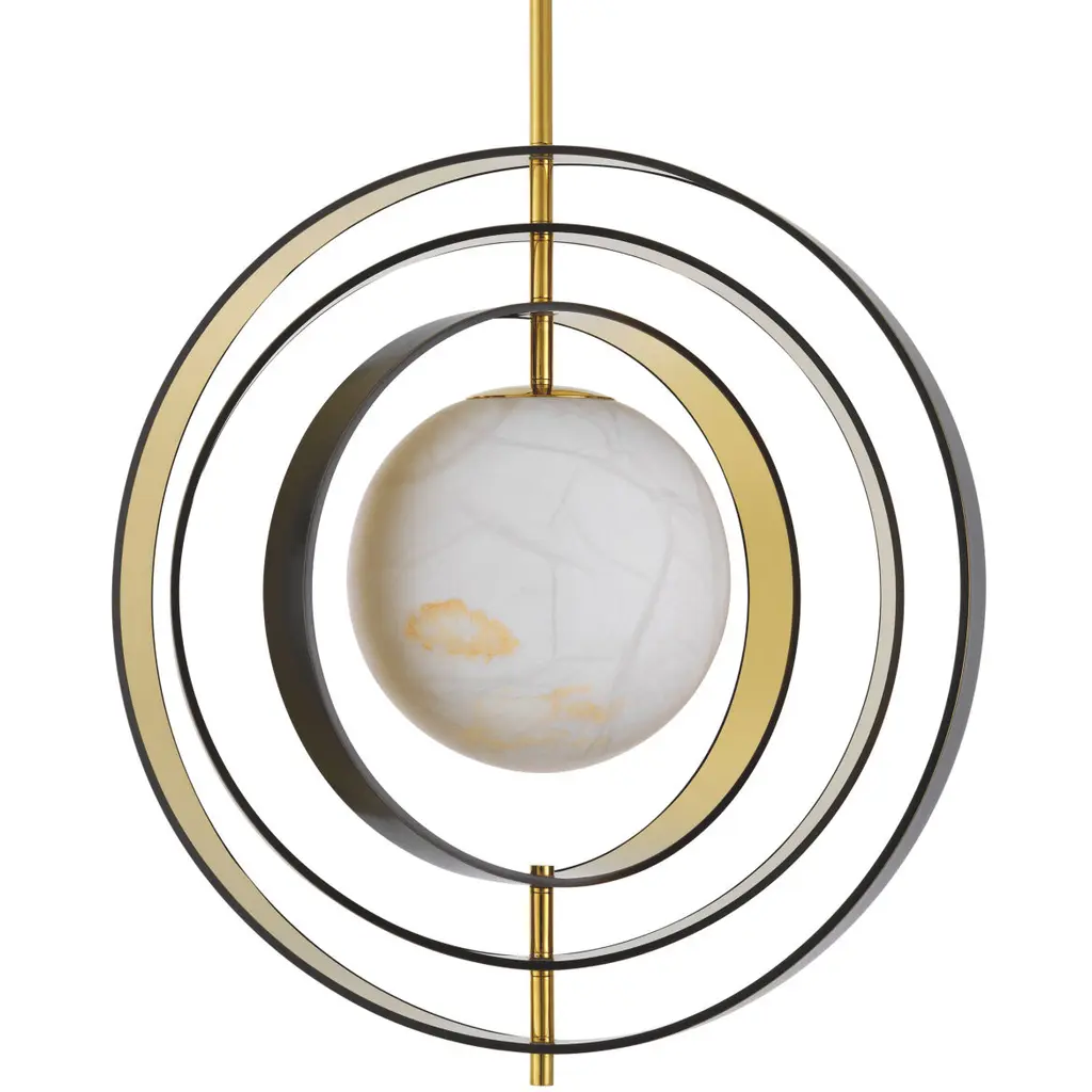 With its galactic appeal, Chandelier Pearl makes a radiant focal point in your home interior. Its pearl-like alabaster shade is surrounded by four metal rings with a bronze highlight finish on the outside and a gold finish on the inside. The rings can be rotated individually.