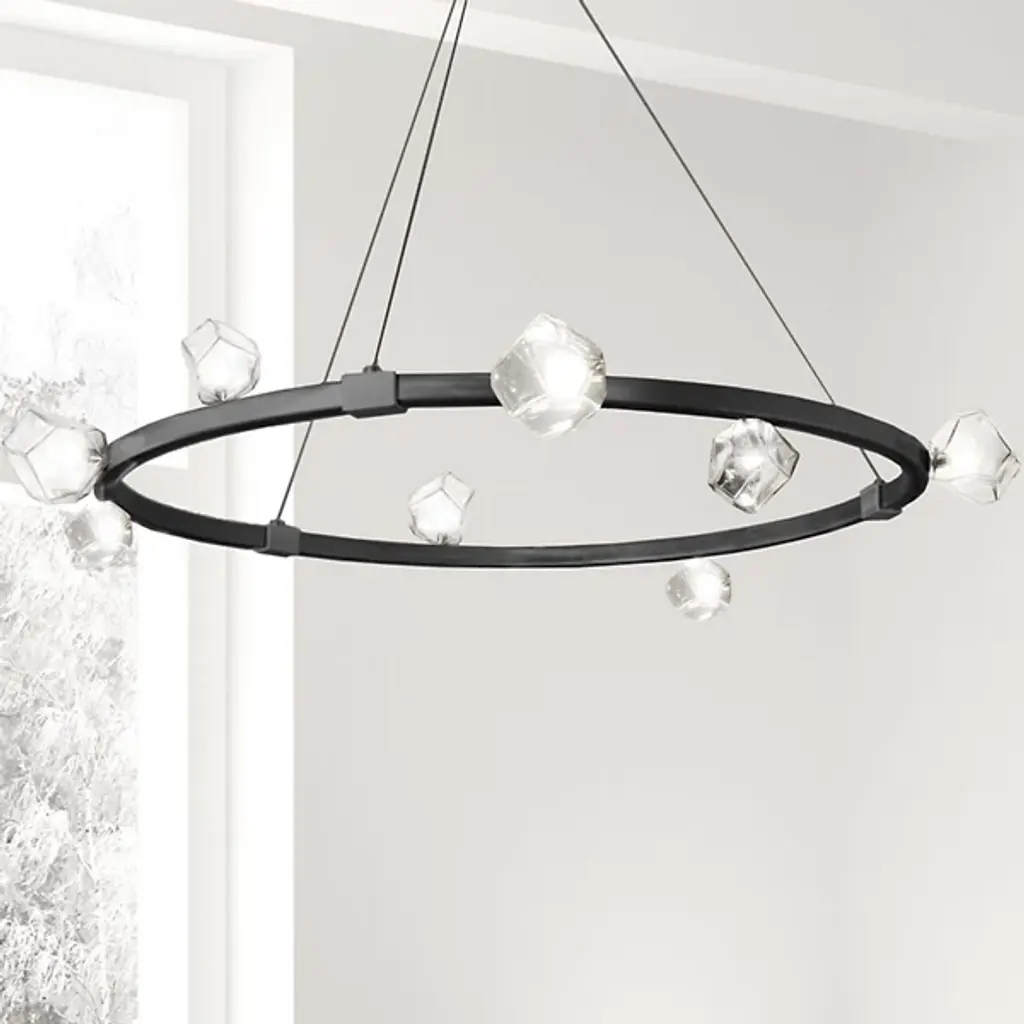 A sparkling jewel of a light fixture, designed to dazzle. The Pearlene Ring Chandelier by Dainolite features a large, ring-shaped metal frame studded all around with glass shades made to resemble rough crystals. These crystalline shades shimmer warmly and brightly with the petite bulbs housed within. In a dining room or entryway, this unique, glamorous chandelier is just the piece you need to catch eyes and create a glamorous atmosphere.