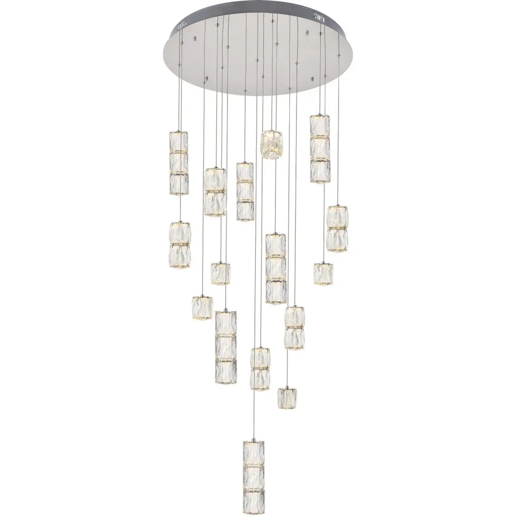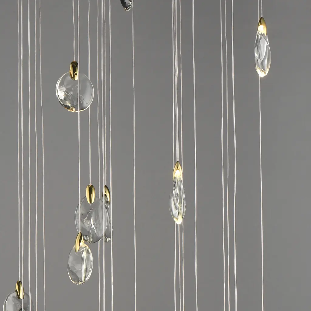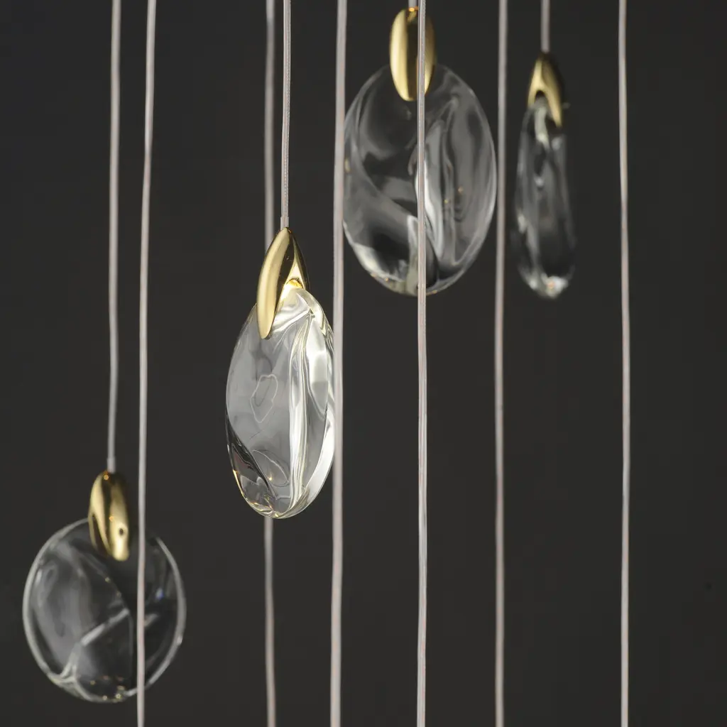 As if naturally formed from the ebbing shores of a riverbed, smooth and irregularly shaped crystal pebbles are suspended by cast metal clasps in a Polished Gold finish. Discreetly illuminated by concealed LED light sources within the clasps, additional downlight originates from LED GU10 lamps housed in a Matte Black canopy adding to the refracting iridescent shimmer on the crystal surface below. Available in multiple configurations of pendants as well as sconce options.