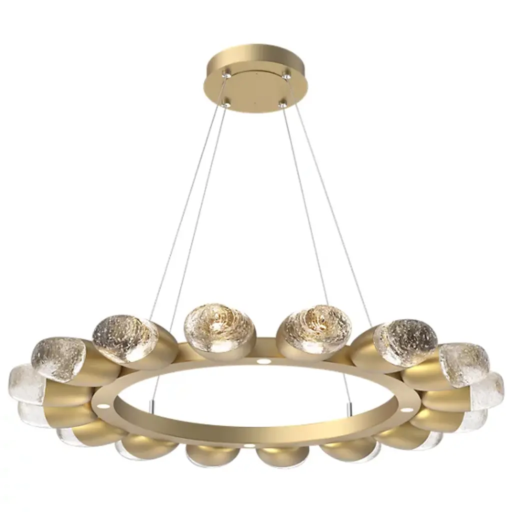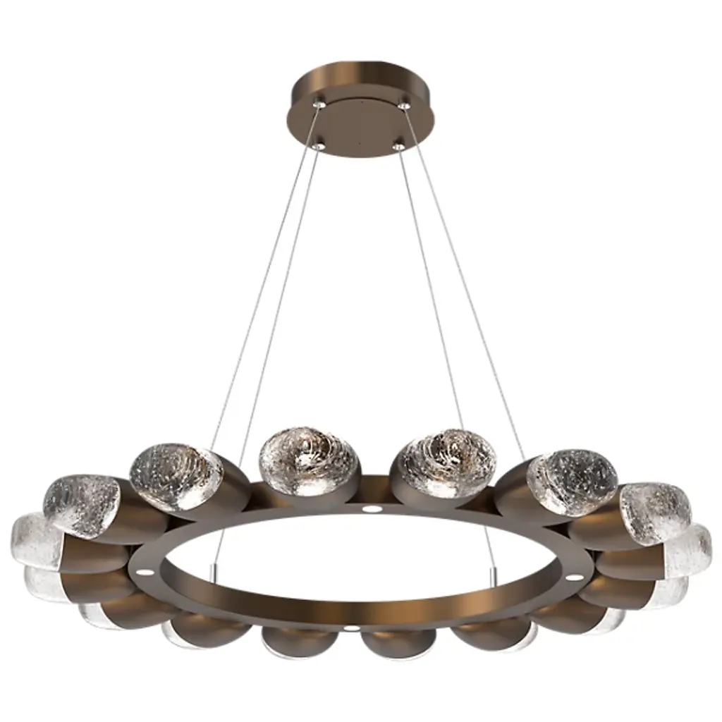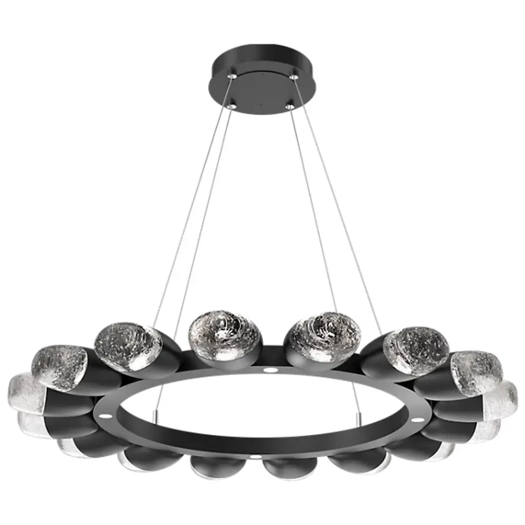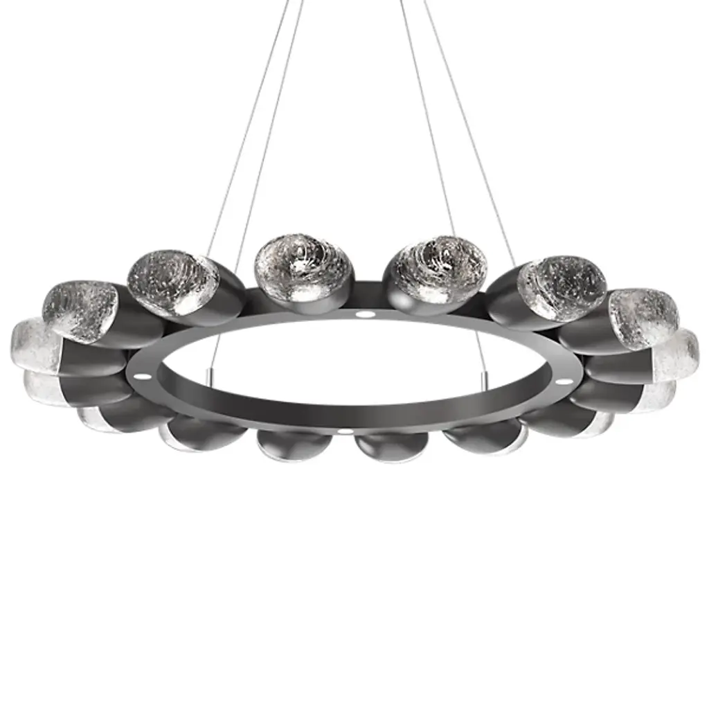Hammerton Studio presents the Pebble LED Ring Chandelier. It's a versatile ceiling fixture suitable for contemporary and modern spaces. This simple yet elegant chandelier design has juxtaposed beautifully finished precision-machined metalwork with softly illuminated rondelles of artisan cast glass. The glass housings can be positioned at preset angles to create dynamic, spacious light quality.