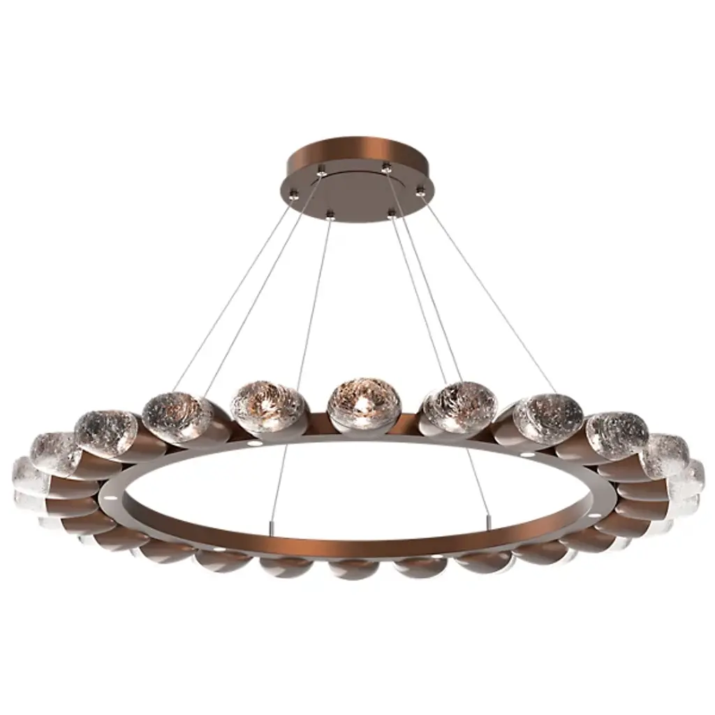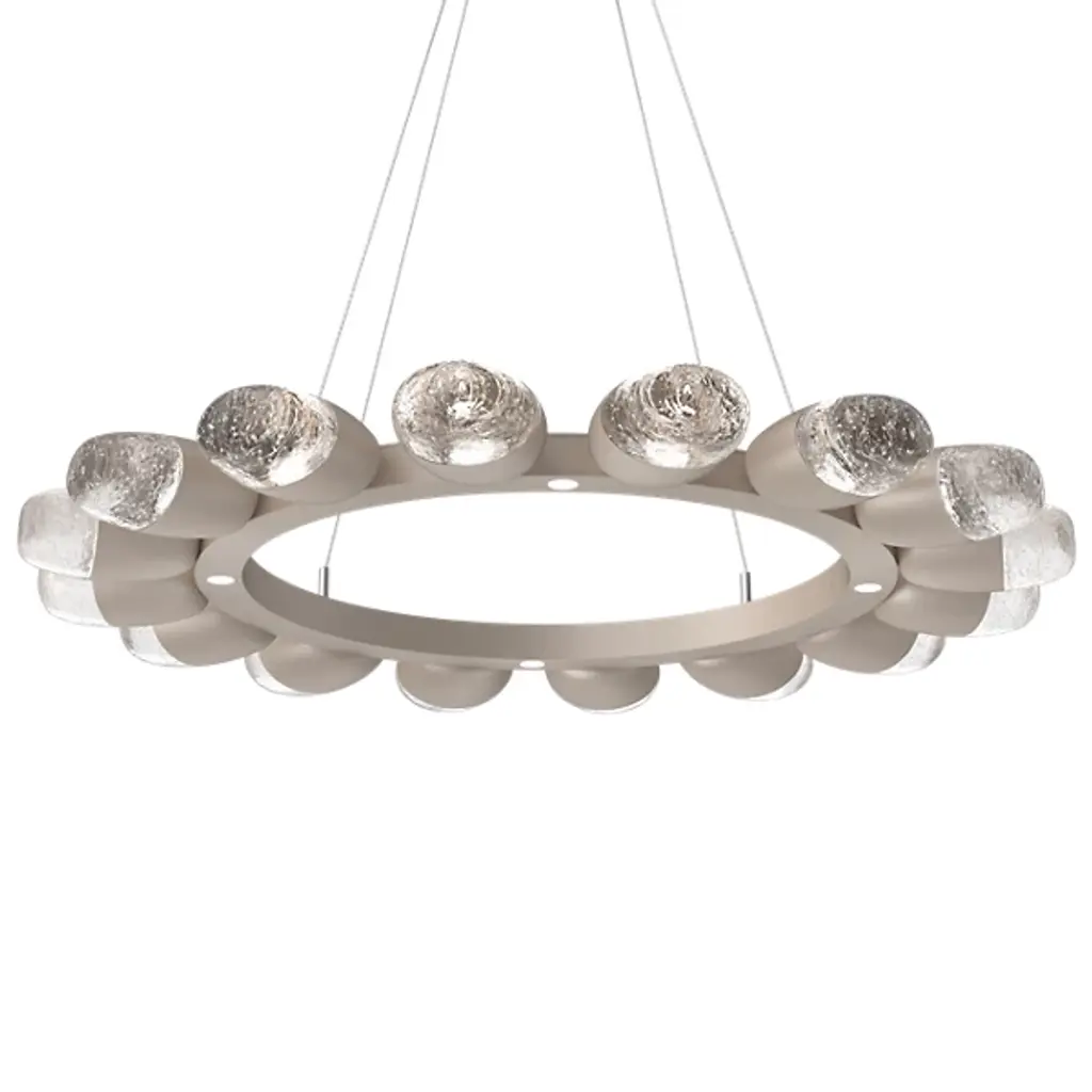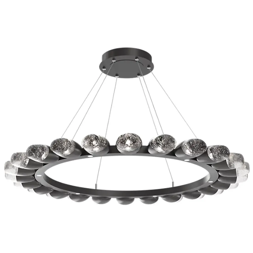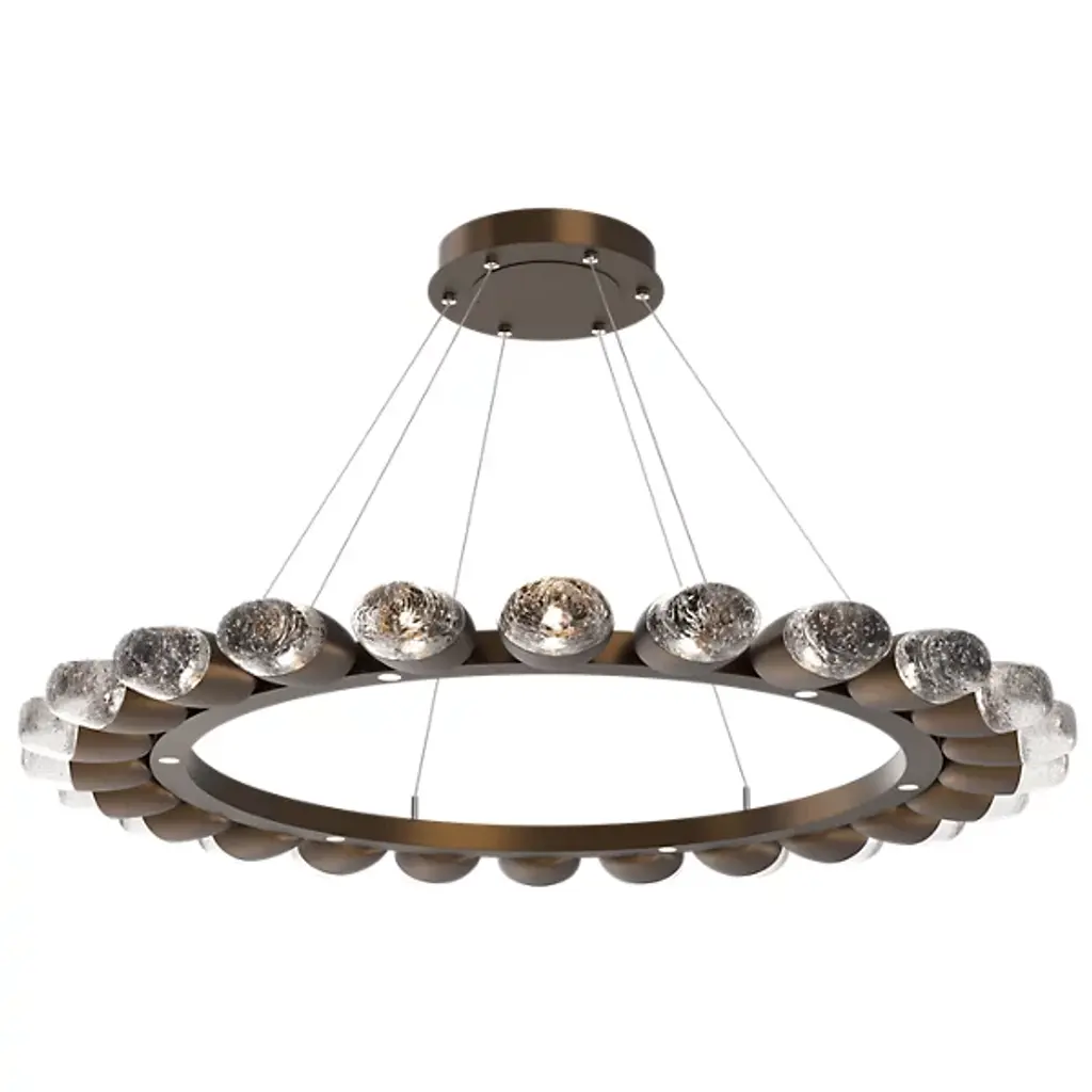 Hammerton Studio presents the Pebble LED Ring Chandelier. It's a versatile ceiling fixture suitable for contemporary and modern spaces. This simple yet elegant chandelier design has juxtaposed beautifully finished precision-machined metalwork with softly illuminated rondelles of artisan cast glass. The glass housings can be positioned at preset angles to create dynamic, spacious light quality.