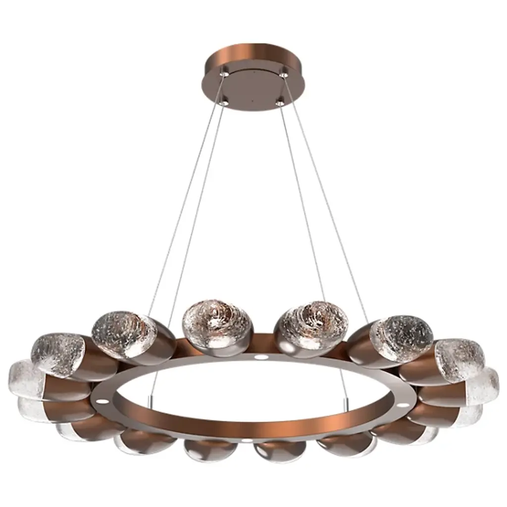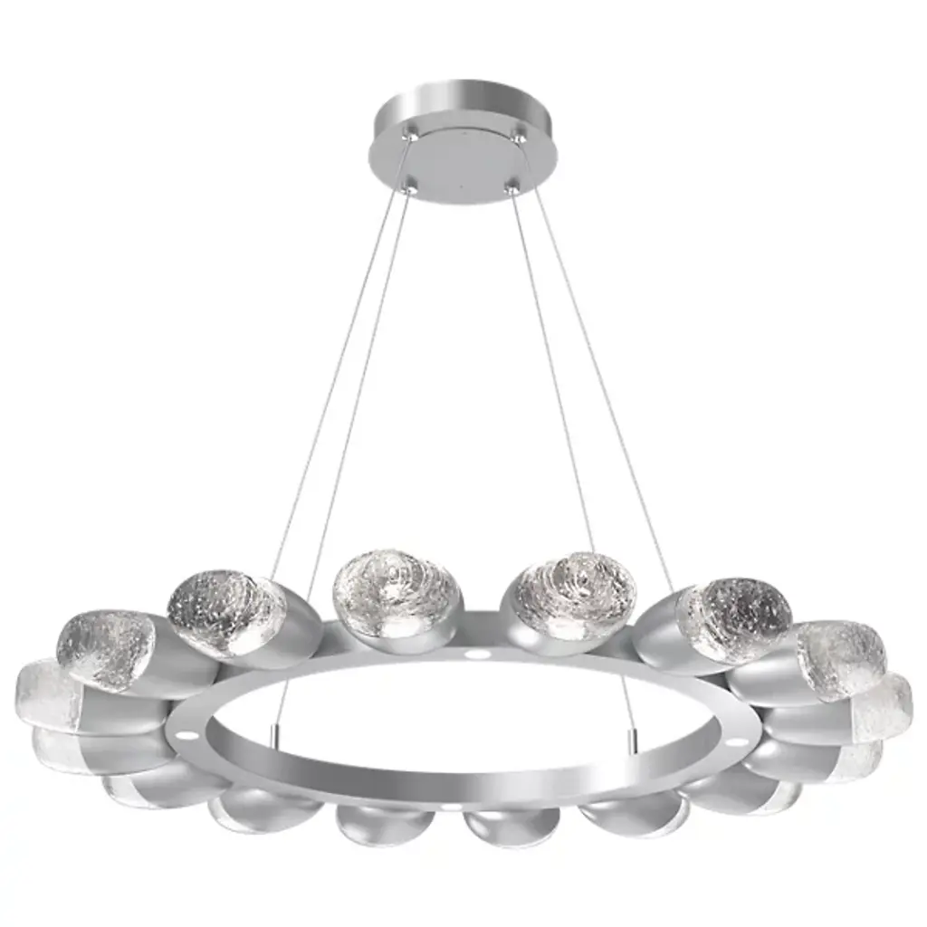 Hammerton Studio presents the Pebble LED Ring Chandelier. It's a versatile ceiling fixture suitable for contemporary and modern spaces. This simple yet elegant chandelier design has juxtaposed beautifully finished precision-machined metalwork with softly illuminated rondelles of artisan cast glass. The glass housings can be positioned at preset angles to create dynamic, spacious light quality.