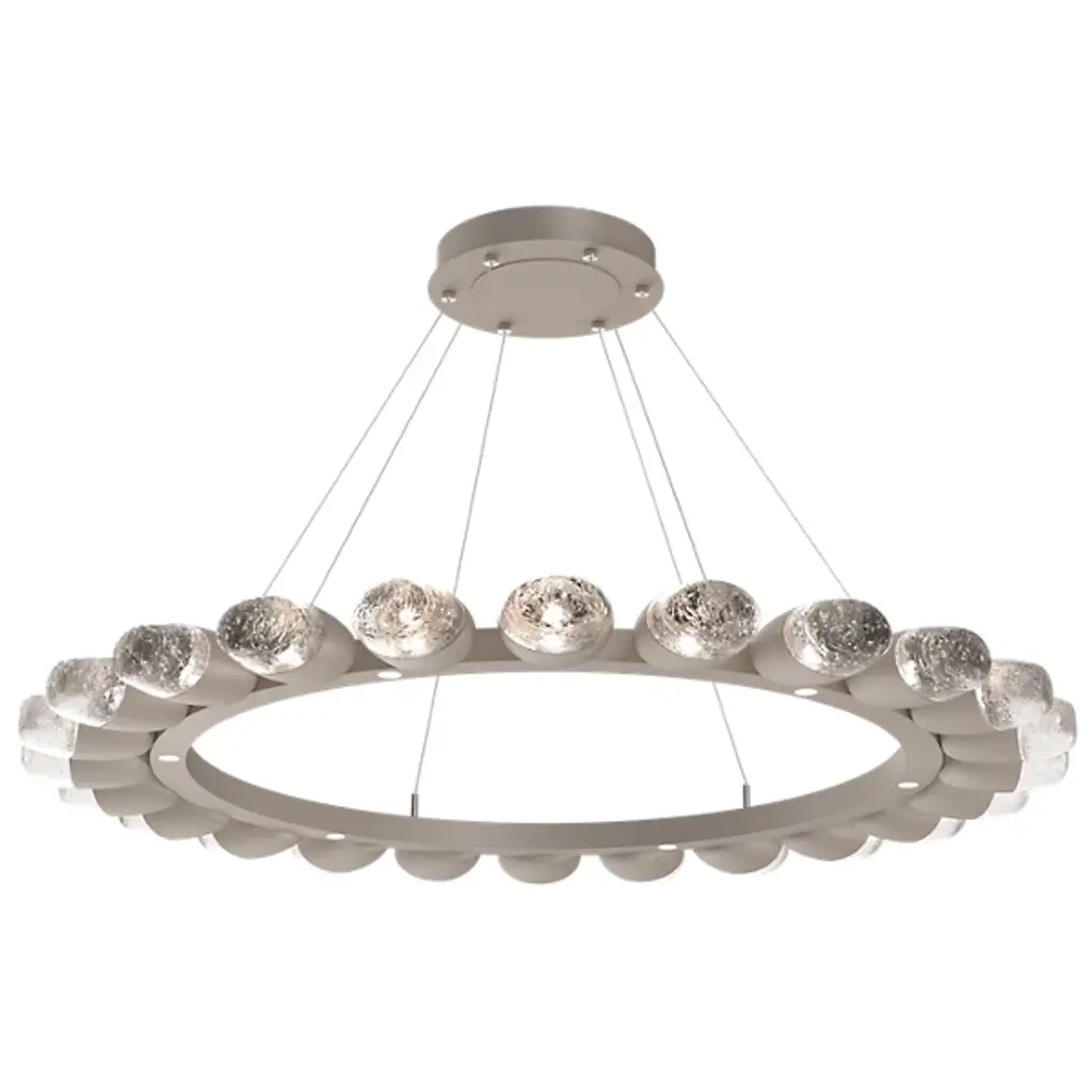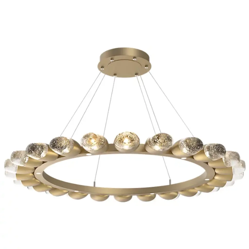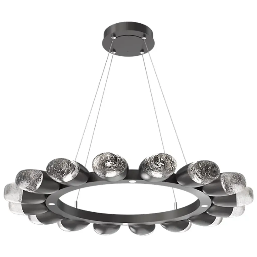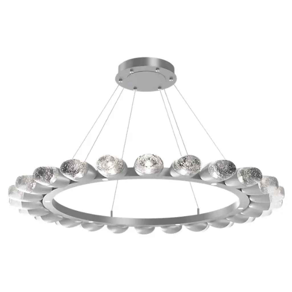 Hammerton Studio presents the Pebble LED Ring Chandelier. It's a versatile ceiling fixture suitable for contemporary and modern spaces. This simple yet elegant chandelier design has juxtaposed beautifully finished precision-machined metalwork with softly illuminated rondelles of artisan cast glass. The glass housings can be positioned at preset angles to create dynamic, spacious light quality.