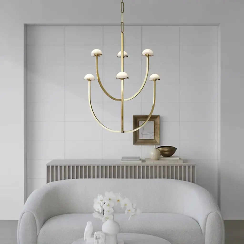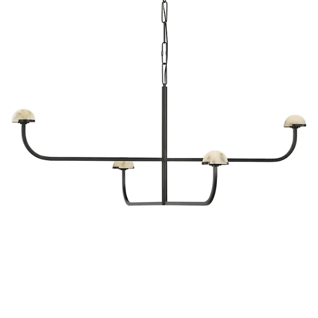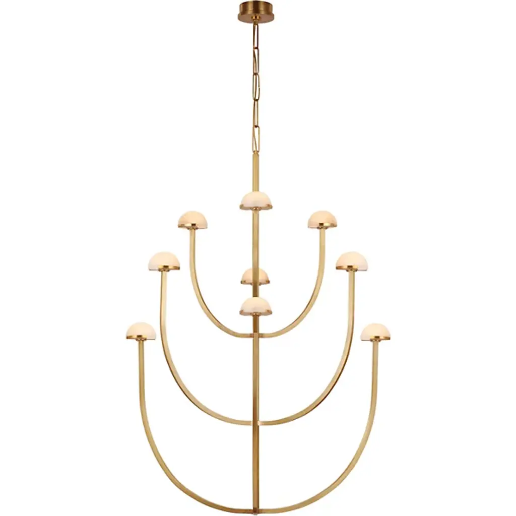 Add a clever curving character to high ceilings with the gracefully appointed Pedra Multi-Tier Chandelier from Visual Comfort Signature, formerly known as Visual Comfort, Anchored by a stepped circular canopy, it extends a set of long chain links to a slender downrod below. This single stem extends two tiers of arms that curve upward, placing a dome-shaped diffuser of natural alabaster over a damp-rated and robust LED lamp. This translucent barrier reduces bright glow to the sides, extending an even layer of light to the sides as a warm, expressive radiance.