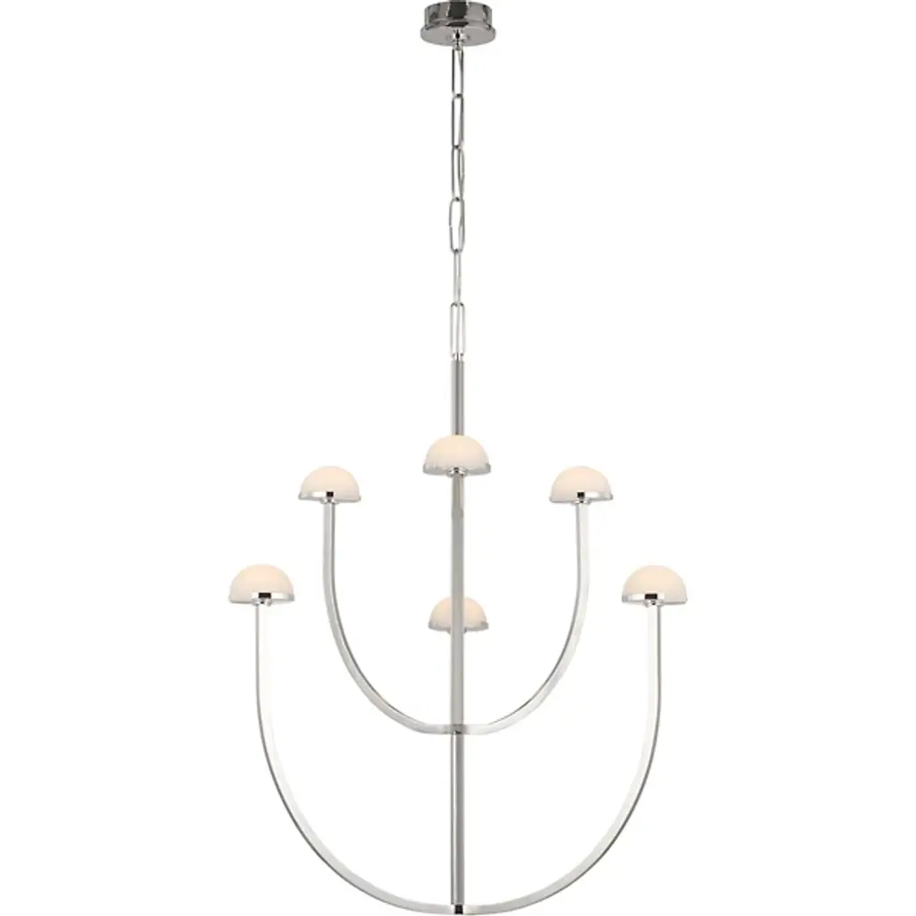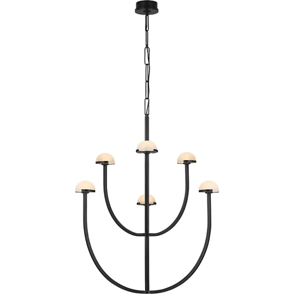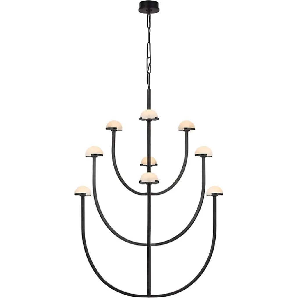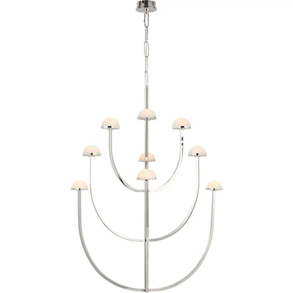 Add a clever curving character to high ceilings with the gracefully appointed Pedra Multi-Tier Chandelier from Visual Comfort Signature, formerly known as Visual Comfort, Anchored by a stepped circular canopy, it extends a set of long chain links to a slender downrod below. This single stem extends two tiers of arms that curve upward, placing a dome-shaped diffuser of natural alabaster over a damp-rated and robust LED lamp. This translucent barrier reduces bright glow to the sides, extending an even layer of light to the sides as a warm, expressive radiance.