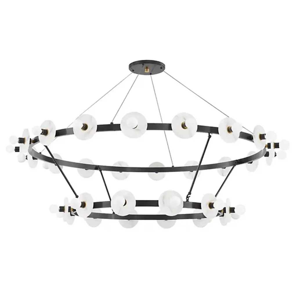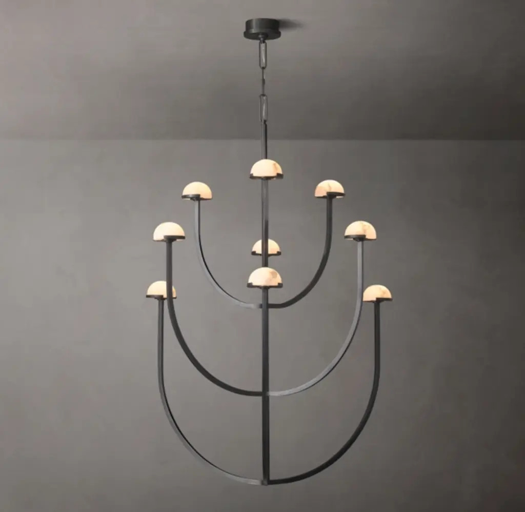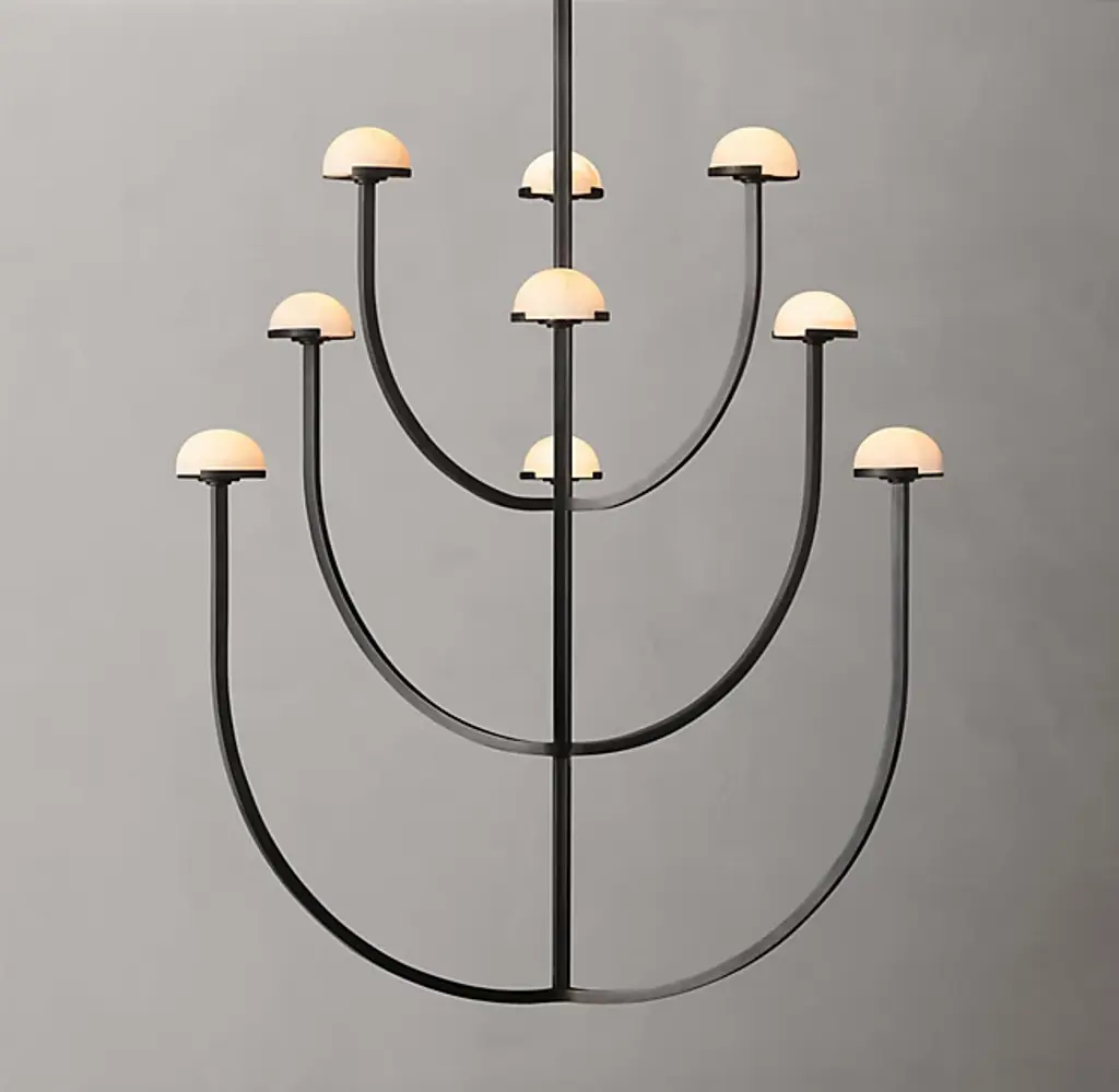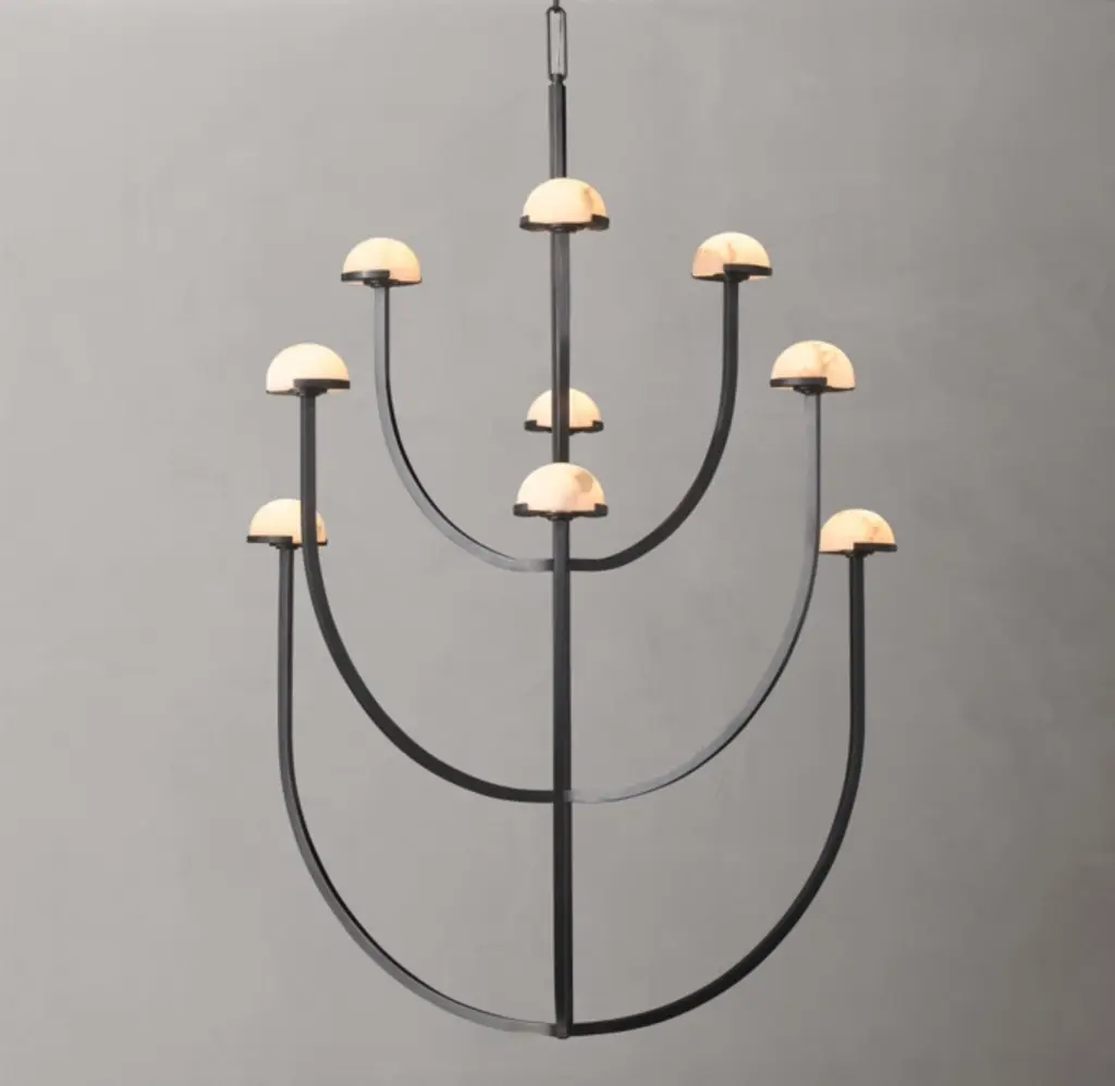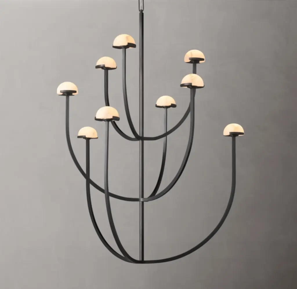 Minimalist in design yet maximalist in effect, our lighting collection was inspired by a midcentury Italian silhouette. Metal armatures reminiscent of architectural tracery support a constellation of dome-shaped, translucent alabaster shades that highlight the stone's natural veining and coloration. The sculptural form emits a warm, filtered glow. SHOP THE ENTIRE COLLECTION
