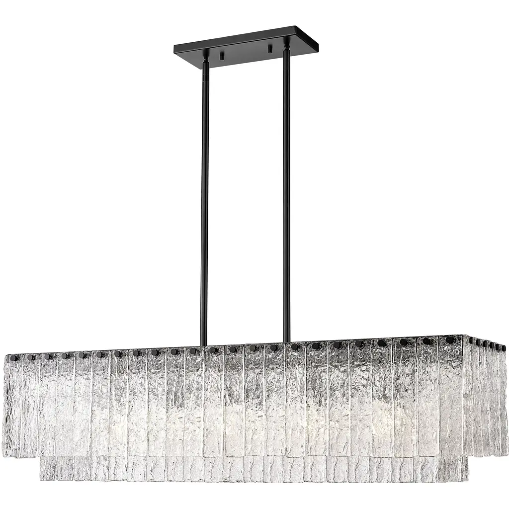 The Pench Medium Linear Chandelier utilizes the coolness of metal married with an LED light source to create a one-of-a-kind linear masterpiece. It balances this with the metal stems at the center of the pendant. Monolithic metal forms are illuminated artfully by an unseen light source within.