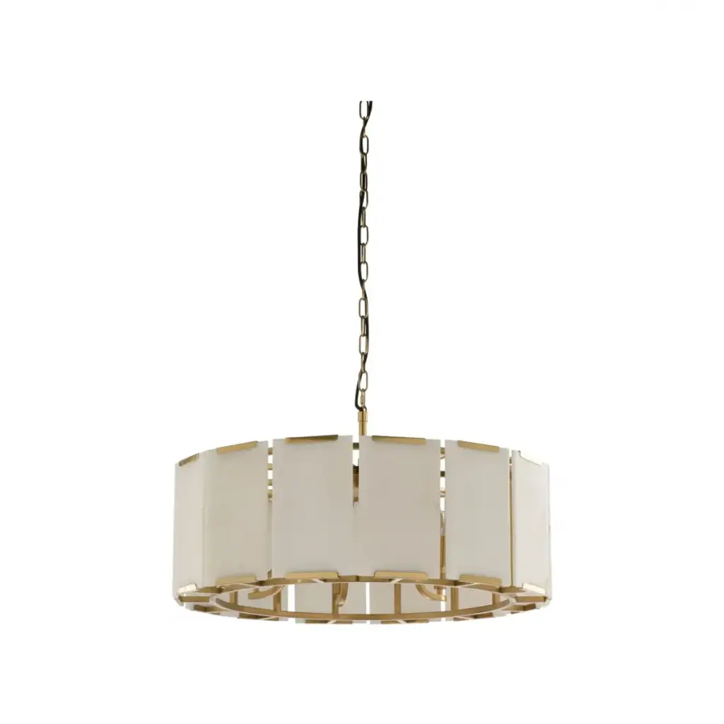 Designed with faceted alabaster panels, the Perla Chandelier is striking whether illuminated or not. The natural stone lends a sense of warm and earthy elegance, while the turned brass arms present a surprising detail when standing beneath.