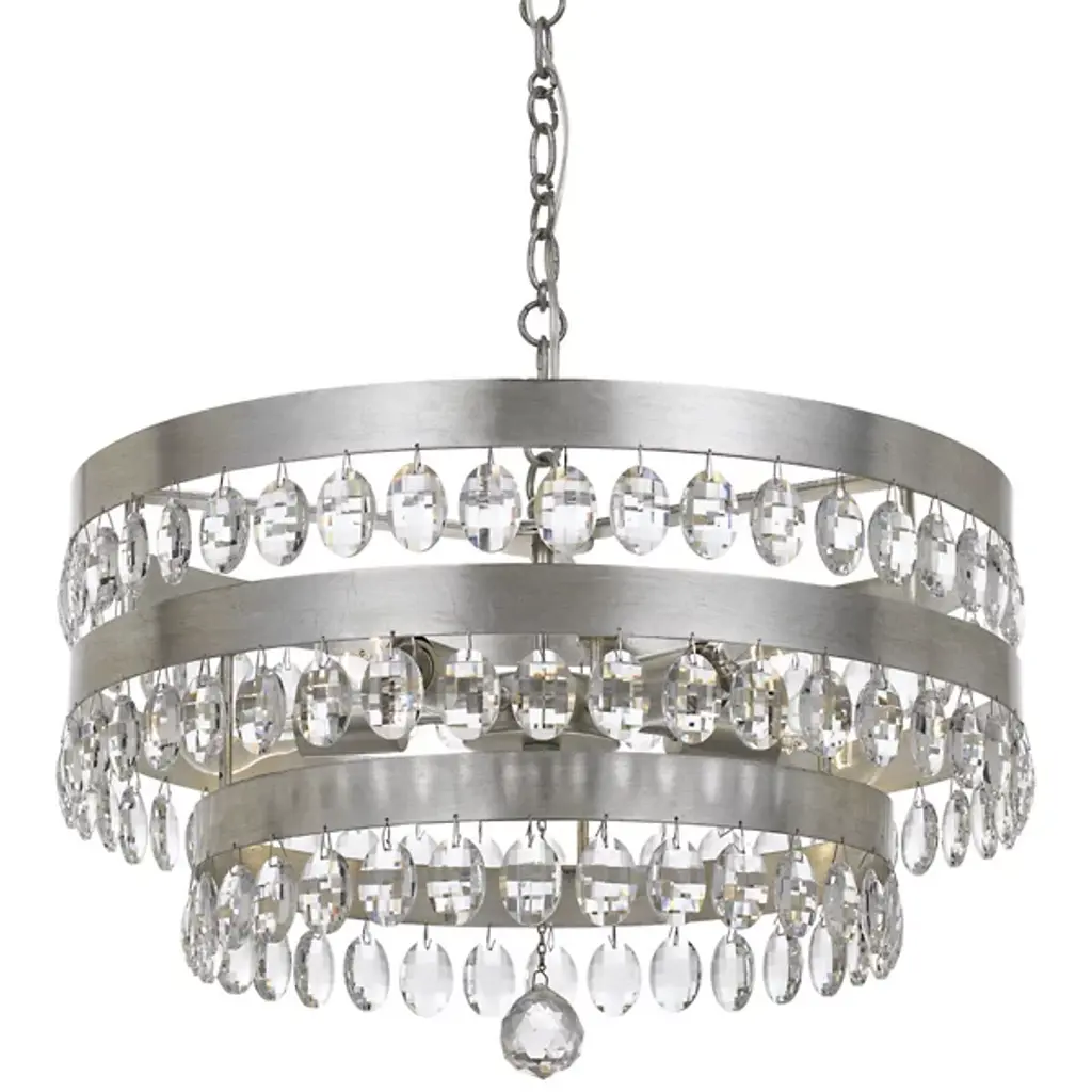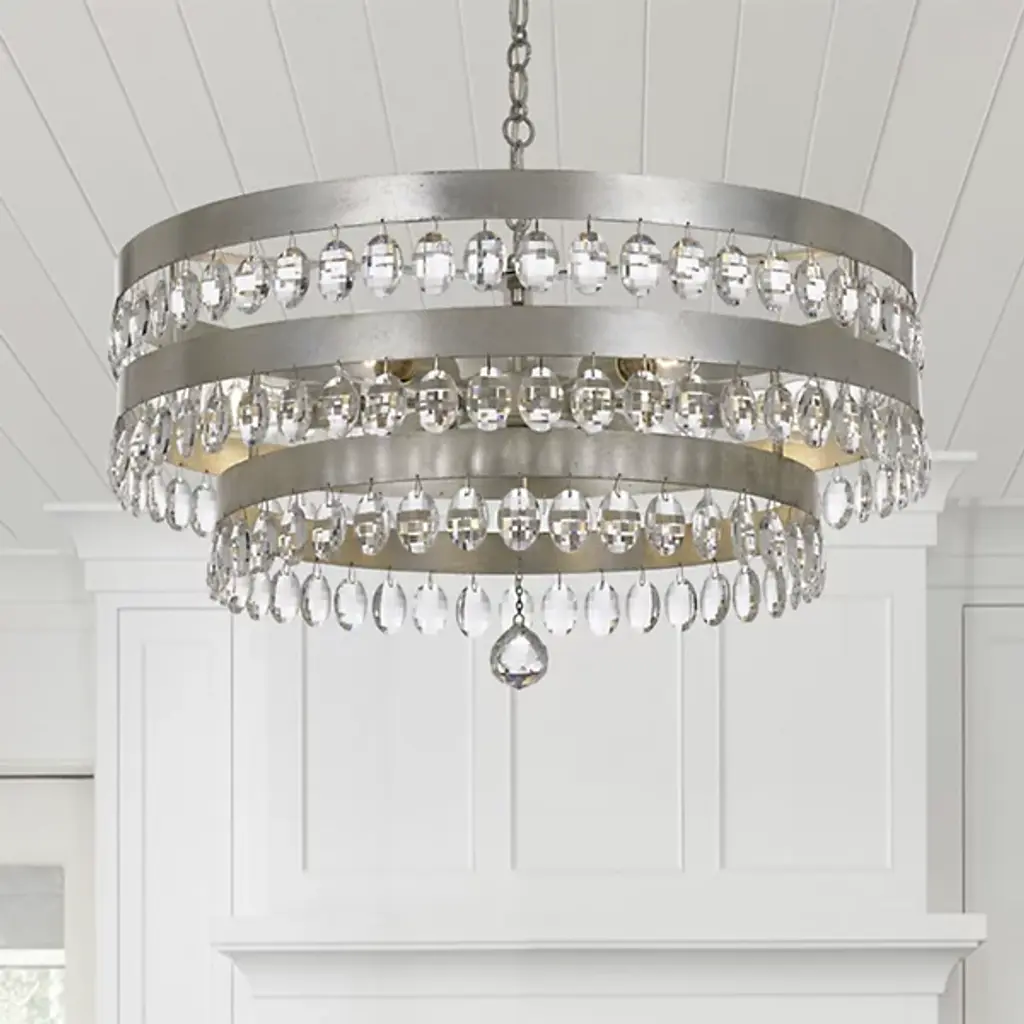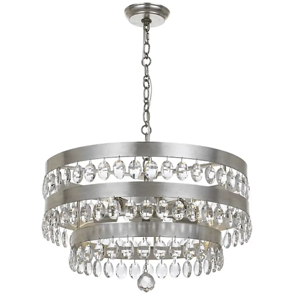 The Crystorama Perla Chandelier takes a traditional material and applies it in a modern context that is fit for a variety of spaces. A series of facet-cut crystals are draped over shimmering ribbons of hand painted wrought iron, the illumination refracting and reflecting throughout the space that has a dynamic effect.