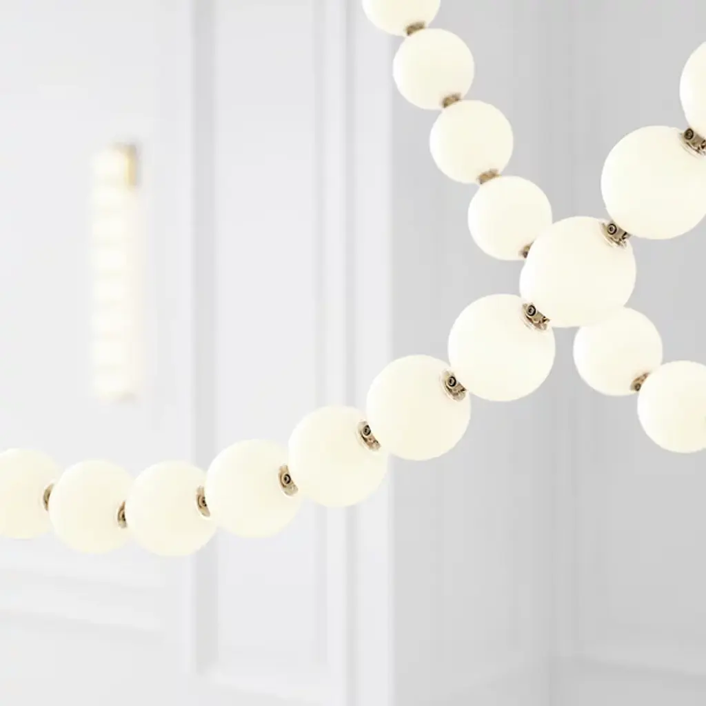 Add inspired elegance to interiors with the bold and wide-reaching Perle 240 LED Chandelier from Visual Comfort Modern. Designed by Sean Lavin to resemble a giant, long necklace of pearls divided from each other by metal beads, it extends down from a contoured, circular canopy, able to arc as needed, to express a natural curving drape. The thick, translucent milk glass of each pearl glows from within, lit by energy-efficient LED lamping and pouring out a gentle glow in all directions.