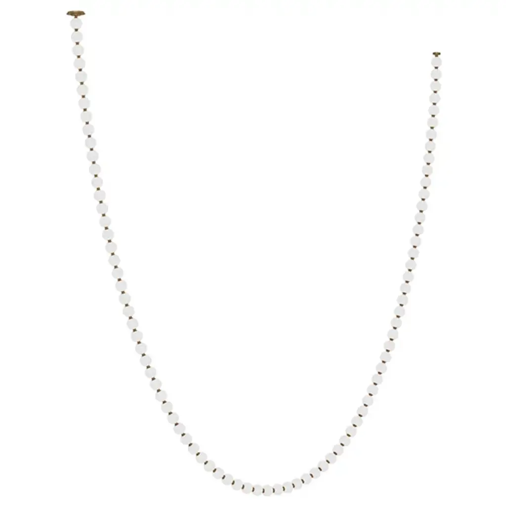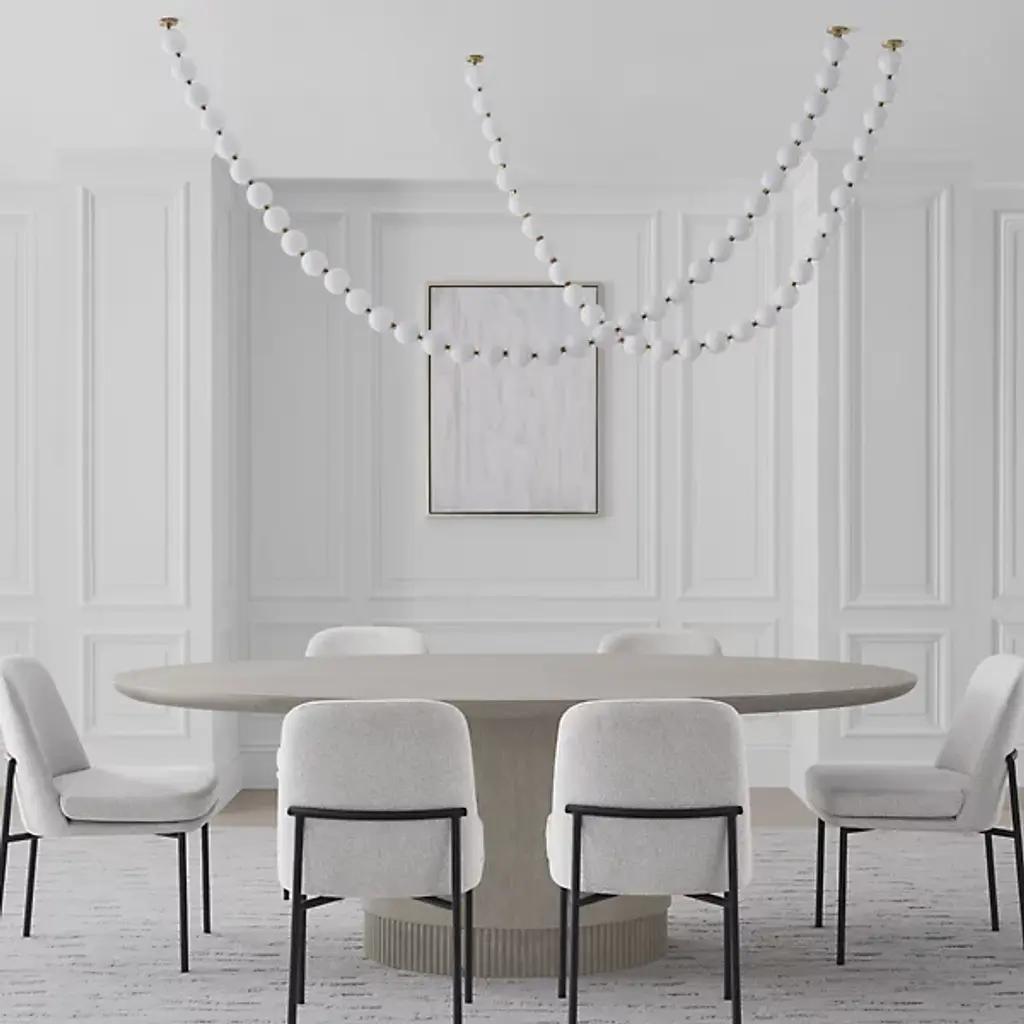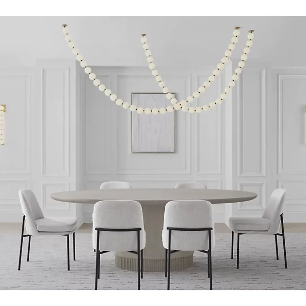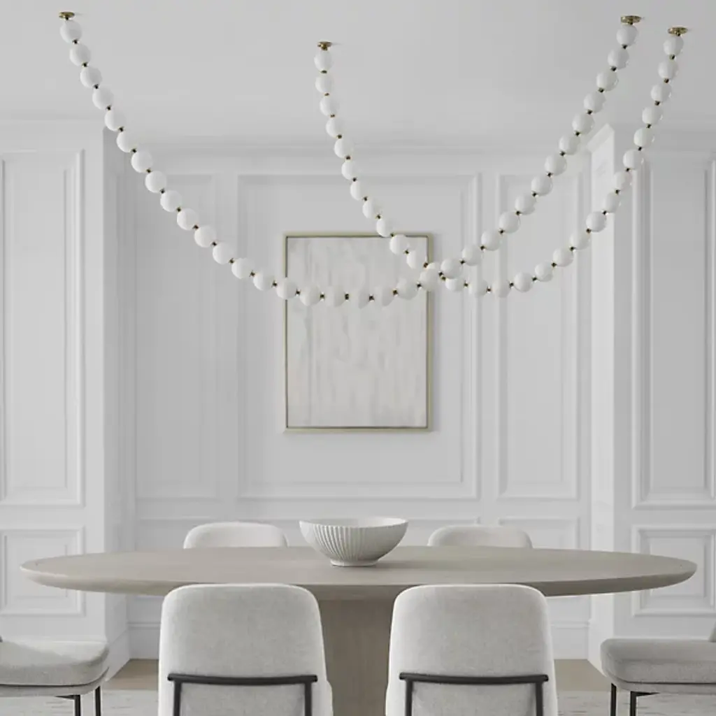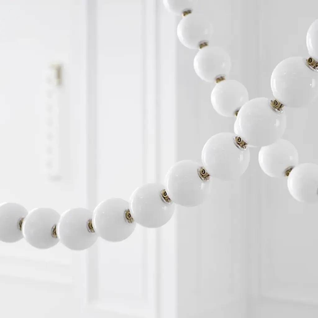 Add inspired elegance to interiors with the bold and wide-reaching Perle 240 LED Chandelier from Visual Comfort Modern. Designed by Sean Lavin to resemble a giant, long necklace of pearls divided from each other by metal beads, it extends down from a contoured, circular canopy, able to arc as needed, to express a natural curving drape. The thick, translucent milk glass of each pearl glows from within, lit by energy-efficient LED lamping and pouring out a gentle glow in all directions.