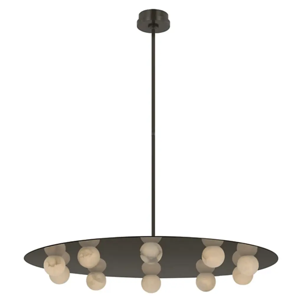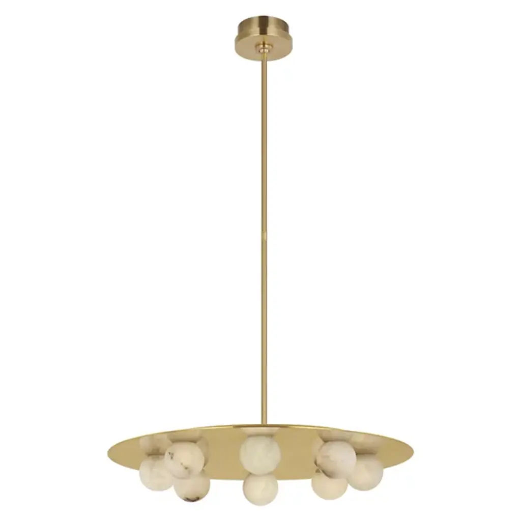 Presented by Visual Comfort Signature, the Pertica LED Chandelier is designed by Kelly Wearstler. Suspended gracefully from the ceiling by a slender and minimal down rod, the Pertica chandelier appears like an otherworldly vessel, hovering in the air to provide a dramatic display of light and style. Its flat, saucer-shaped silhouette is crafted from metal, serving as a captivating foundation for multiple orbs of alabaster shading that adorn its outer perimeter. The chandelier features eco-friendly integrated LED illumination, casting an inviting glow that enhances the atmosphere of your space.