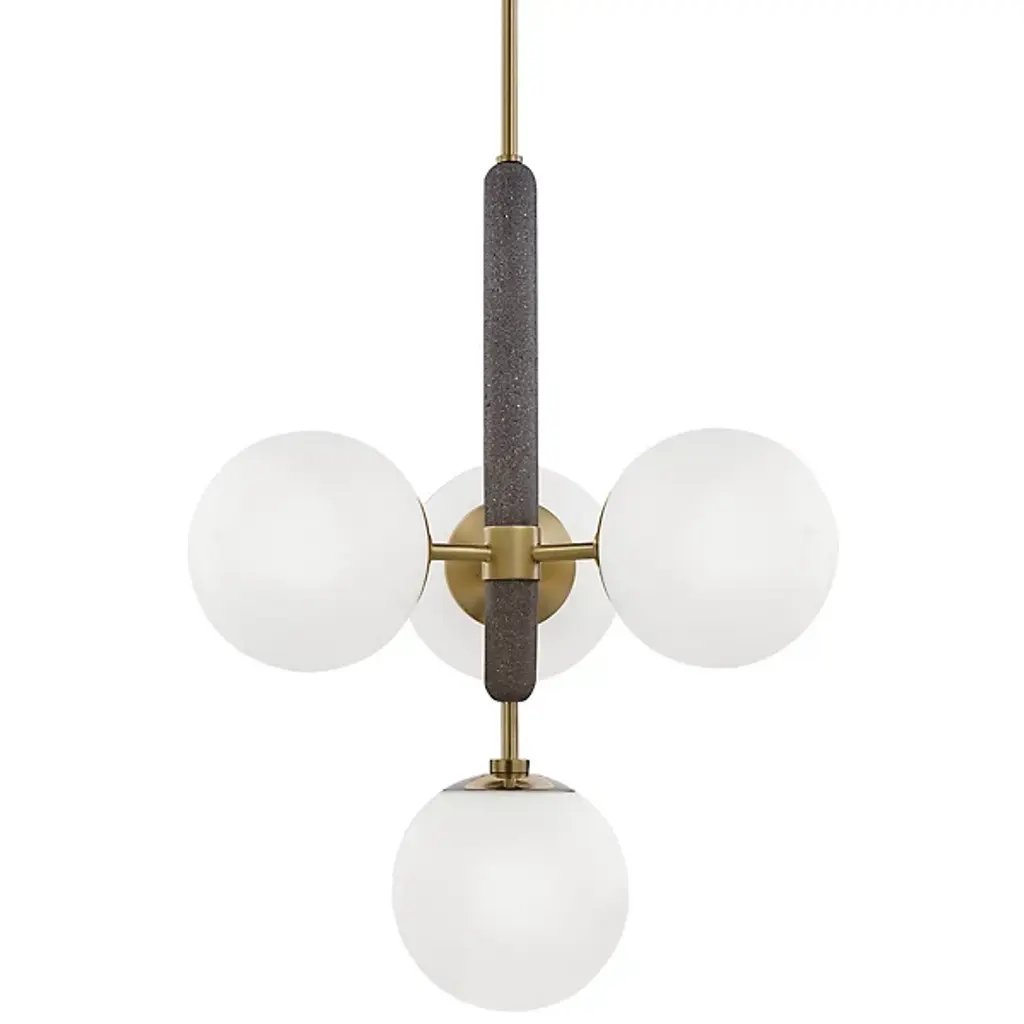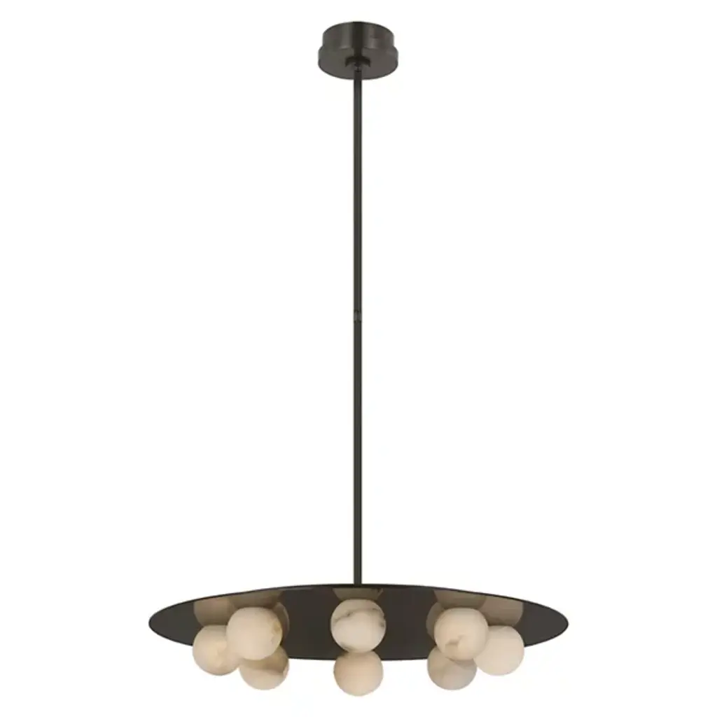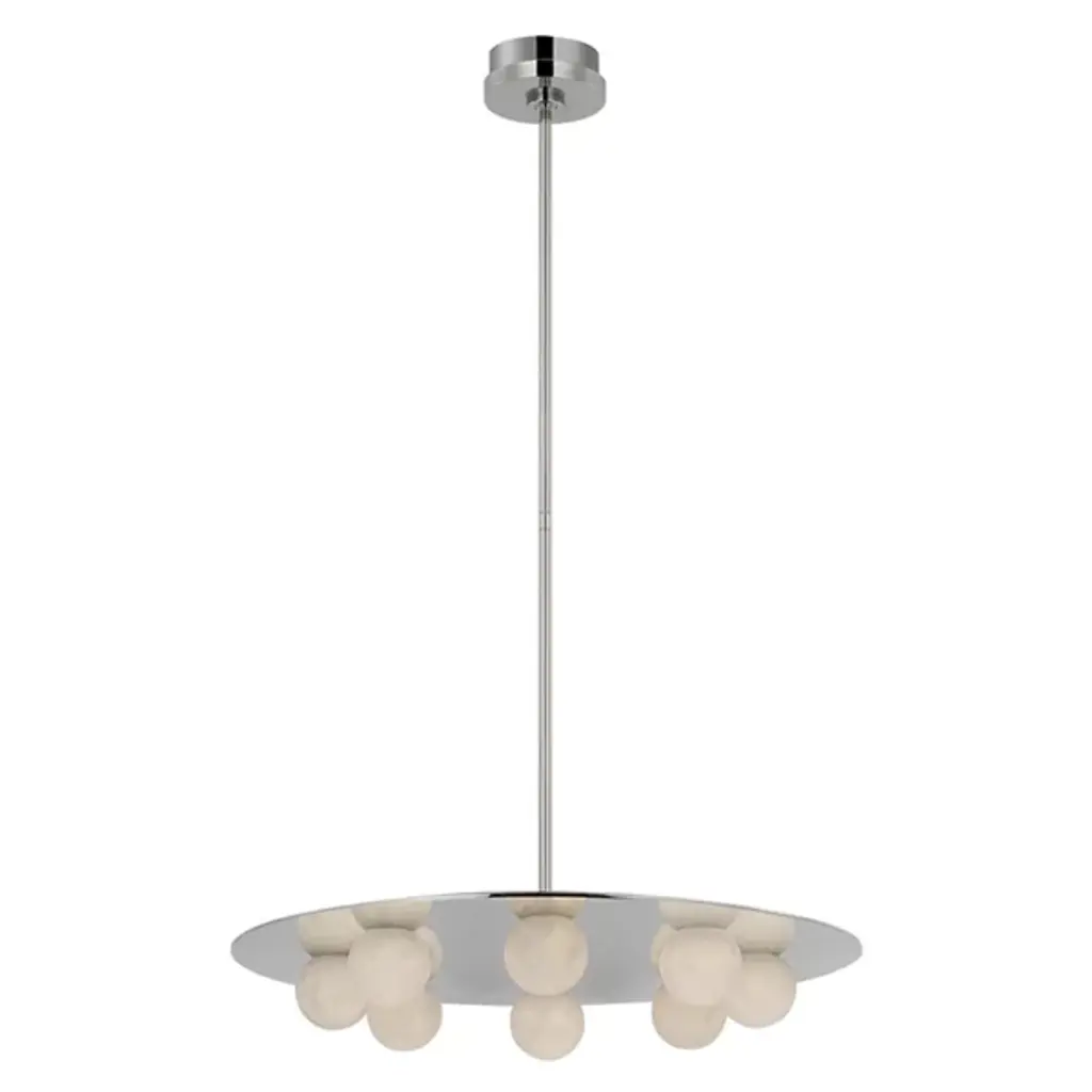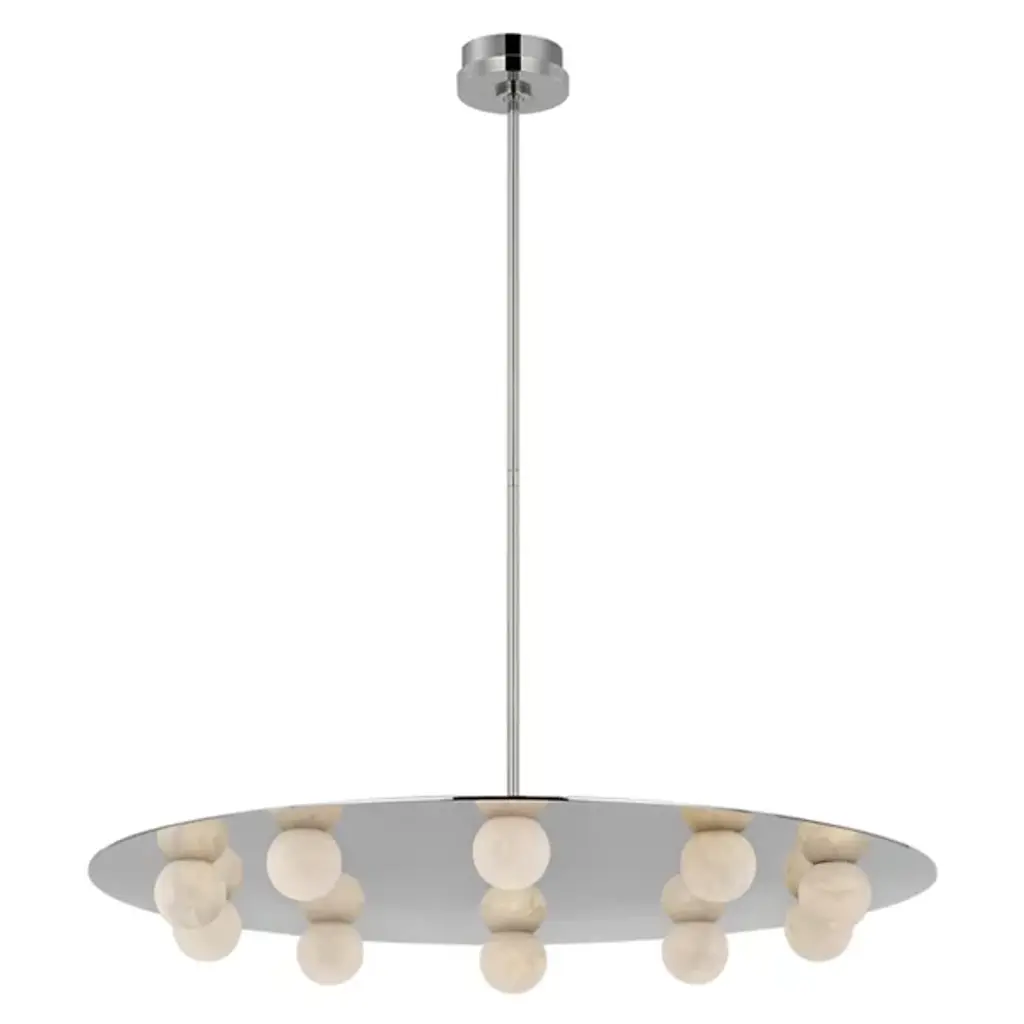 Presented by Visual Comfort Signature, the Pertica LED Chandelier is designed by Kelly Wearstler. Suspended gracefully from the ceiling by a slender and minimal down rod, the Pertica chandelier appears like an otherworldly vessel, hovering in the air to provide a dramatic display of light and style. Its flat, saucer-shaped silhouette is crafted from metal, serving as a captivating foundation for multiple orbs of alabaster shading that adorn its outer perimeter. The chandelier features eco-friendly integrated LED illumination, casting an inviting glow that enhances the atmosphere of your space.
