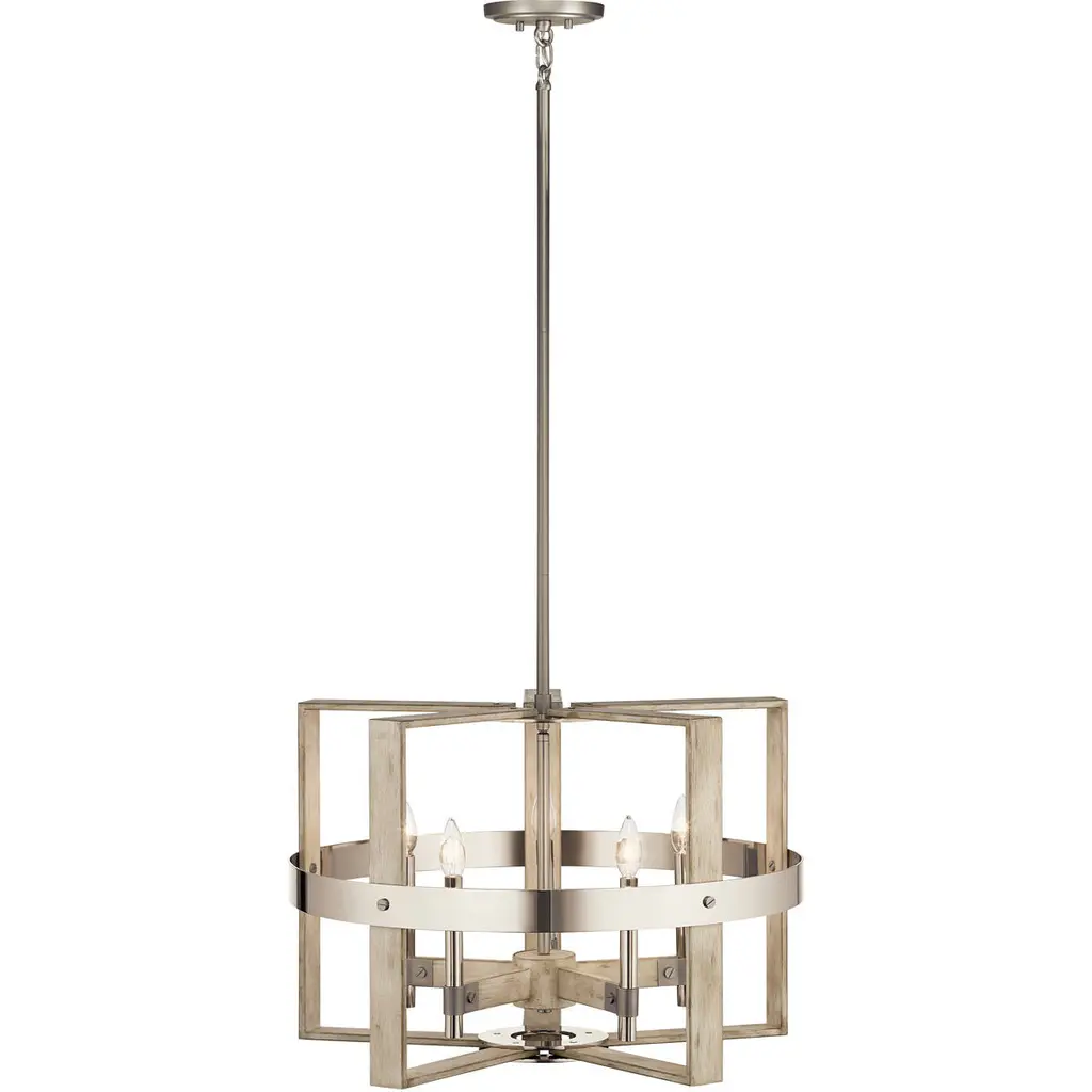 The popular industrial-inspired cage look gets a refreshing update with the Peyton collection 5 light chandelier. Squared edges and lines, in a blend of whitewashed wood tones as well as polished and satin nickel metals, create a style that's soft and modern.