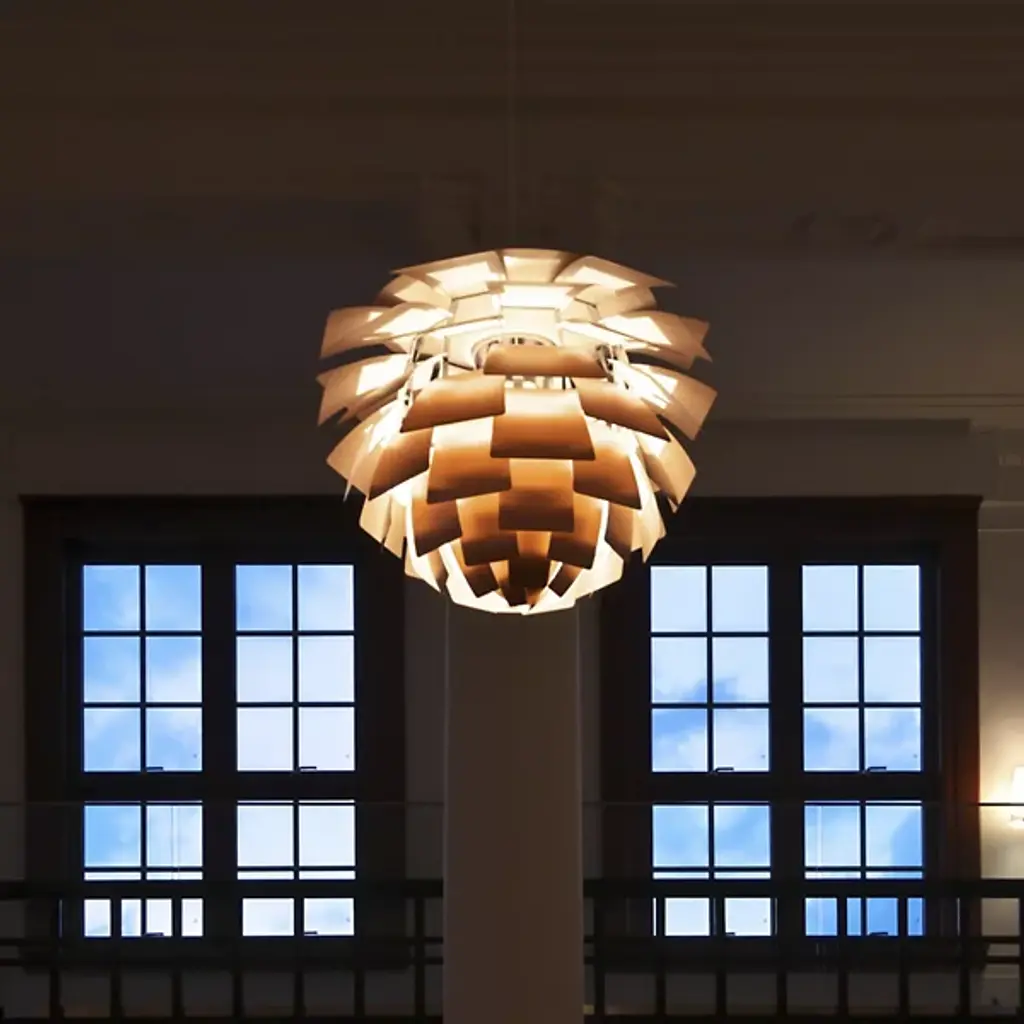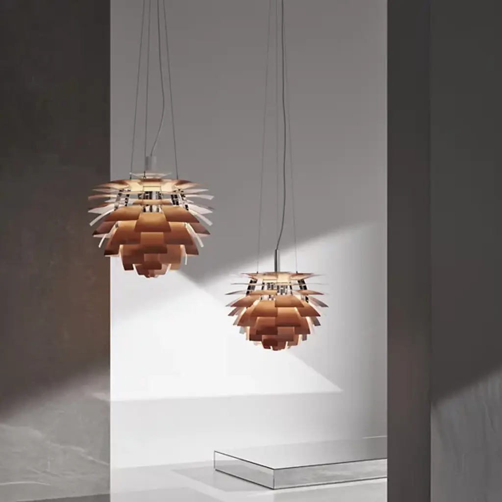 The Louis Poulsen PH Artichoke Chandelier by Louis Poulsen elevates expansive living areas with its captivating design. Poul Henningsen's thoughtful creation is a refined rendition of the original 1958 piece crafted for Copenhagen's Langelinie Pavilionen Restaurant. Its gracefully curved cast aluminum ribs hang in alignment from an upper canopy via cables, adorned with seventy-two leaves meticulously hand-mounted across 12 tiers. Each leaf conspires to diffuse direct glare from the lamping, casting a gentle downward glow while emanating a generous ambient light. This sculptural and arresting design features a luxurious, vibrant form that adds a layered yet organic charm to any space.