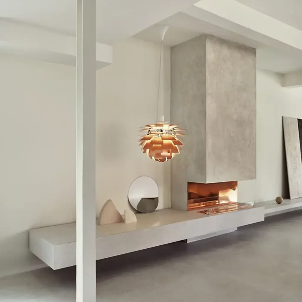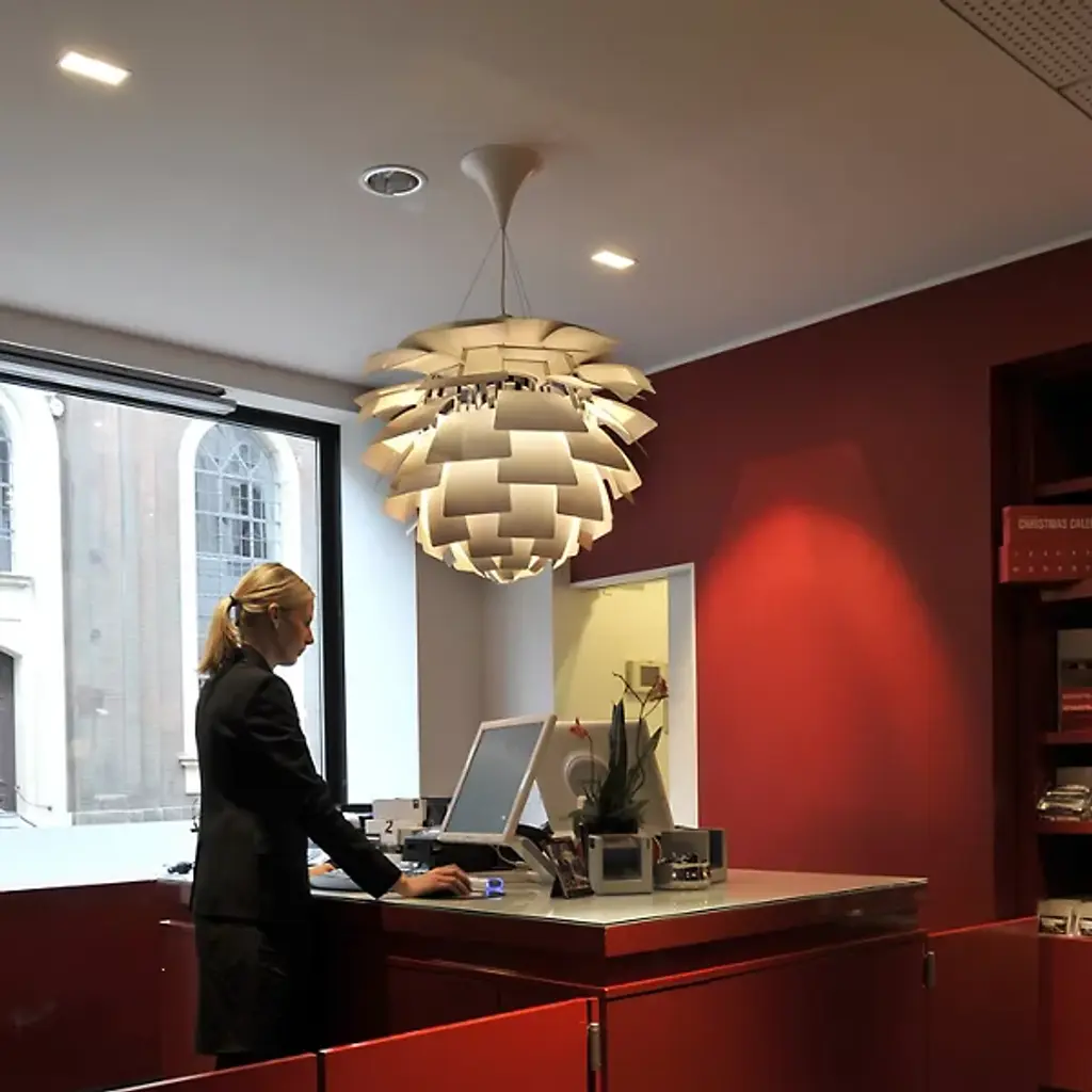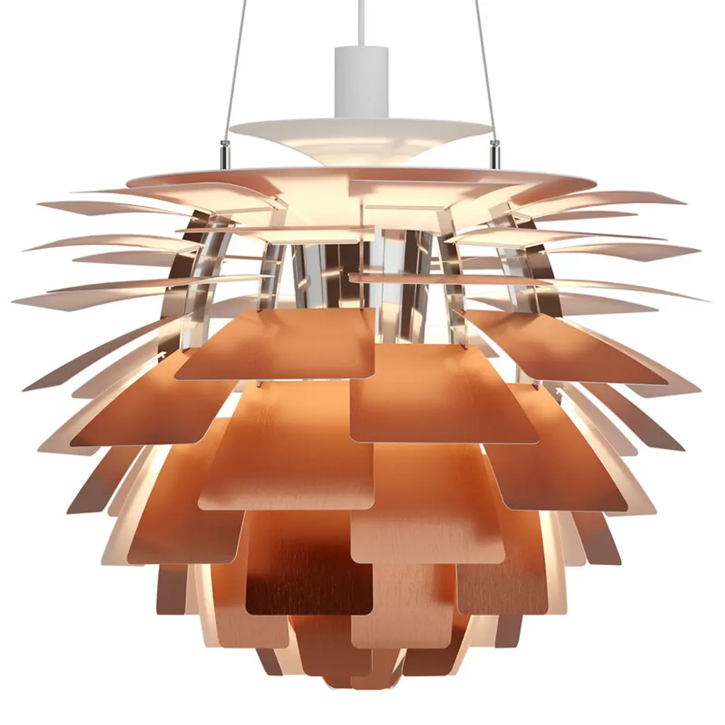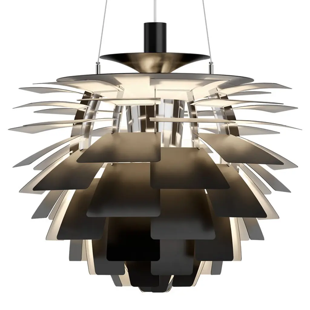 The Louis Poulsen PH Artichoke Chandelier by Louis Poulsen elevates expansive living areas with its captivating design. Poul Henningsen's thoughtful creation is a refined rendition of the original 1958 piece crafted for Copenhagen's Langelinie Pavilionen Restaurant. Its gracefully curved cast aluminum ribs hang in alignment from an upper canopy via cables, adorned with seventy-two leaves meticulously hand-mounted across 12 tiers. Each leaf conspires to diffuse direct glare from the lamping, casting a gentle downward glow while emanating a generous ambient light. This sculptural and arresting design features a luxurious, vibrant form that adds a layered yet organic charm to any space.