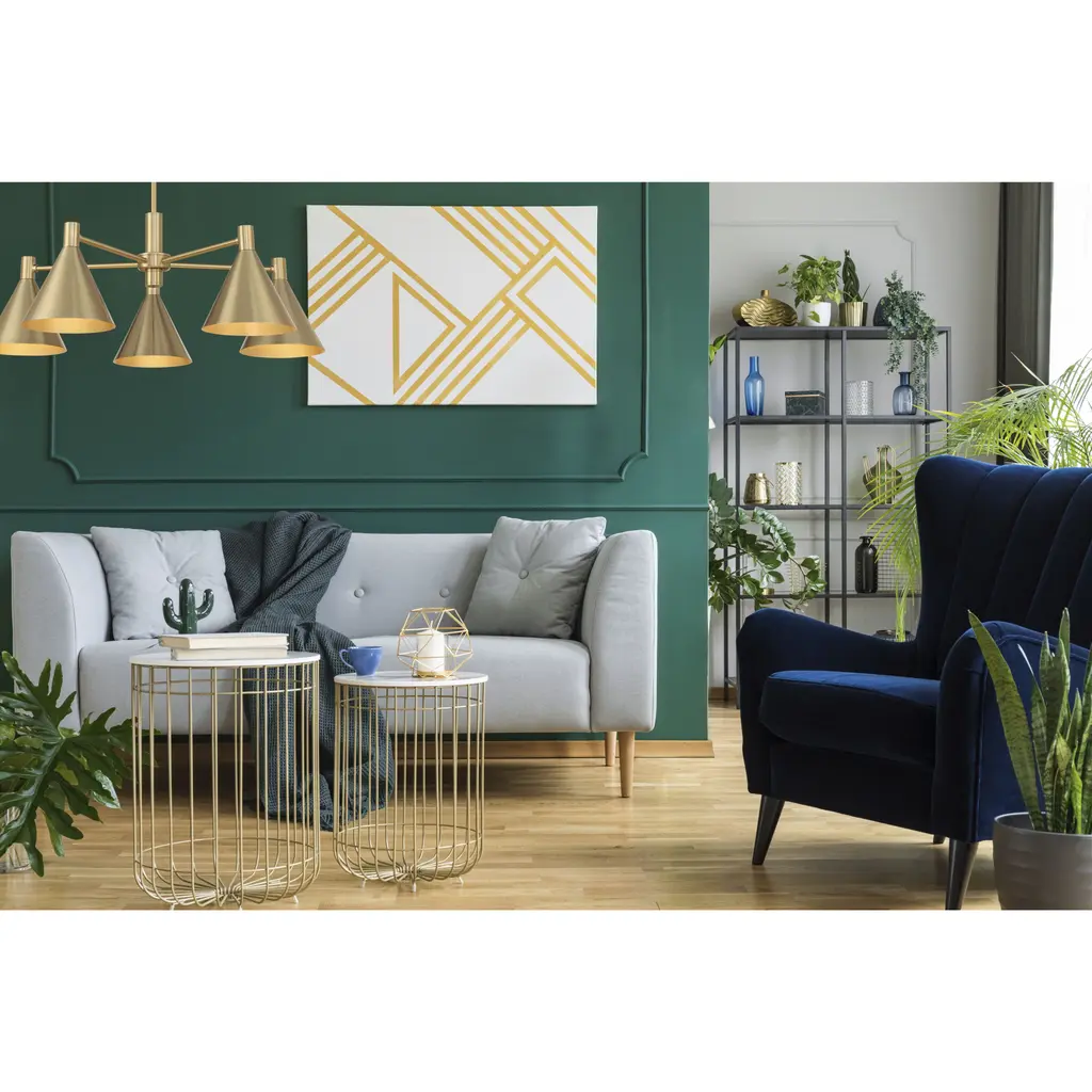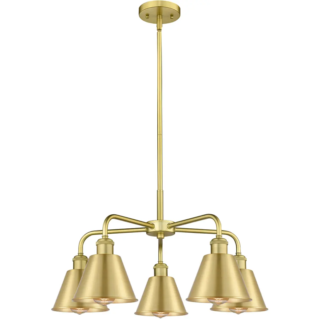 The Savoy House Pharos 5-light chandelier is part of Moderne by Breegan Jane, bringing her signature approachable modern luxury style to your home. Breegan loves how metallics elevate a design, as exemplified by the opaque metal shades finished entirely in champagne-toned Noble Brass. The shades can be adjusted, providing different angles of light to meet your needs. Pharos is 30" in width and has an adjustable height ranging from 11" to 65". Comes with four 12" downrods and one 6" downrod. Uses five candelabra size bulbs of up to 60 watts per bulb. Bulbs not included.