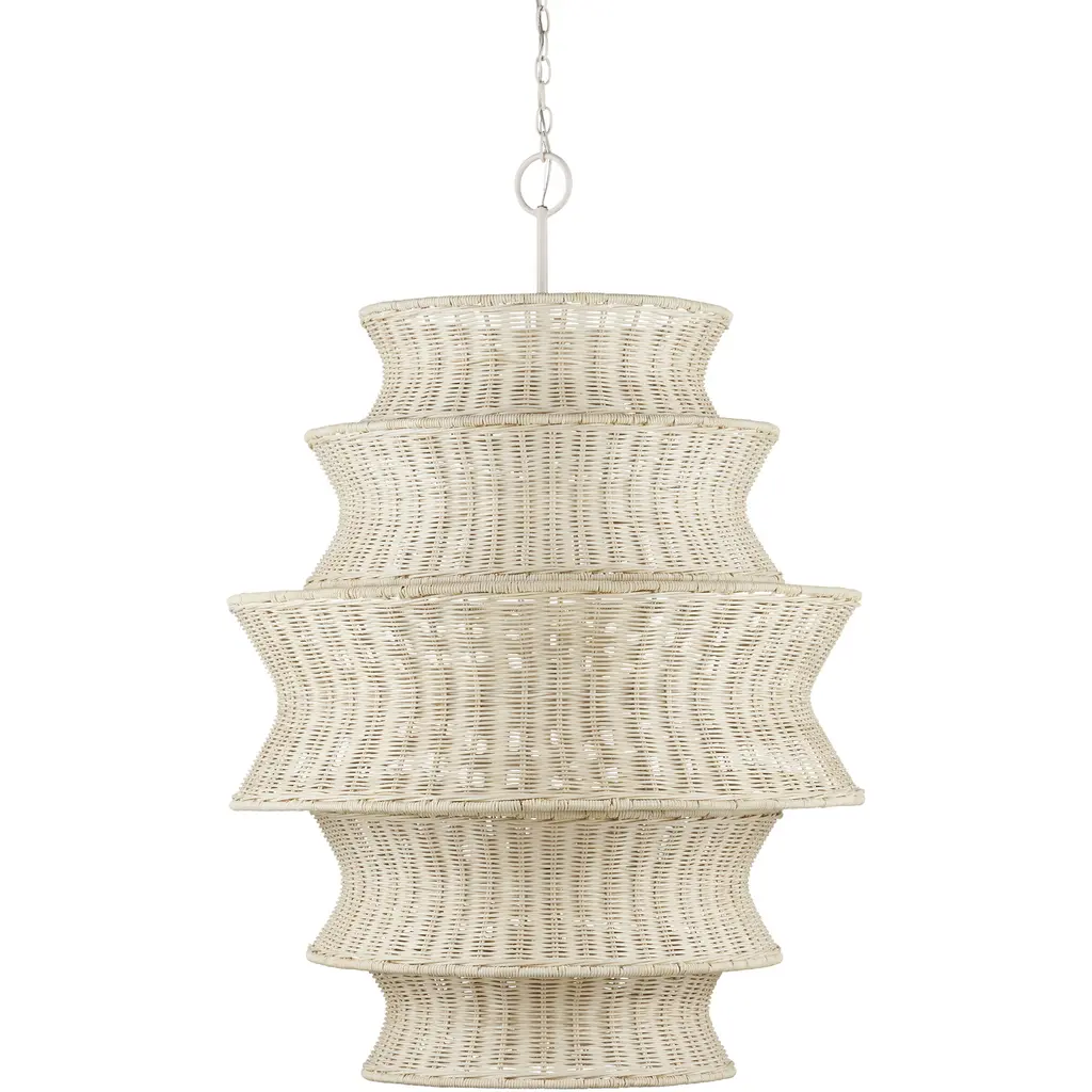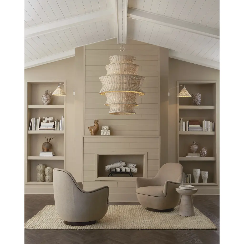 The Phebe Large Rattan Chandelier is a dynamic design by Clarence Mallari that showcases the talents of our weavers and his own skill at working with natural materials. The five-tier white chandelier has such a cohesive appearance because the circular wire frames are wrapped in the same material, then the entire fixture has been bleached. The vanilla finish of the hardware keeps the design light and airy. Clarence was inspired by a natural material story when he designed the Phebe.