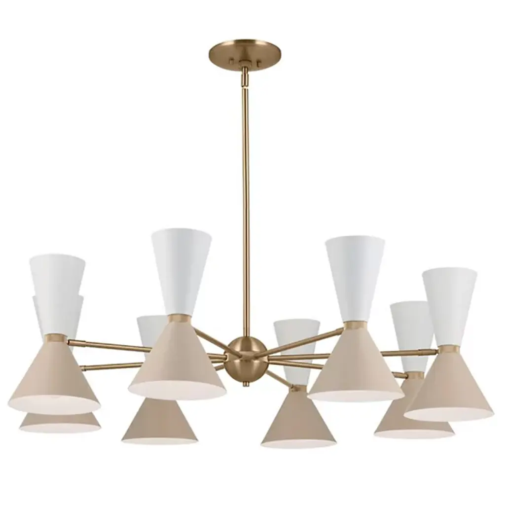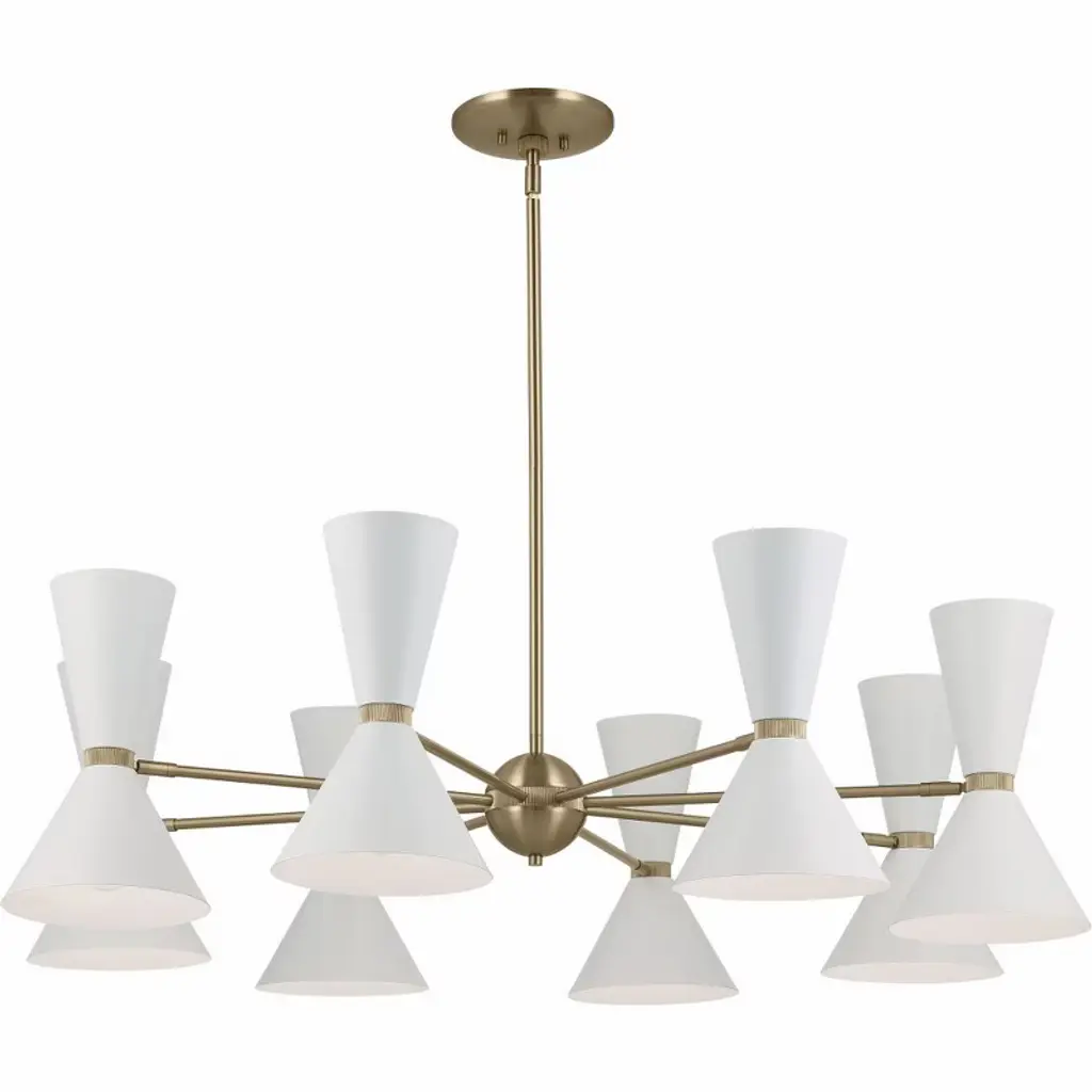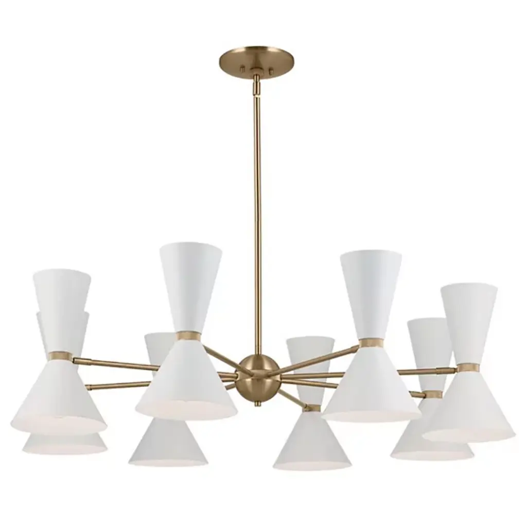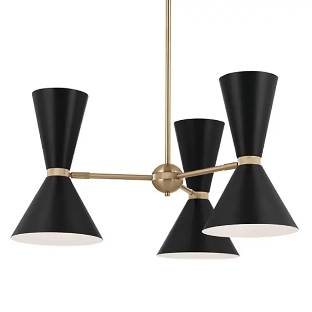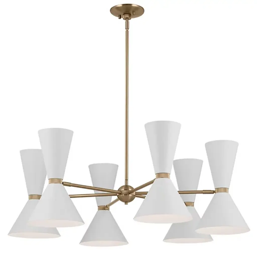 The Phix Chandelier by Kichler features an intricate, geometric design that will liven any contemporary space. Asymmetrical, conical shades extend from a small, spherical center and funnels light both upward and downward for a stunning ambient effect. In addition, the fixture’s dimmable LED technology allows you to create the perfect lighting environment. A modern take on a classic mid-century silhouette, Phix is the signature piece your space craves.