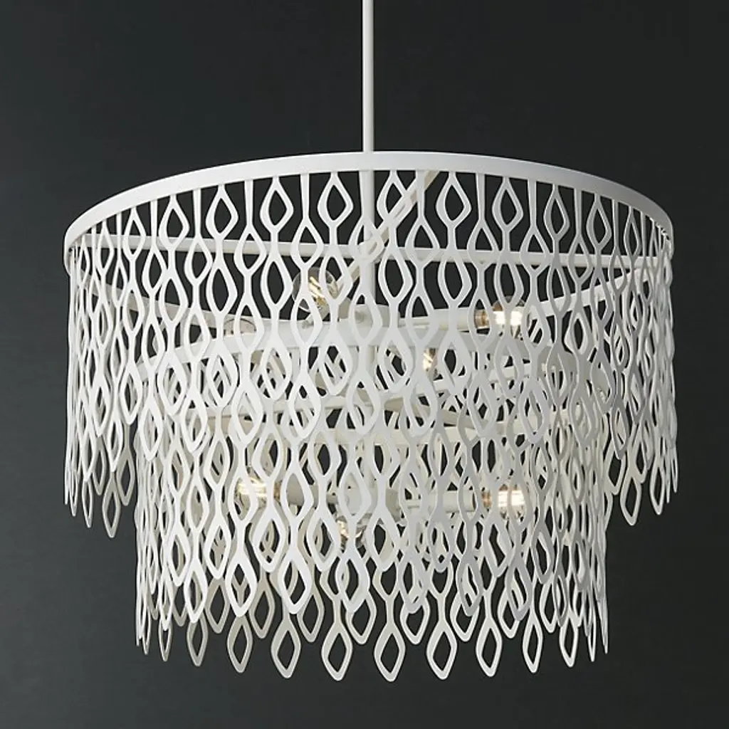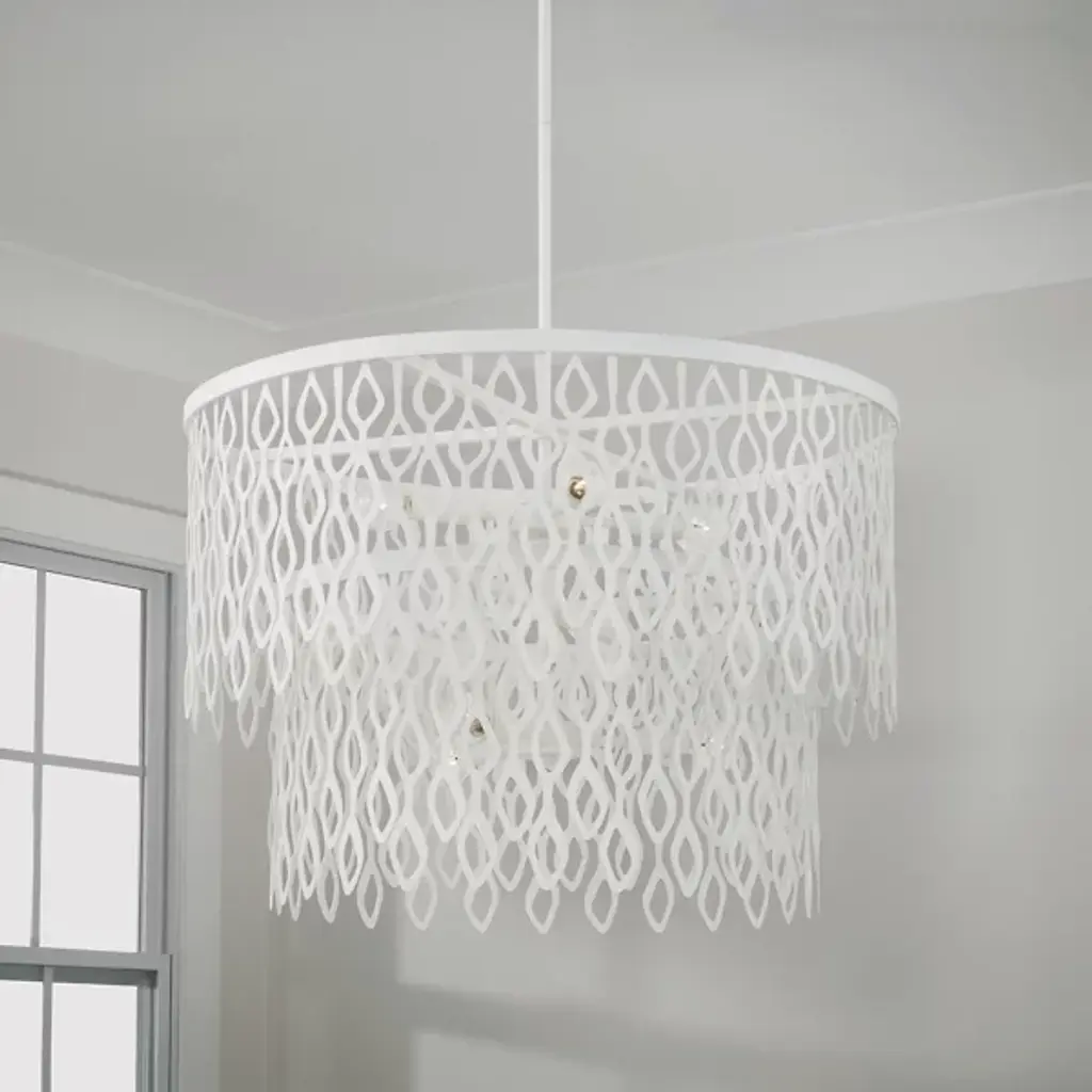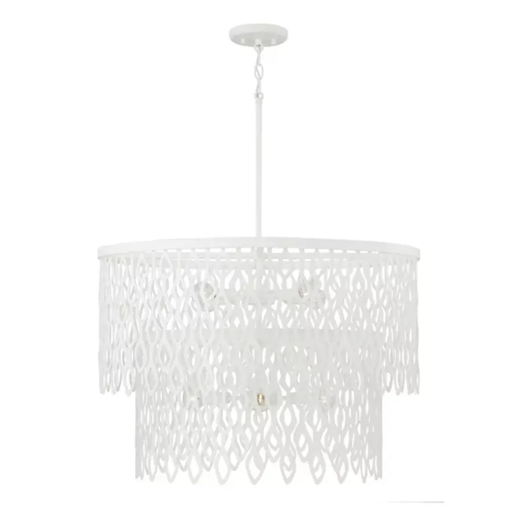 The Phoebe Chandelier from Capital Lighting resembles a waterfall of light, its two-tier design an absorbing dance of shadows and light. Laser-cut patterns adorn its metal frame, creating a lace-like effect that transforms your space into a theater of light. Its modern glamour invites wonder and admiration, making it a stunning sculptural centerpiece for grand foyers or sophisticated dining spaces.