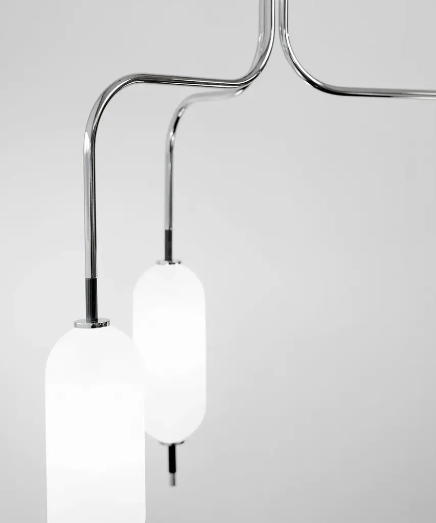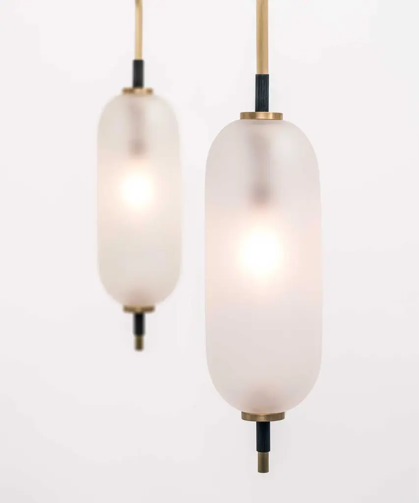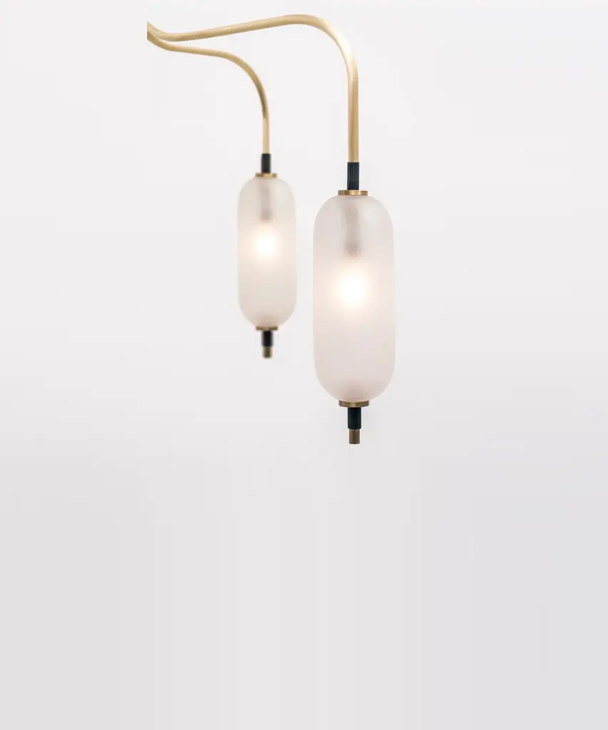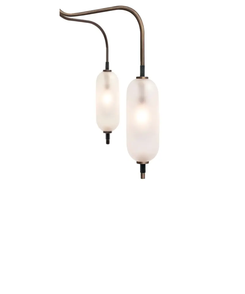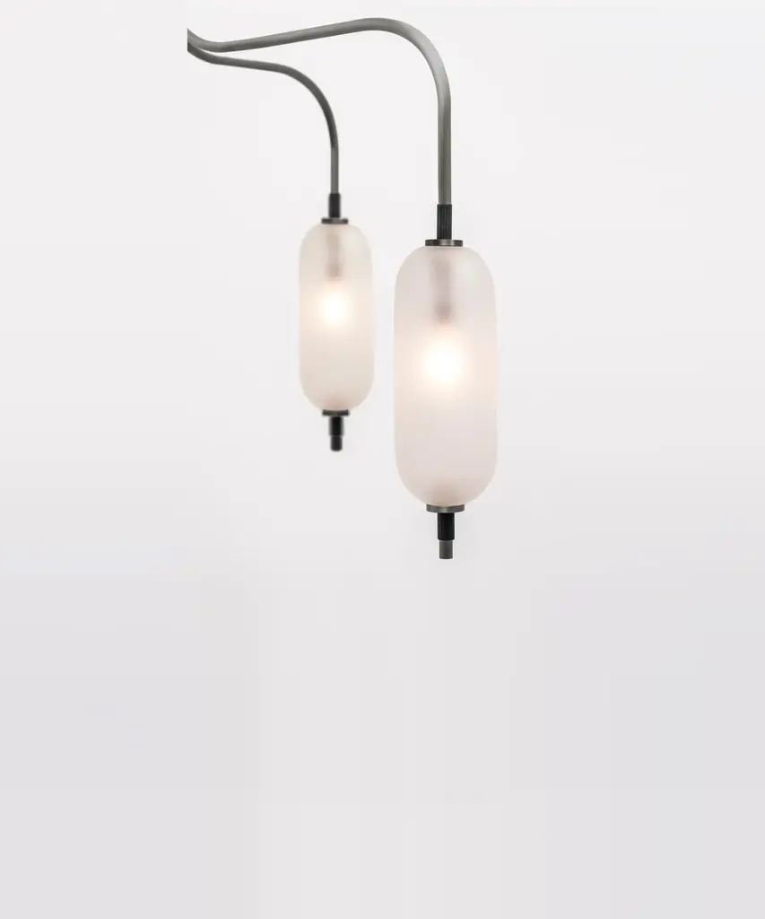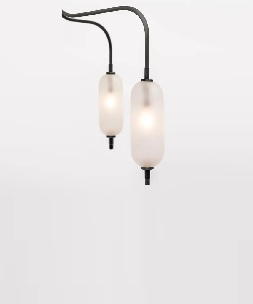 A jewel-inspired lighting series, composed of delicate metal stems and handblown, sandblasted glass orbs. The bulb inside the orb emits a diffused glow from the center of its core, for a warm, atmospheric setting. The collection is made-to-order and is available in a range of finish options. Please note, that the chandelier assumes a 25" rod length, however, it is easily customizable upon request (please email us at help@trnk-nyc.com with your specifications). Each piece is designed and hand-produced by Coil + Drift, a lauded New York's Catskill Mountains-based design studio known for its vividly three-dimensional and material-forward collections.
