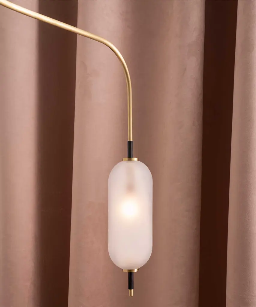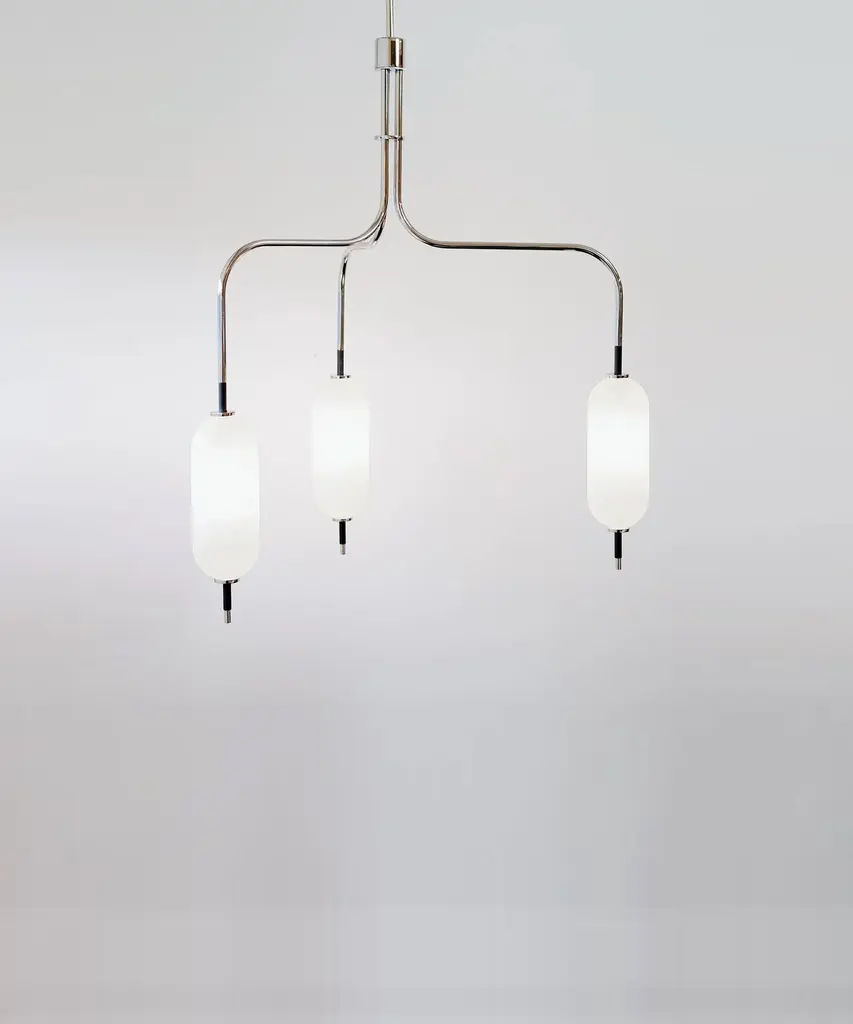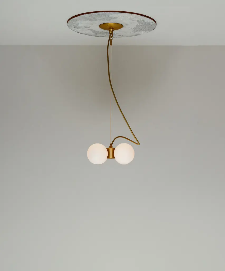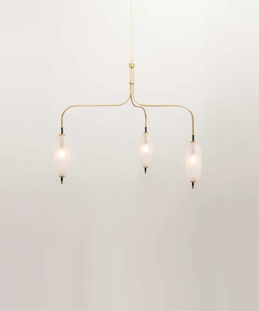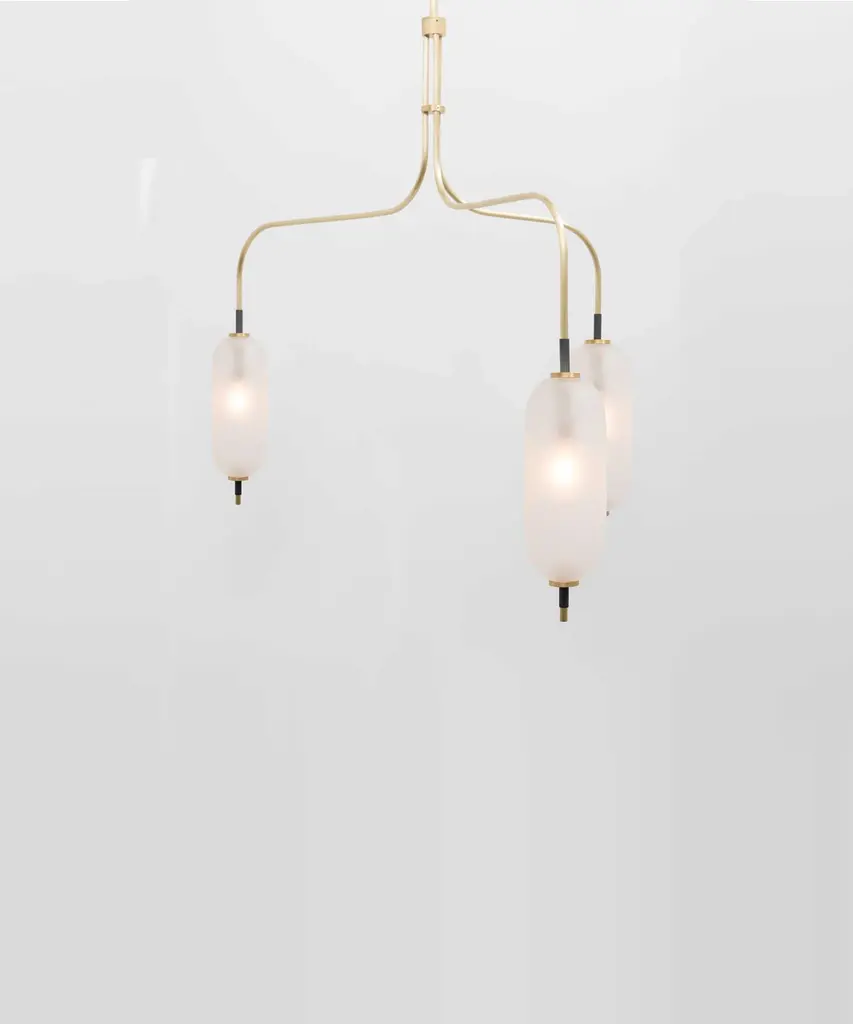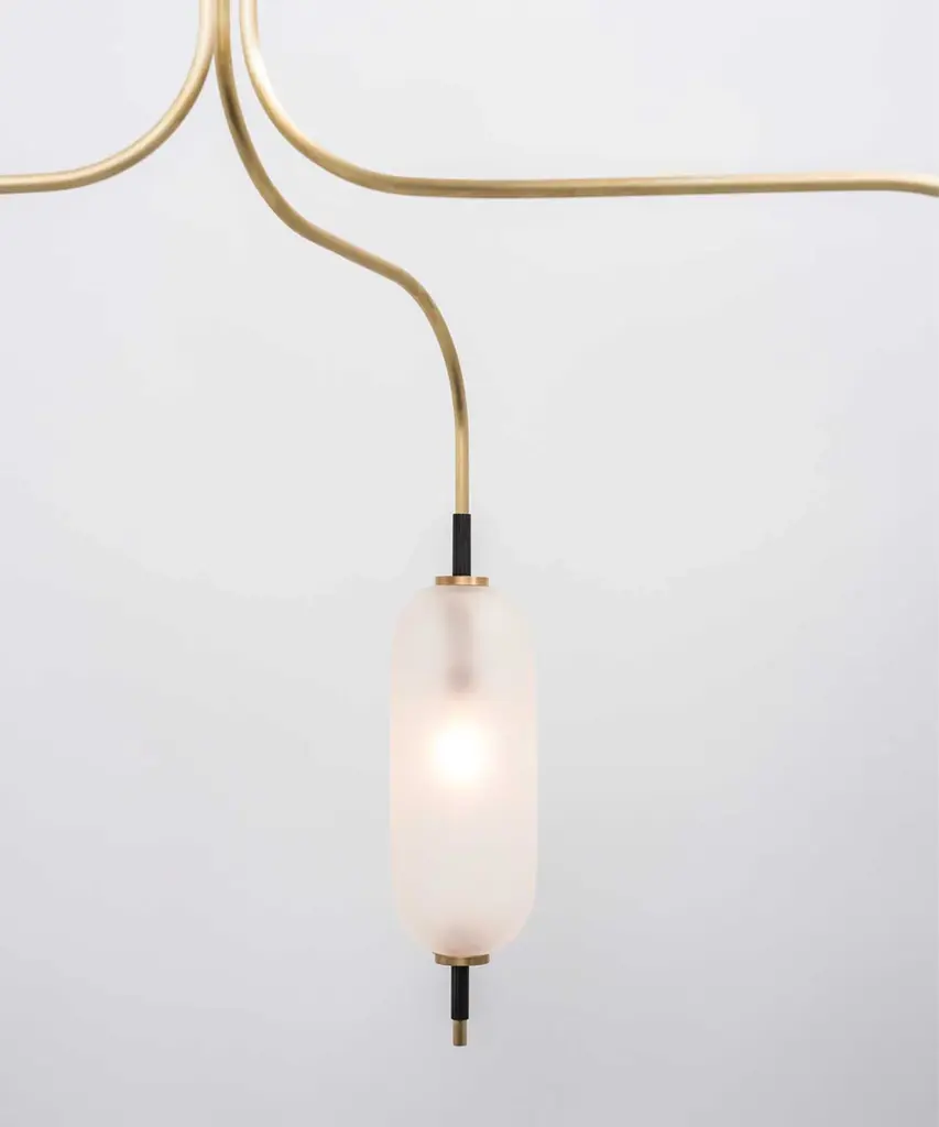 A jewel-inspired lighting series, composed of delicate metal stems and handblown, sandblasted glass orbs. The bulb inside the orb emits a diffused glow from the center of its core, for a warm, atmospheric setting. The collection is made-to-order and is available in a range of finish options. Please note, that the chandelier assumes a 25" rod length, however, it is easily customizable upon request (please email us at help@trnk-nyc.com with your specifications). Each piece is designed and hand-produced by Coil + Drift, a lauded New York's Catskill Mountains-based design studio known for its vividly three-dimensional and material-forward collections.