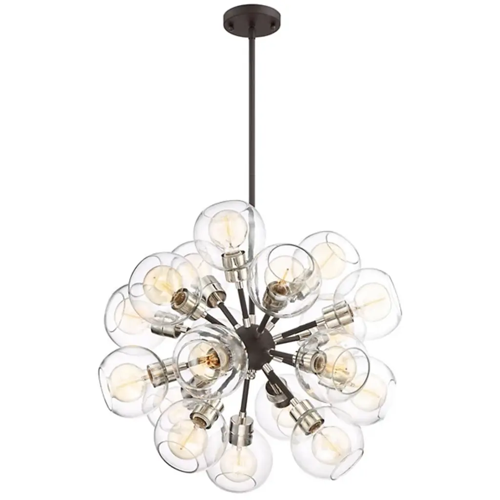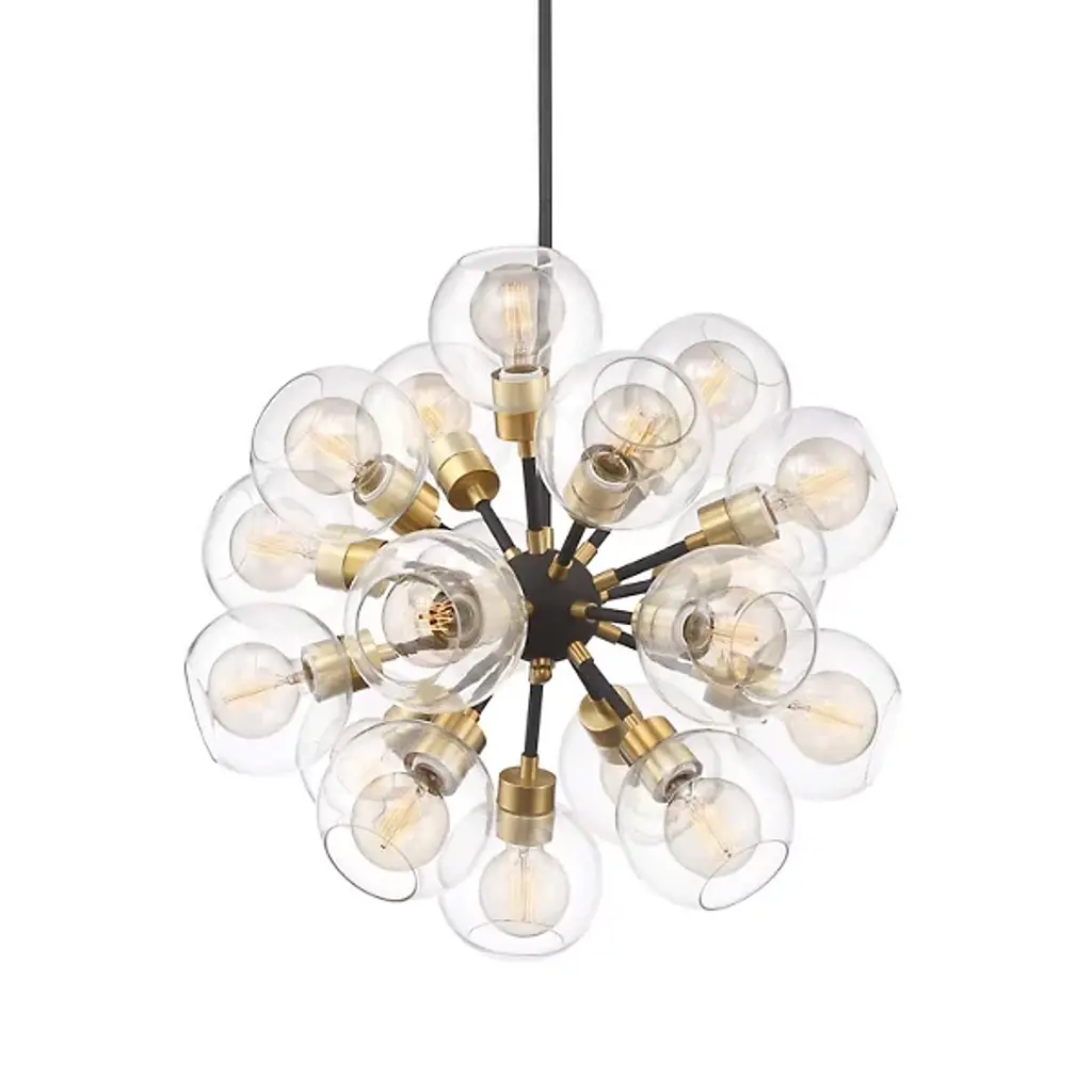 With delicate glass globes extending from arms of brushed brass, the Pierre Chandelier is reminiscent of 1940s industrialism. Glass bulbs emit a warm, welcoming light, while vertical threaded rods and metal tubing add just the right amount of urban flair. Display as a solo piece or in multiples to bring your lighting design vision to life.