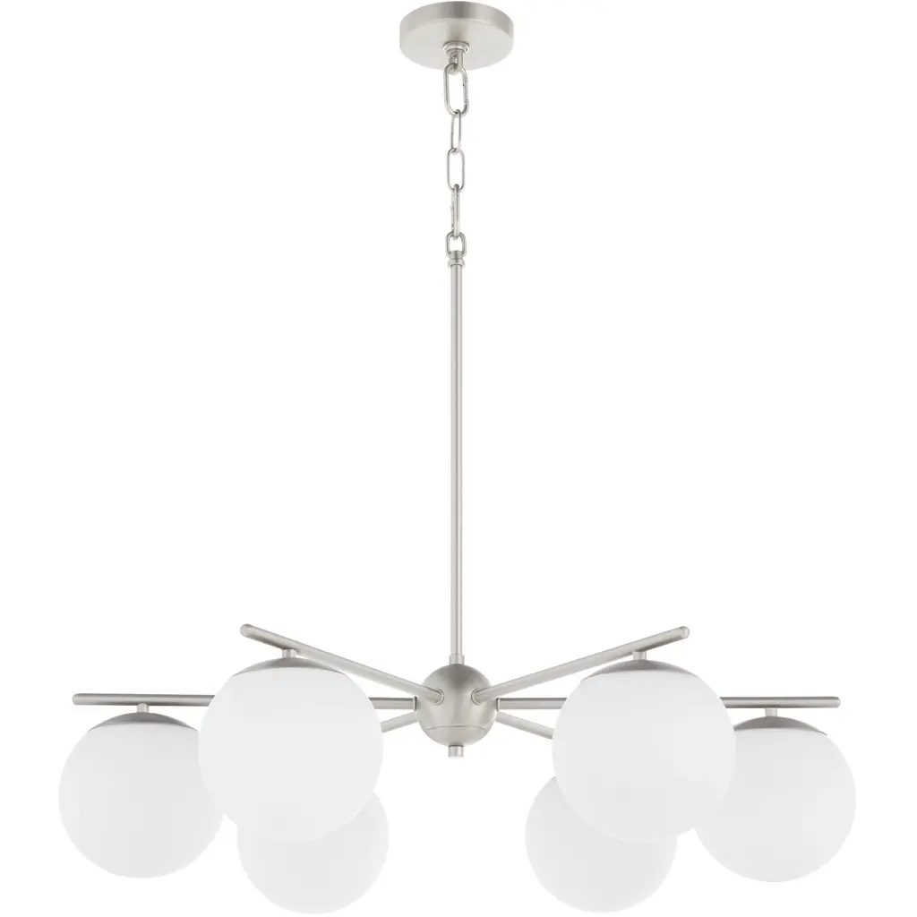 The Pim(TM) 4in. 7 light round chandelier features a nostalgic mid century modern design in Polished Nickel and rounded shaped satin etched cased opal glass. A perfect addition in several aesthetic environments including contemporary and transitional.