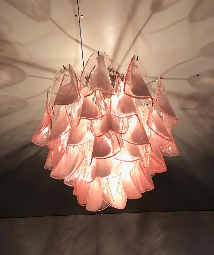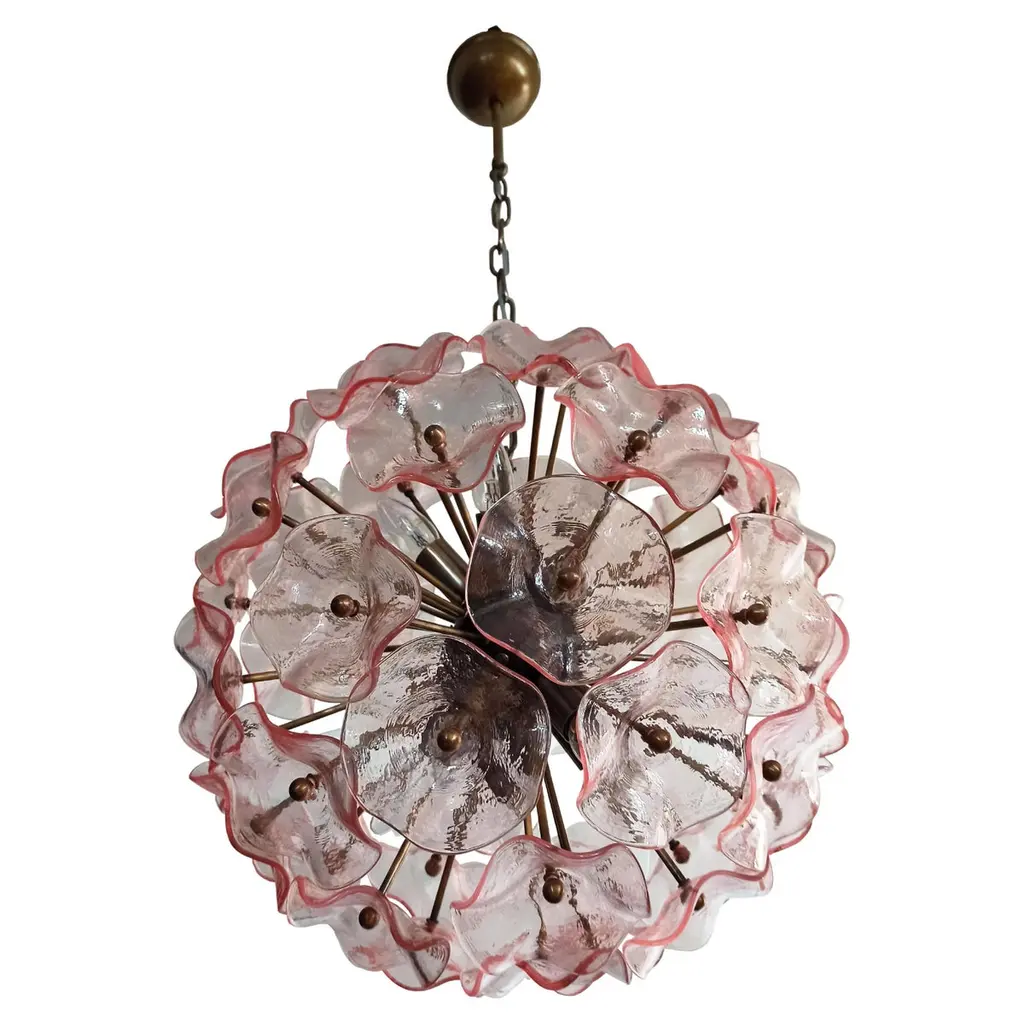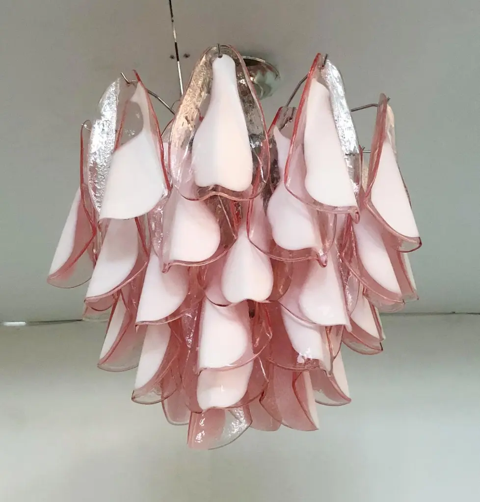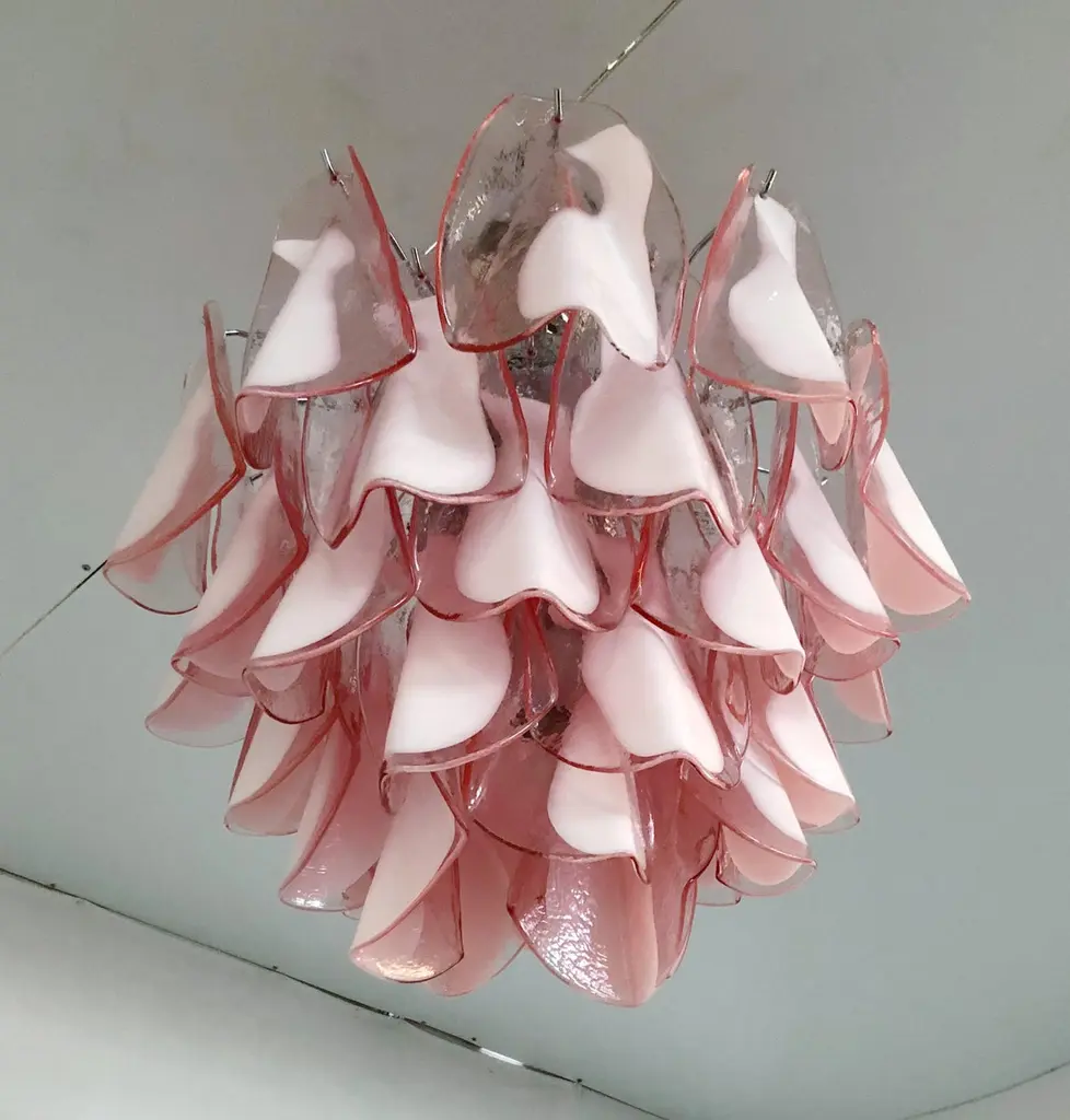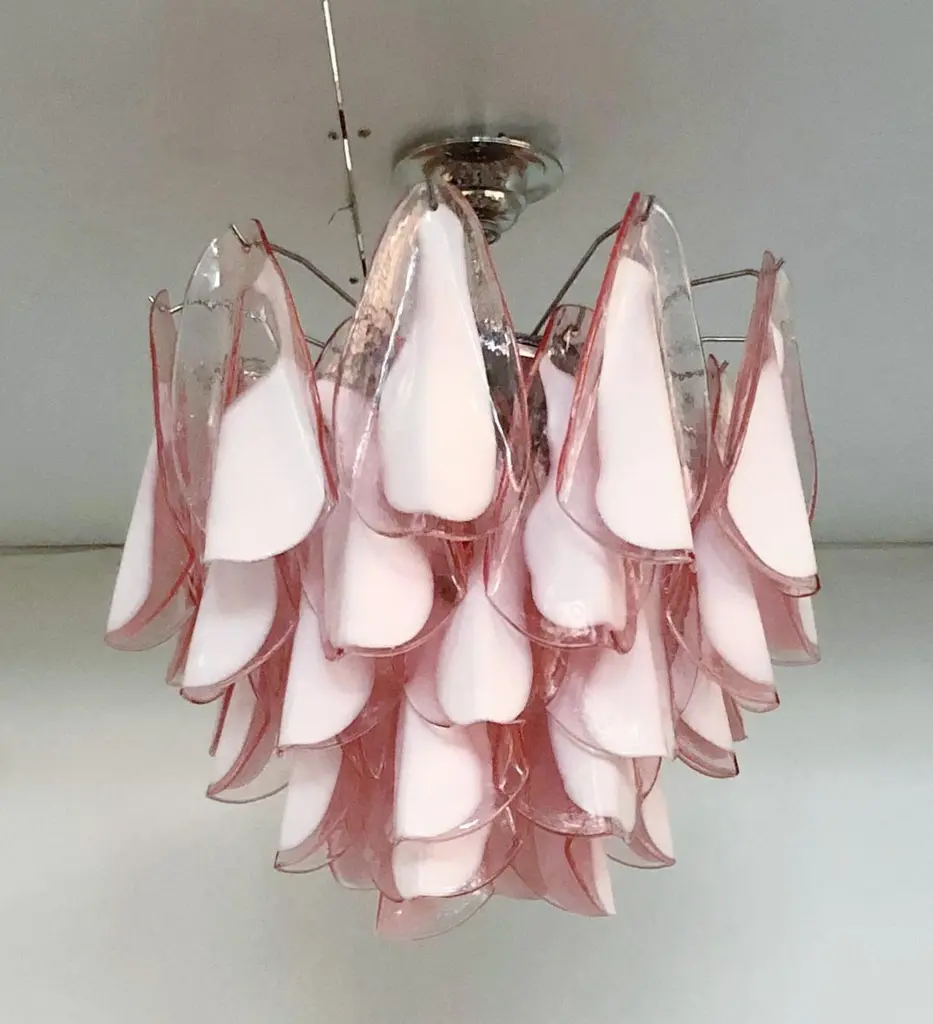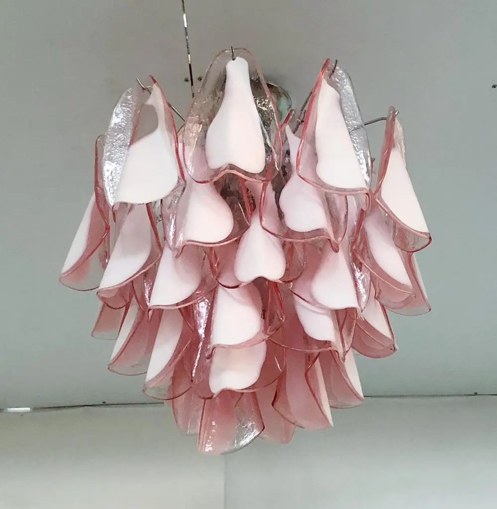 Italian chandelier shown with pink and milky white Murano glass petals, mounted on nickel finish frame / Designed by Fabio Bergomi for Fabio Ltd, inspired by Vistosi / Made in Italy5 lights / E26 or E27 type / max 60W eachMeasures: Diameter: 23.5 inches / Height: 18 inches plus chain and canopyOrder only / This item ships from Italy.