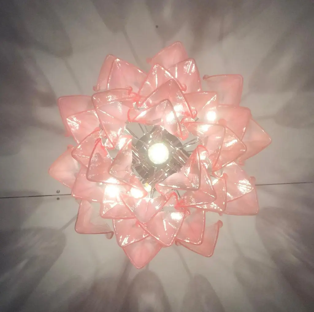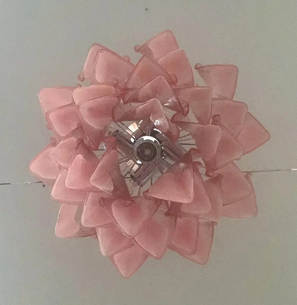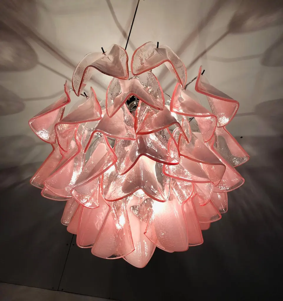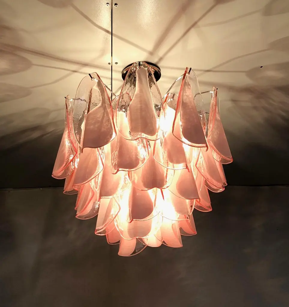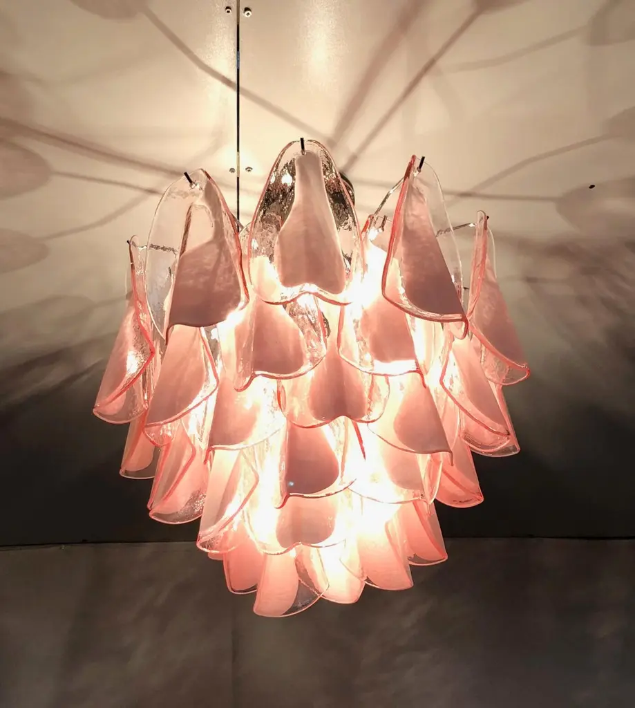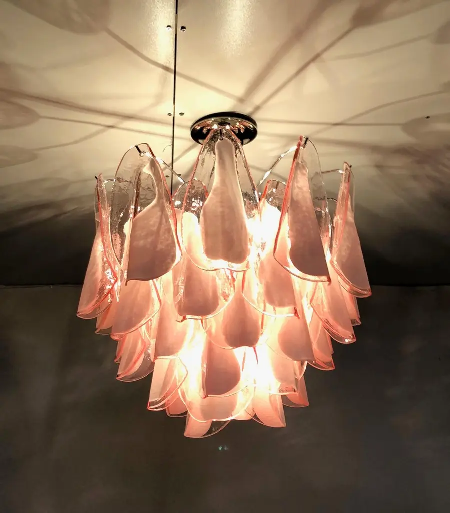 Italian chandelier shown with pink and milky white Murano glass petals, mounted on nickel finish frame / Designed by Fabio Bergomi for Fabio Ltd, inspired by Vistosi / Made in Italy5 lights / E26 or E27 type / max 60W eachMeasures: Diameter: 23.5 inches / Height: 18 inches plus chain and canopyOrder only / This item ships from Italy.