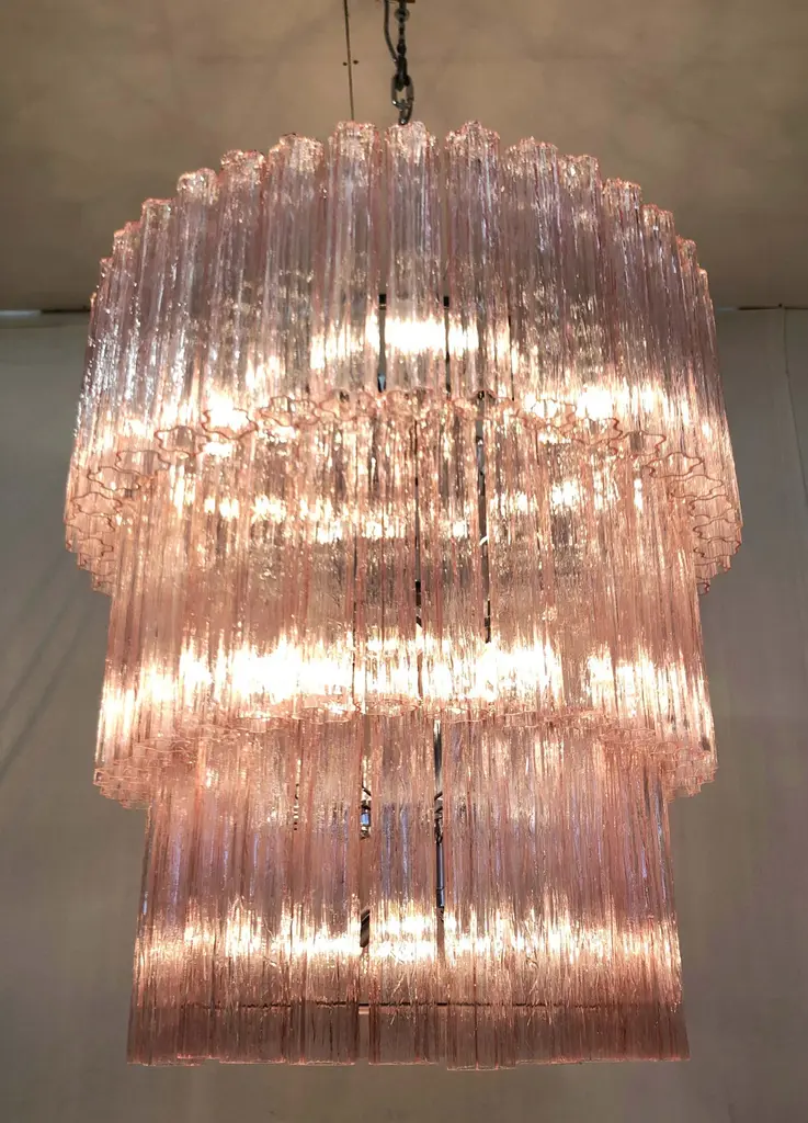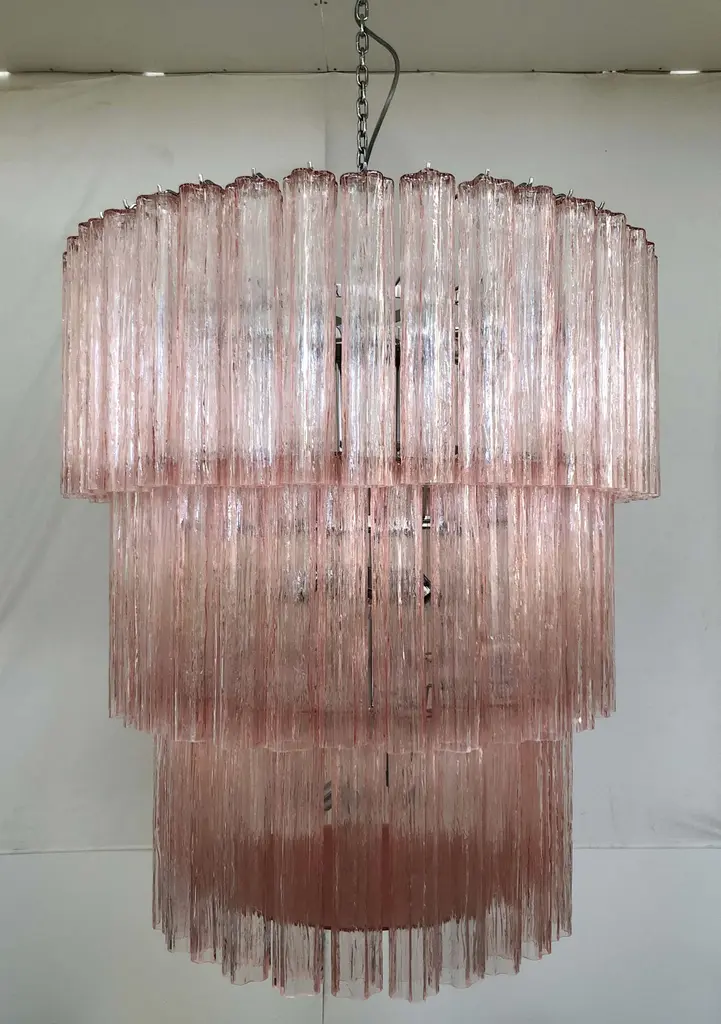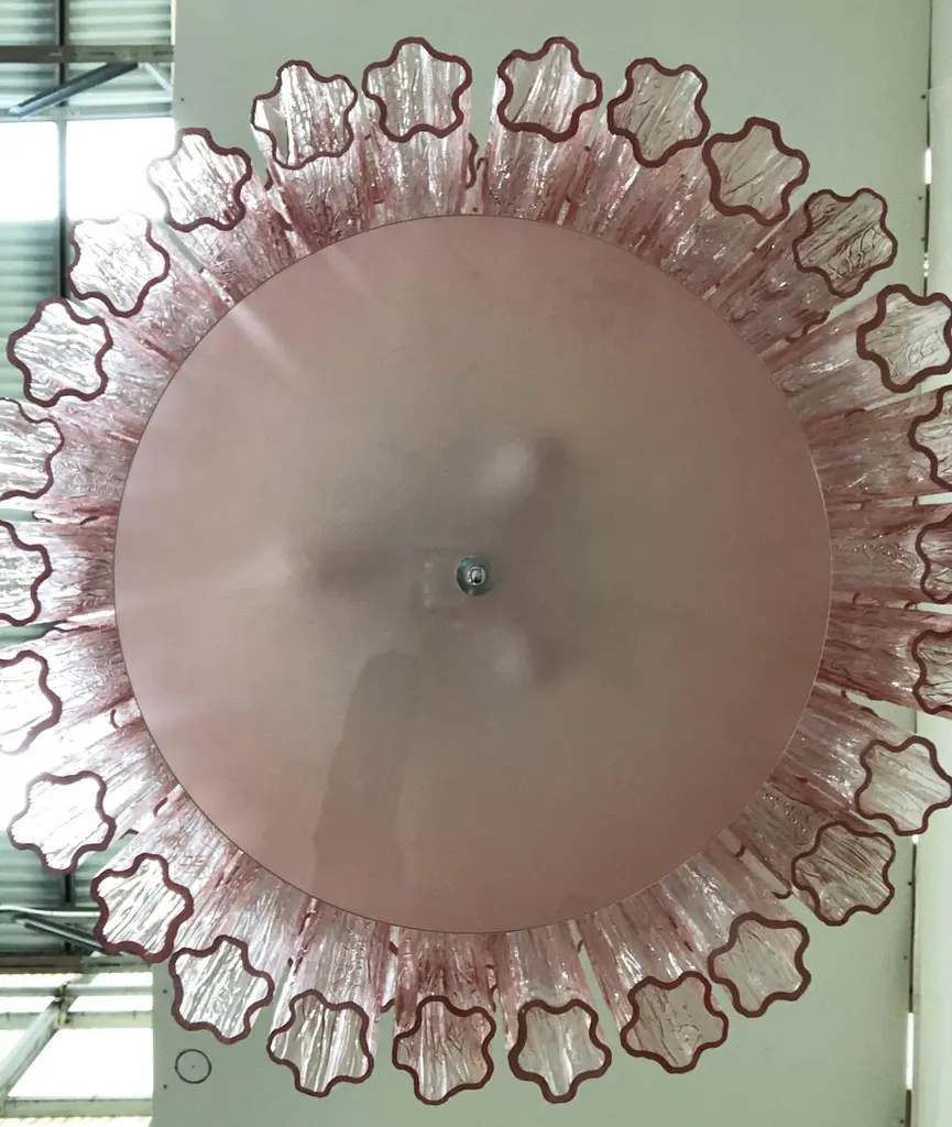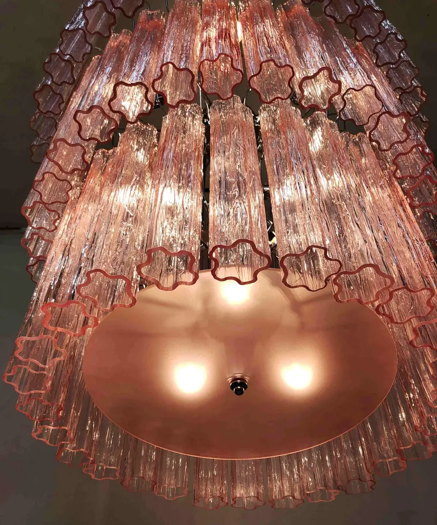 Italian chandelier shown in pink hand blown Murano Tronchi glasses arranged in 3 tiers, mounted on polished chrome finish metal frame with a frosted pink glass diffuser at the bottom / Designed by Fabio Bergomi for Fabio Ltd / Made in Italy15 lights / E26 or E27 type / max 60W each Measures: diameter 42 inches, height 44 inches plus chain canopy Order only / This item ships from Italy.