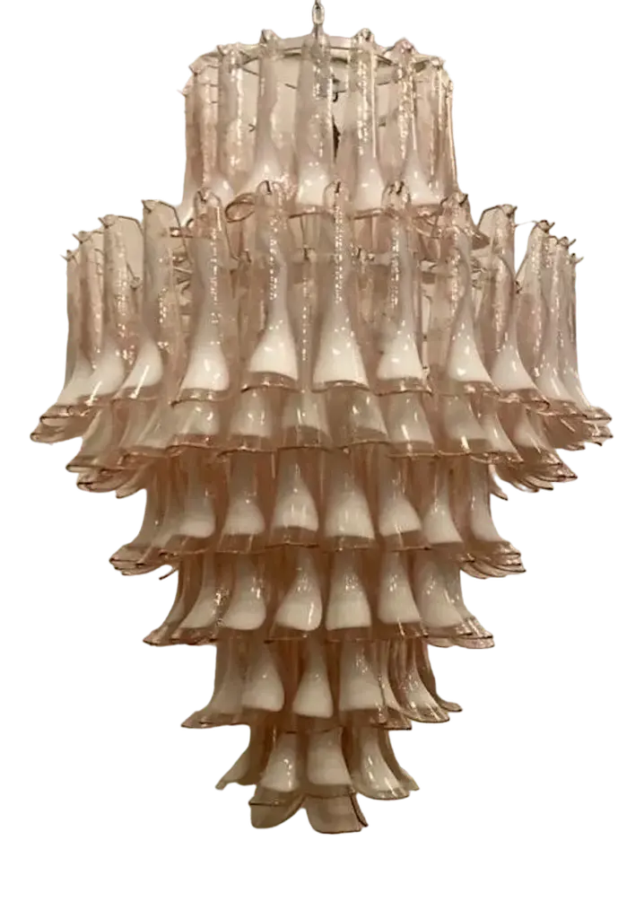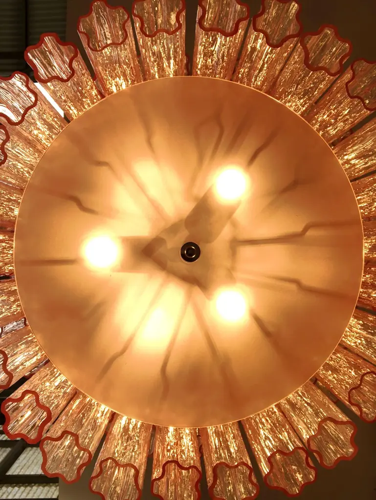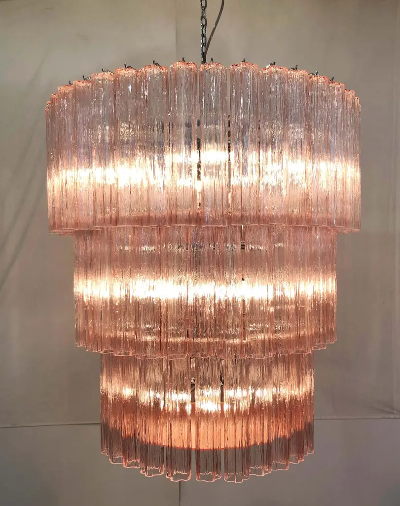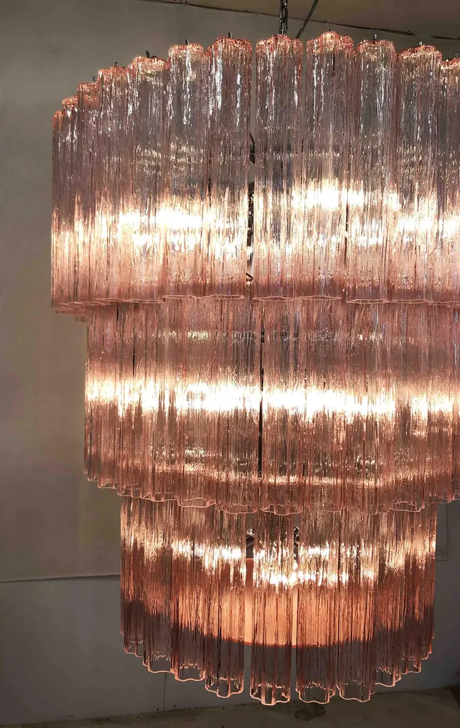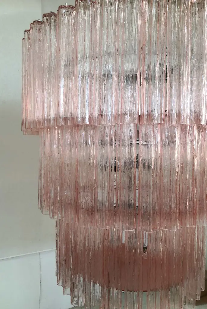 Italian chandelier shown in pink hand blown Murano Tronchi glasses arranged in 3 tiers, mounted on polished chrome finish metal frame with a frosted pink glass diffuser at the bottom / Designed by Fabio Bergomi for Fabio Ltd / Made in Italy15 lights / E26 or E27 type / max 60W each Measures: diameter 42 inches, height 44 inches plus chain canopy Order only / This item ships from Italy.