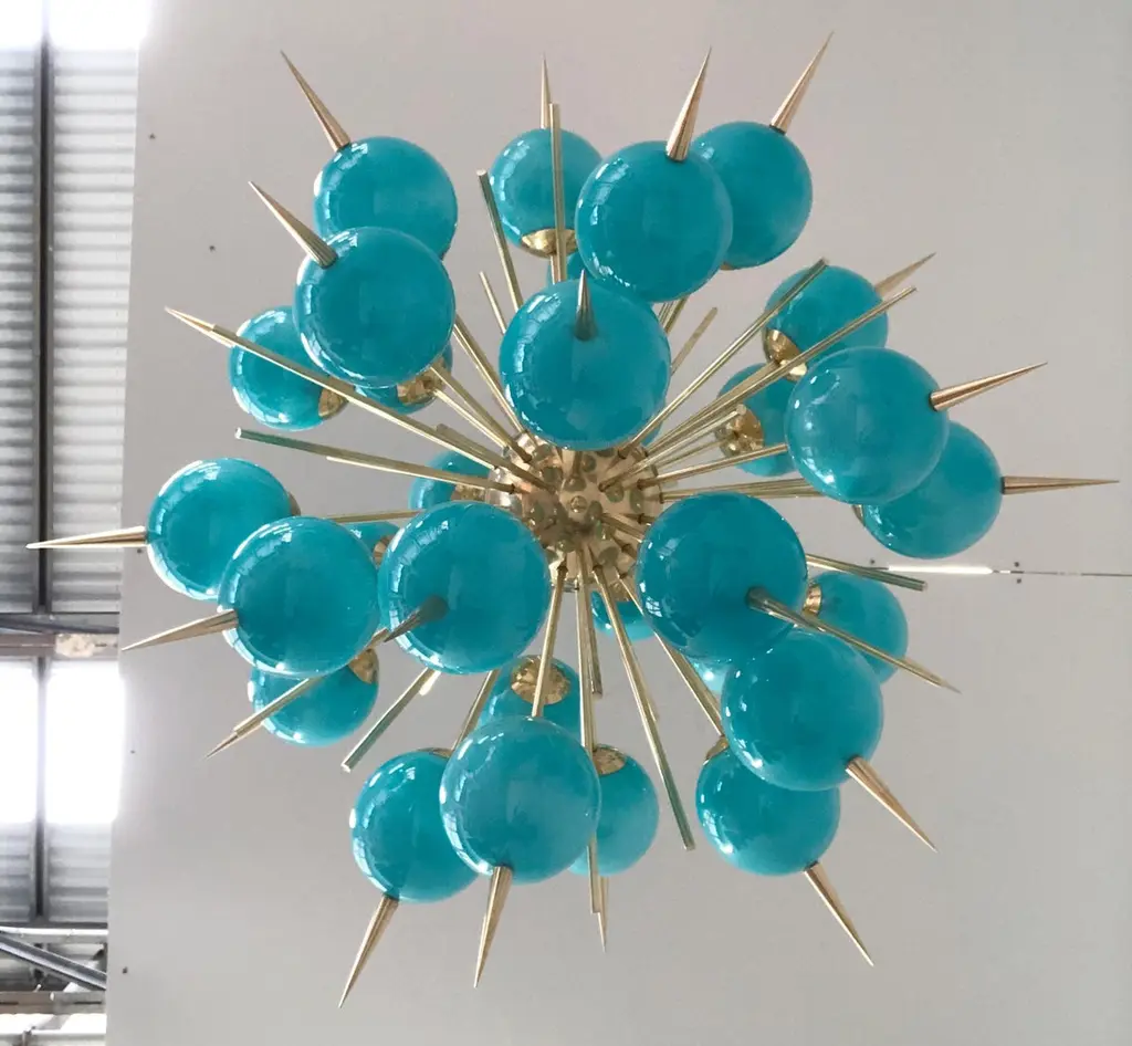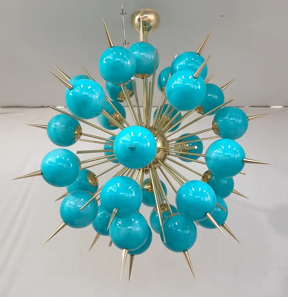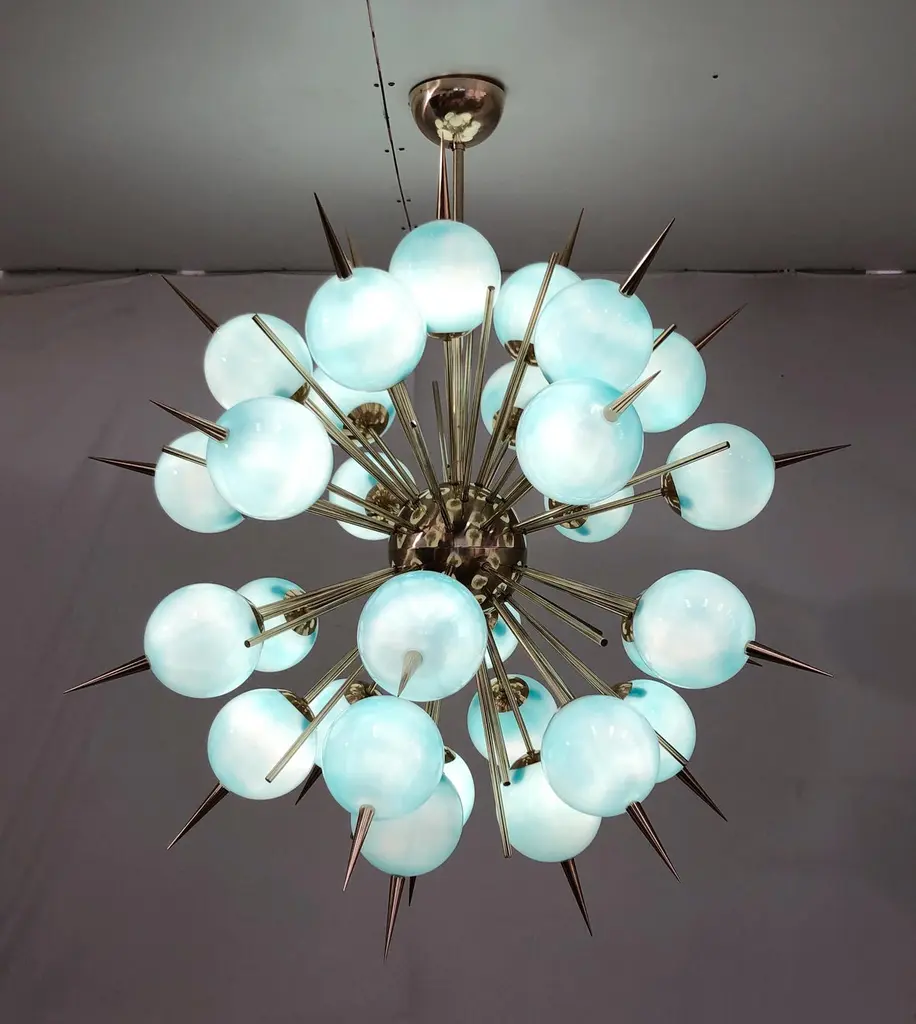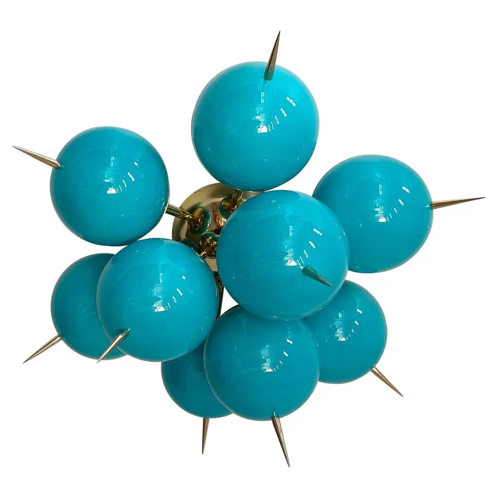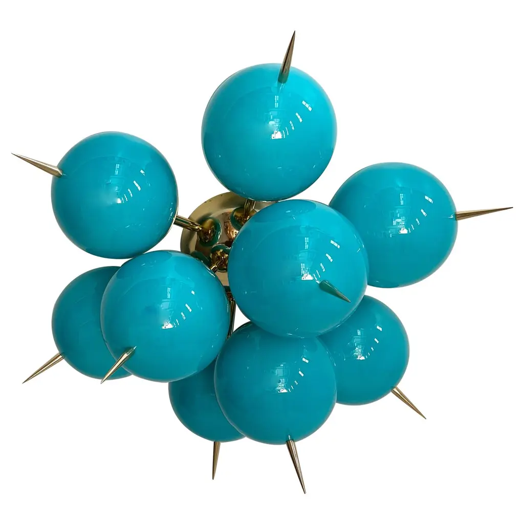 Italian Sputnik chandelier with 30 Tiffany blue Murano glass globes and solid brass spikes mounted on brass frame / Designed by Fabio Bergomi for Fabio Ltd / Made in Italy30 lights / E12 or E14 type / max 40W eachMeasures: Diameter 47 inches / Height 54 inches including rod and canopyOrder only / This item ships from Italy.ORDER REFERENCE # : FABIOLTD PINOCCHIO 30
