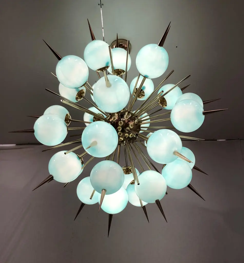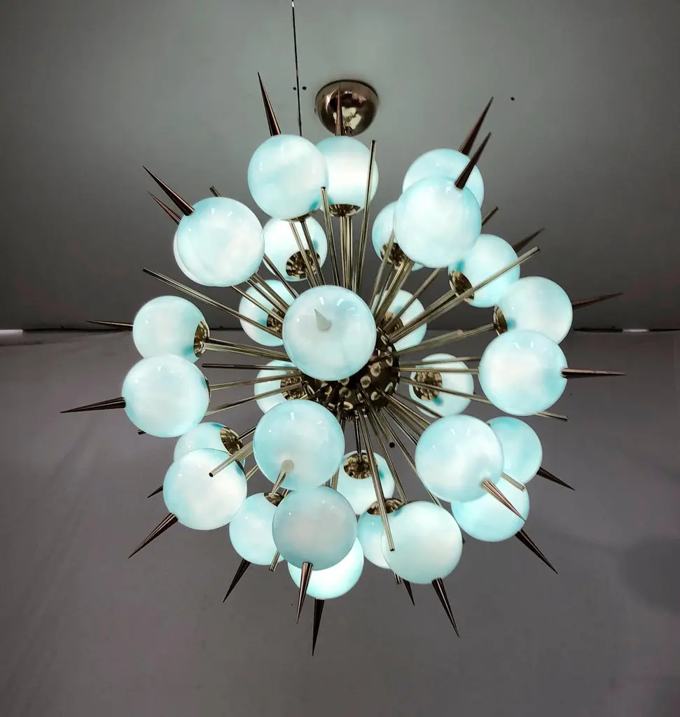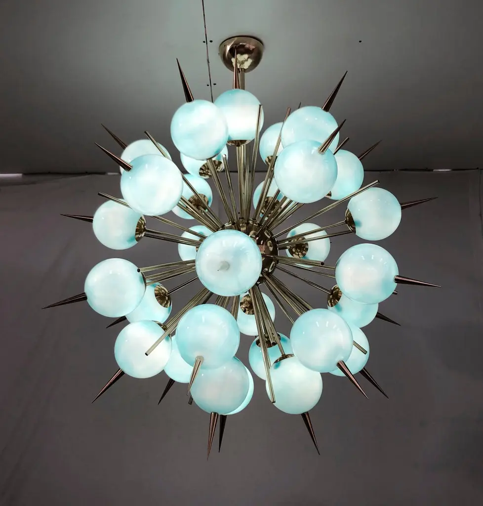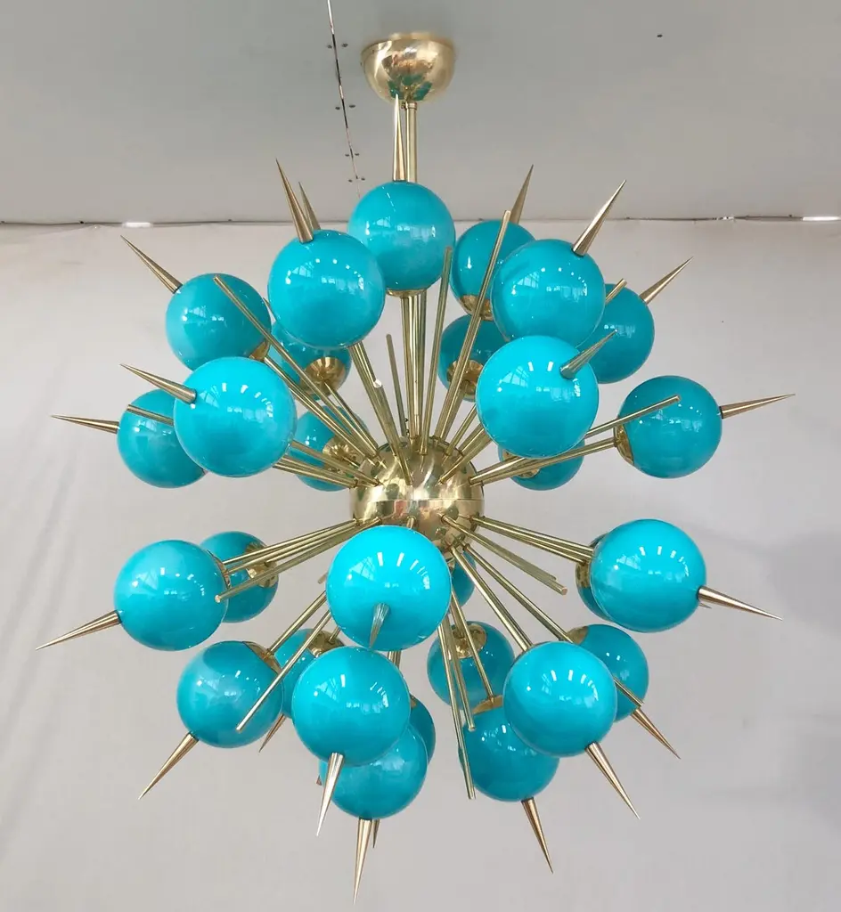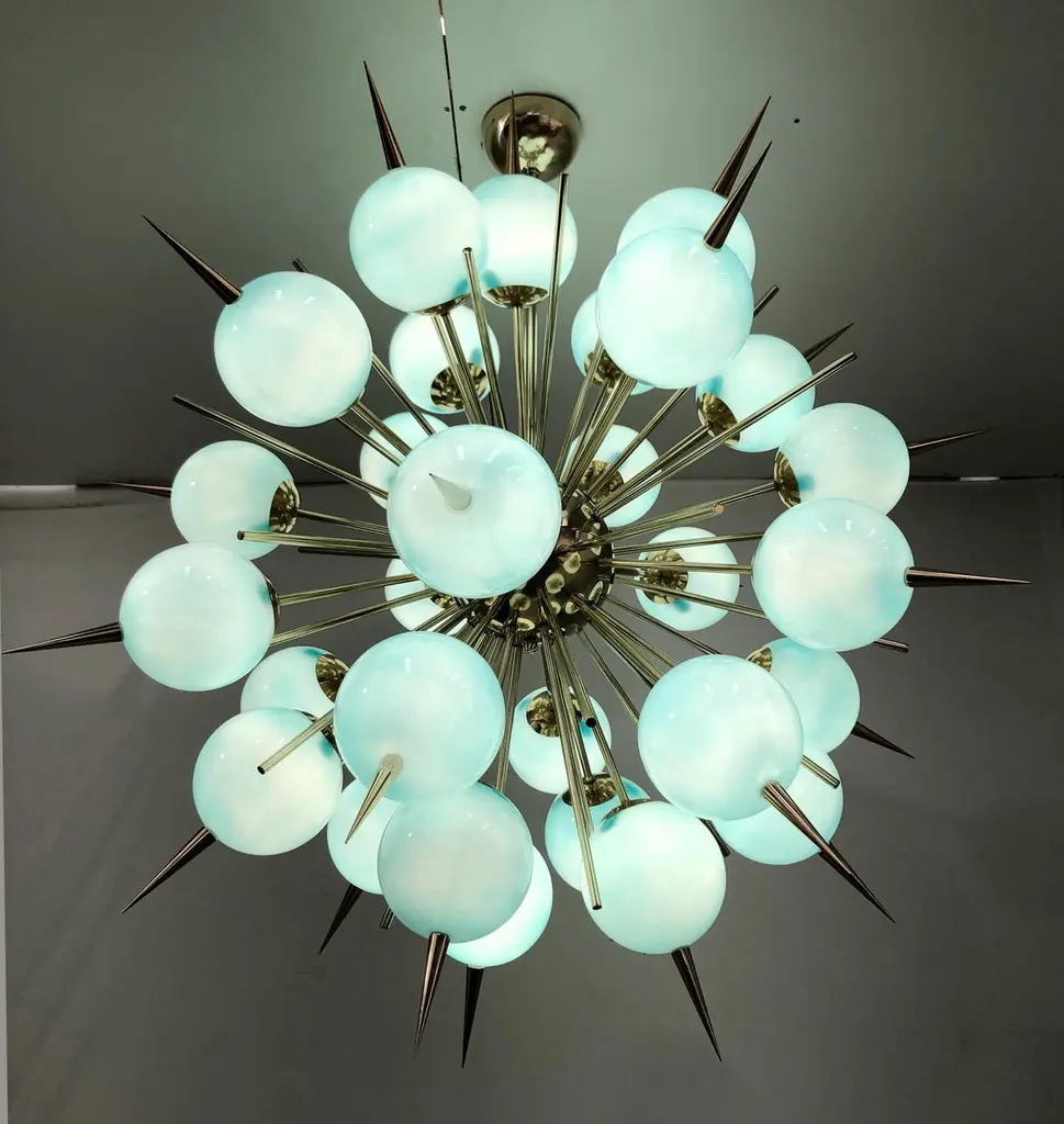 Italian Sputnik chandelier with 30 Tiffany blue Murano glass globes and solid brass spikes mounted on brass frame / Designed by Fabio Bergomi for Fabio Ltd / Made in Italy30 lights / E12 or E14 type / max 40W eachMeasures: Diameter 47 inches / Height 54 inches including rod and canopyOrder only / This item ships from Italy.ORDER REFERENCE # : FABIOLTD PINOCCHIO 30