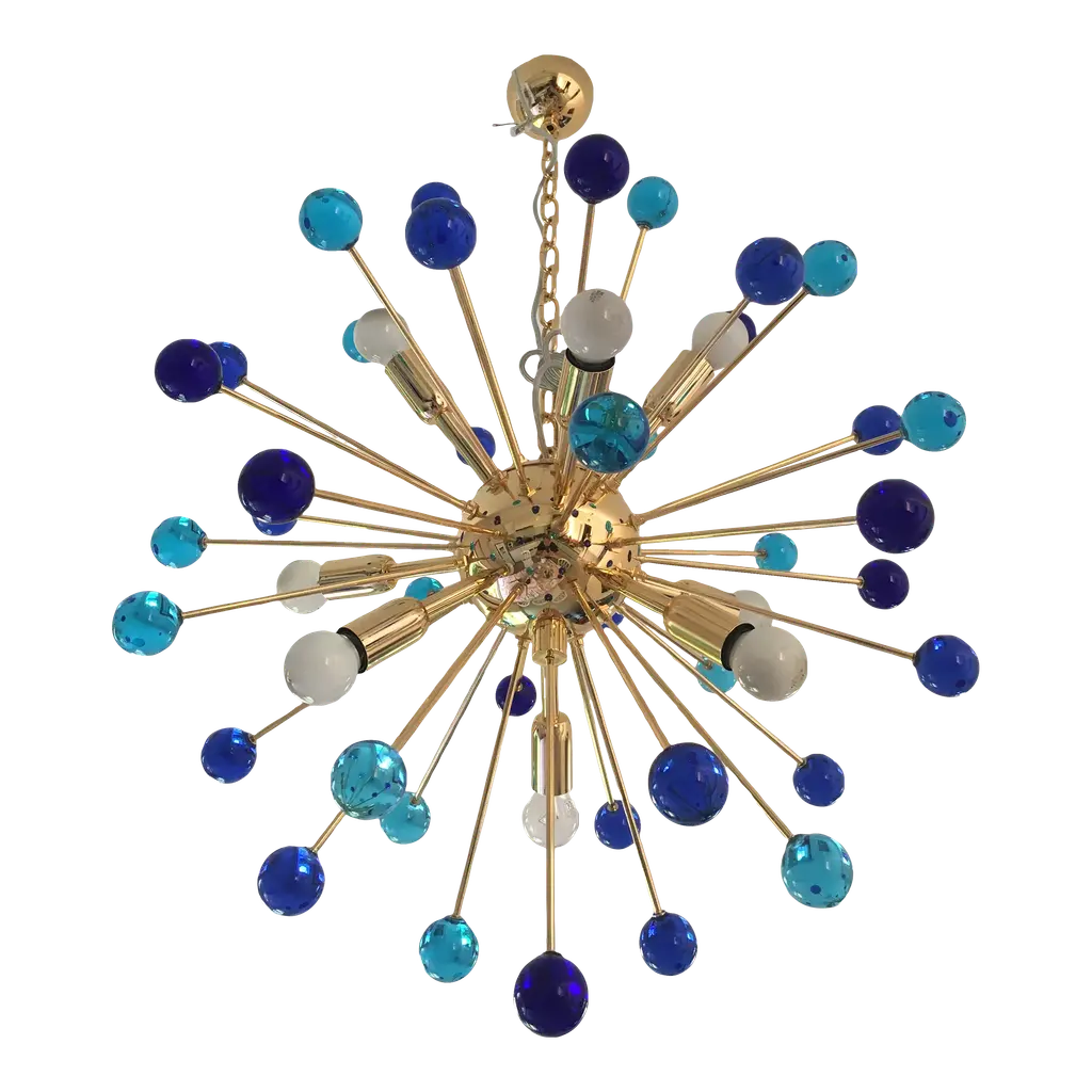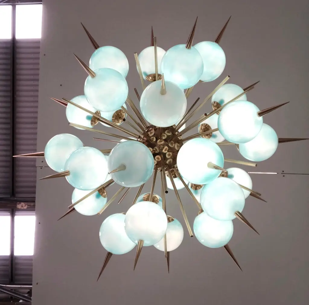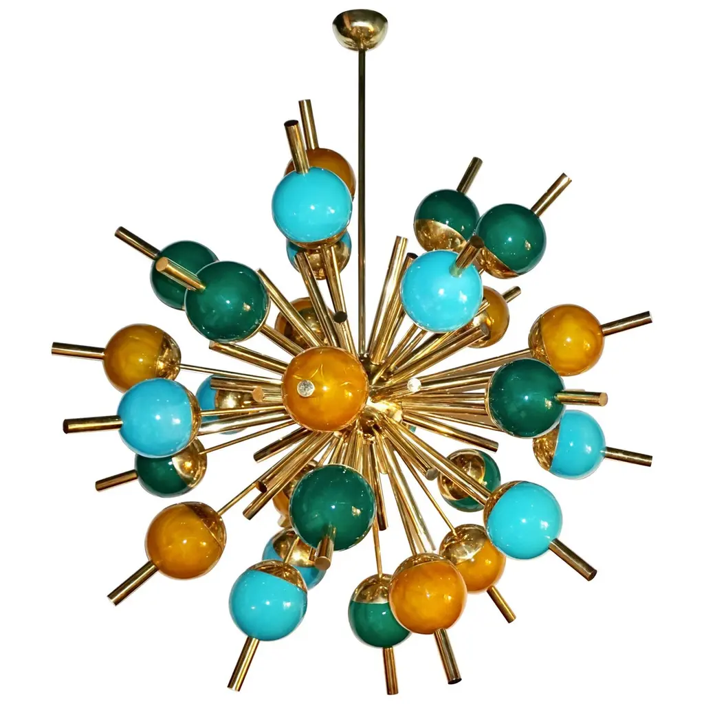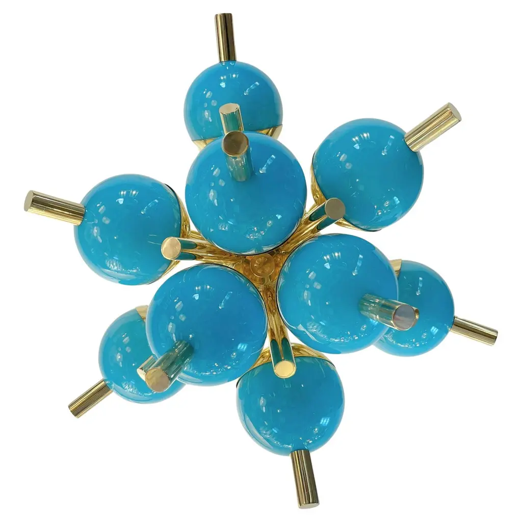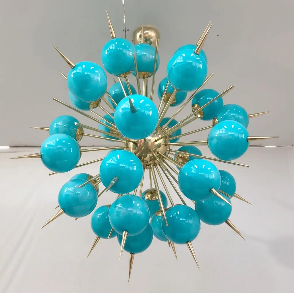 Italian Sputnik chandelier with 30 Tiffany blue Murano glass globes and solid brass spikes mounted on brass frame / Designed by Fabio Bergomi for Fabio Ltd / Made in Italy30 lights / E12 or E14 type / max 40W eachMeasures: Diameter 47 inches / Height 54 inches including rod and canopyOrder only / This item ships from Italy.ORDER REFERENCE # : FABIOLTD PINOCCHIO 30