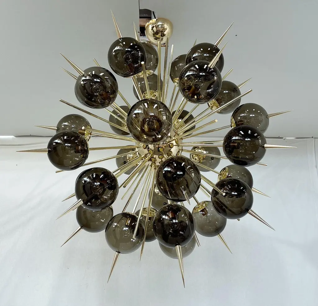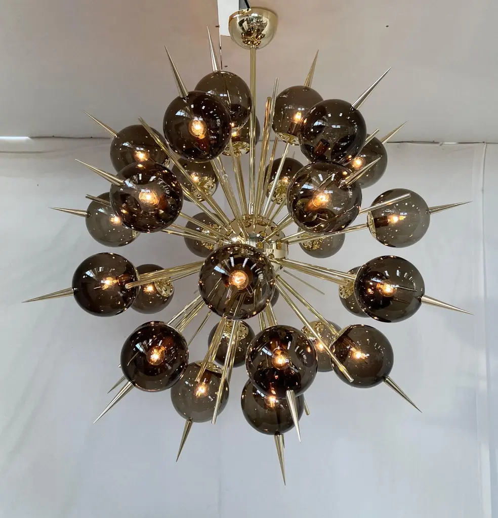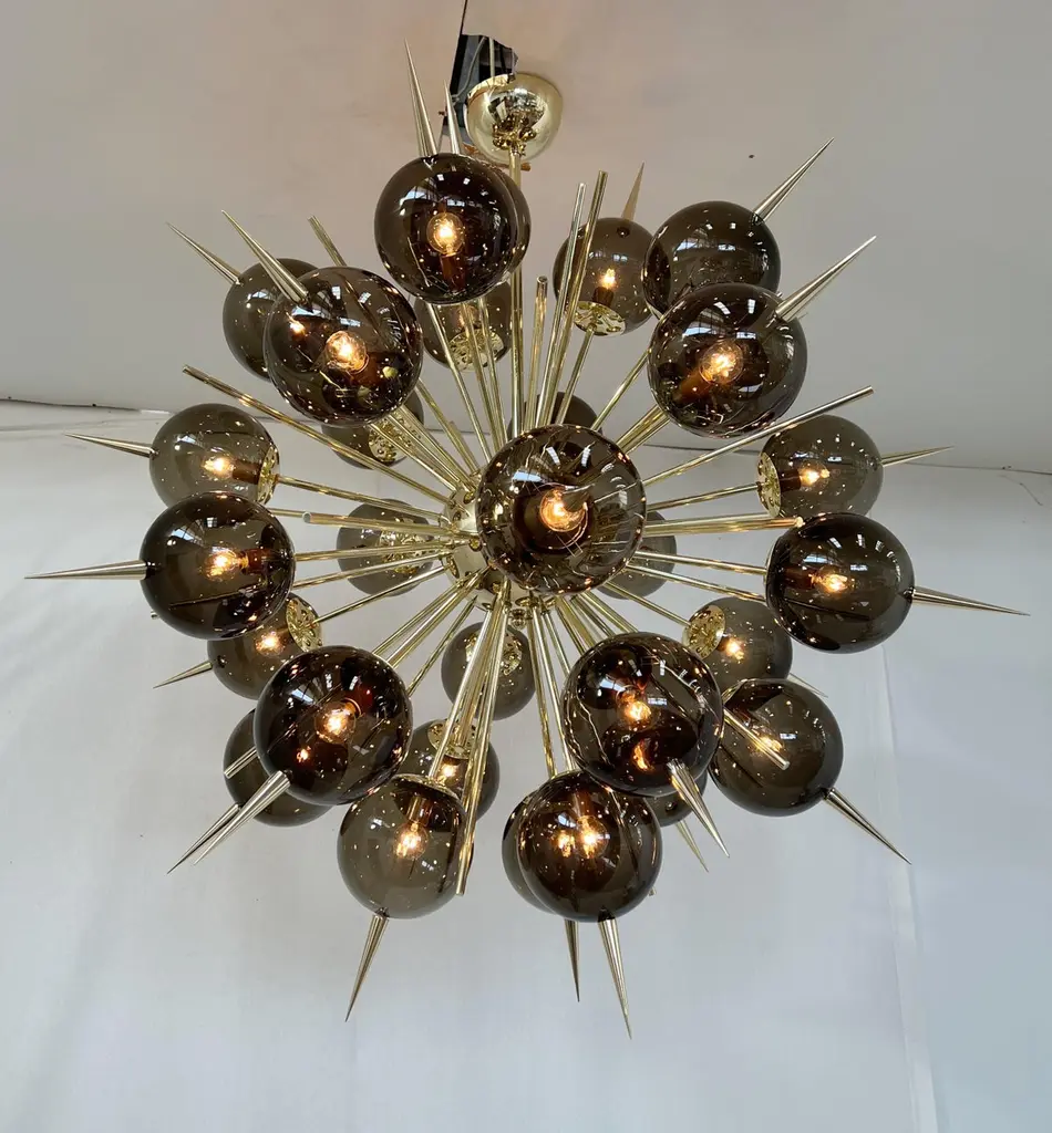 Italian Sputnik chandelier with 30 Murano glass globes and solid brass spikes mounted on brass frame / Designed by Fabio Bergomi for Fabio Ltd / Made in Italy30 lights / E12 or E14 type / max 40W eachMeasures: Diameter 47 inches / Height 54 inches including rod and canopyOrder only / This item ships from Italy.ORDER REFERENCE # : FABIOLTD PINOCCHIO 30